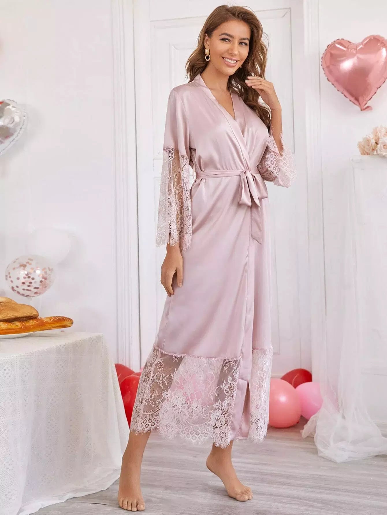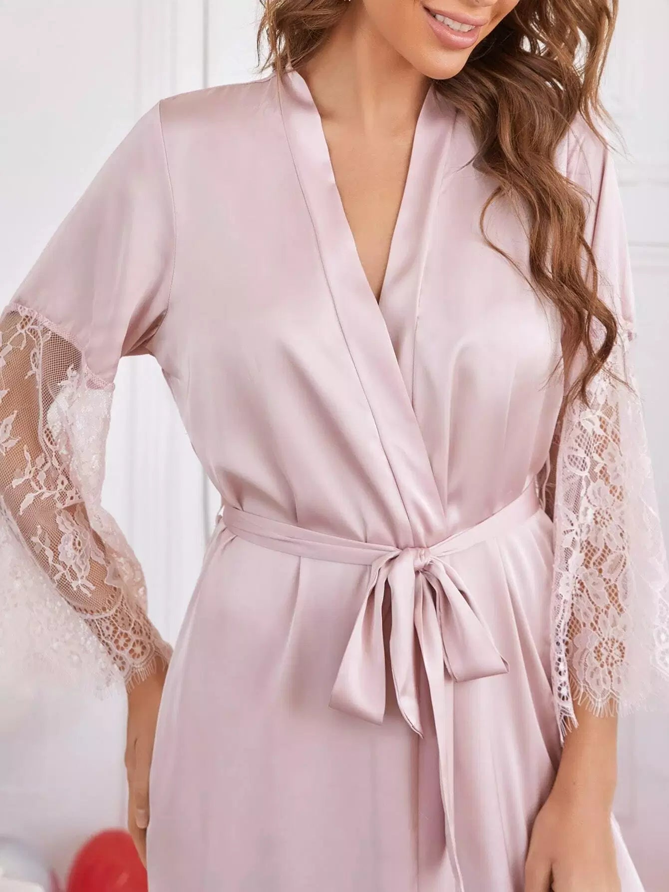 رداء ساتان بلوحة دانتيل متباينة بدون حزام