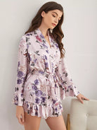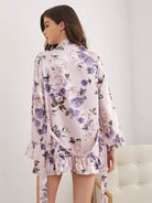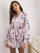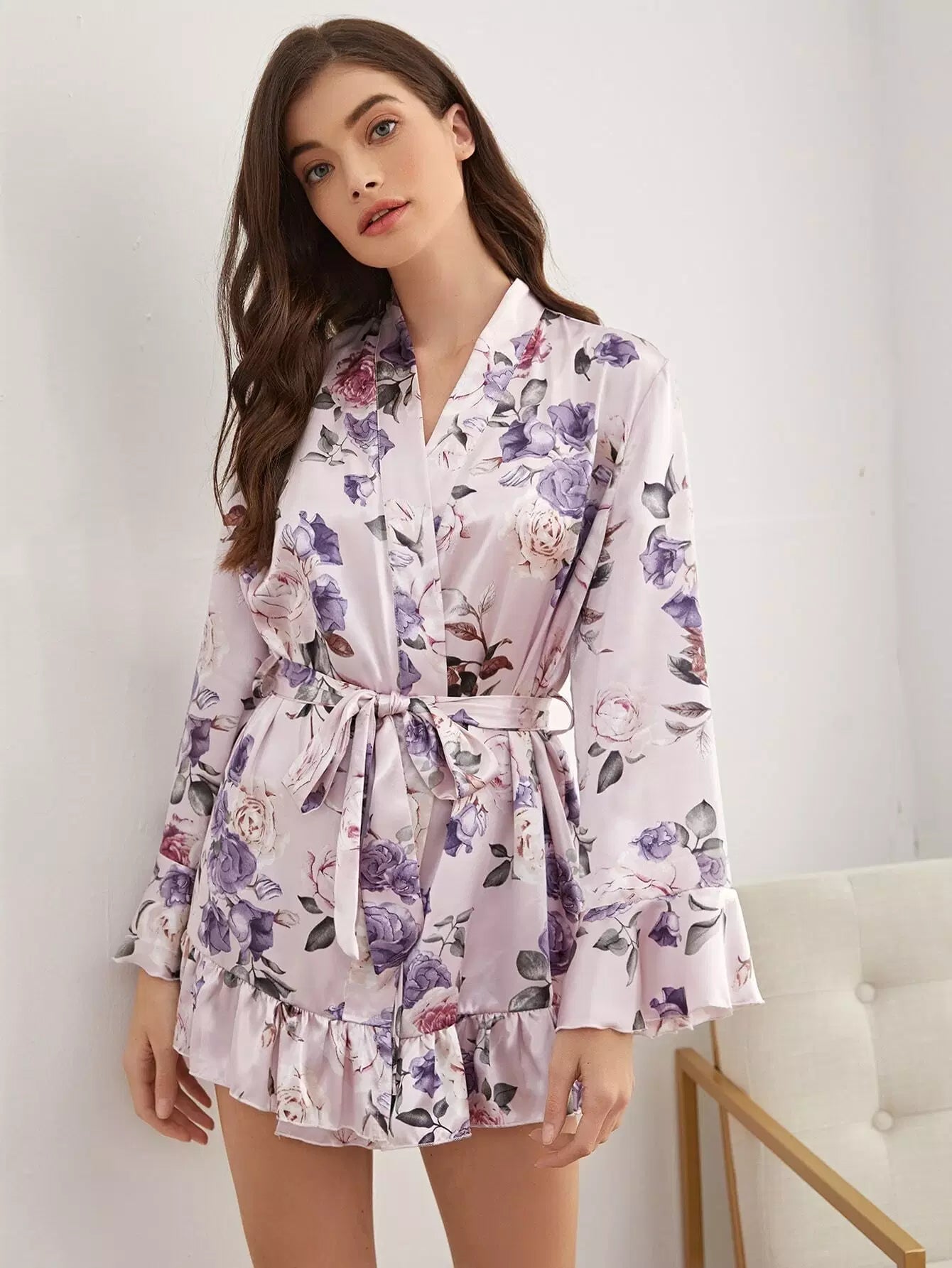 رداء من الساتان بحاشية مكشكشة بطباعة زهور بدون حزام