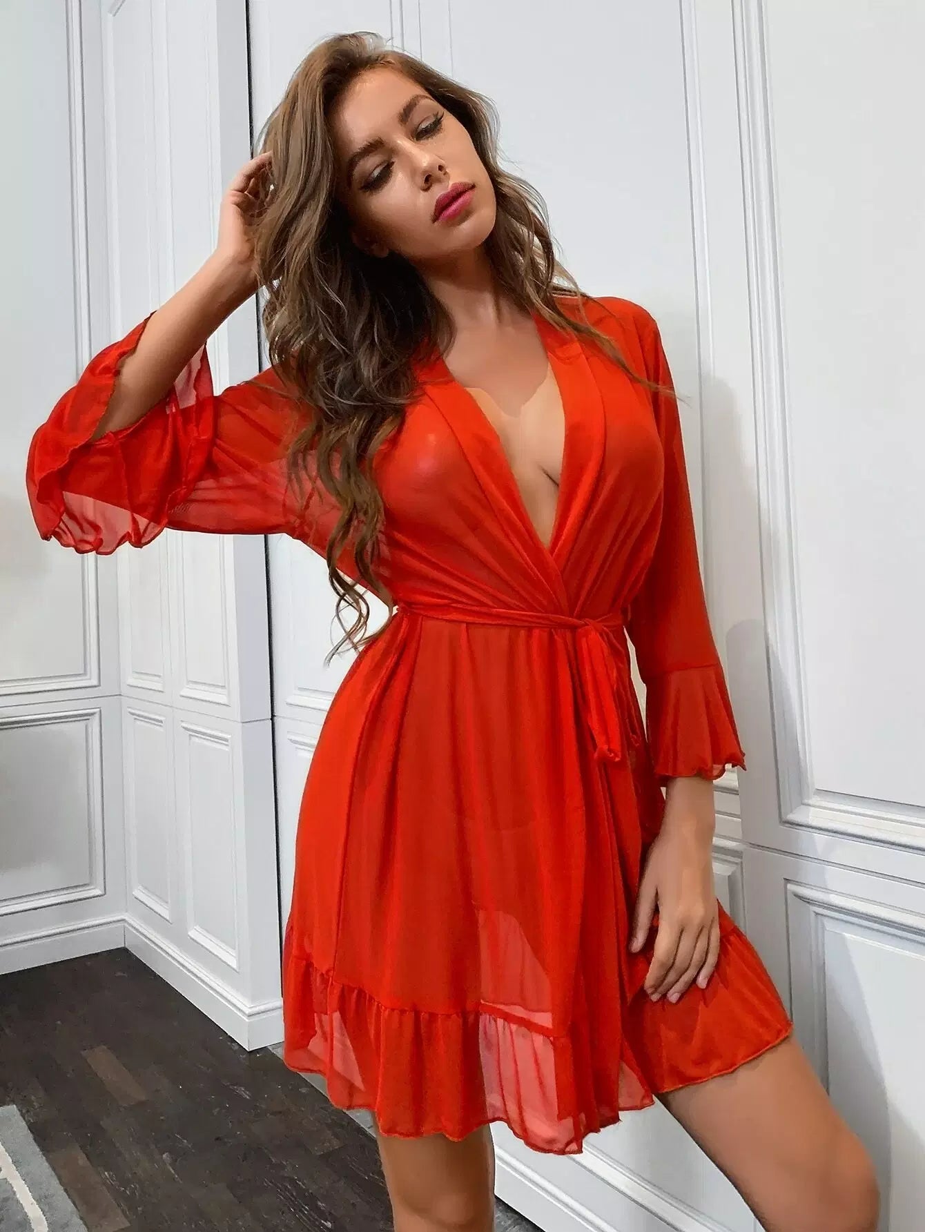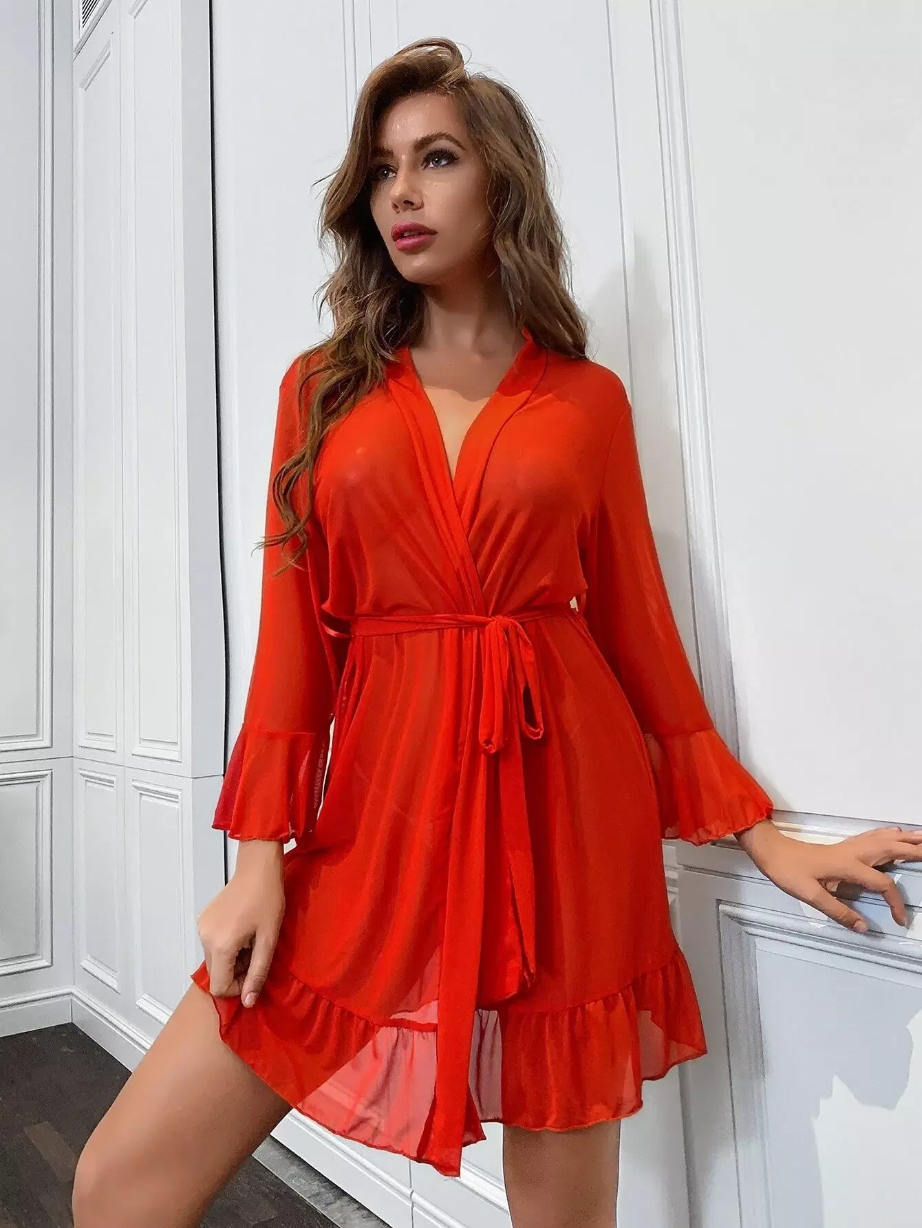 للنساء - رداء نوم شفاف بحاشية مكشكشة وأكمام واسعة وحزام