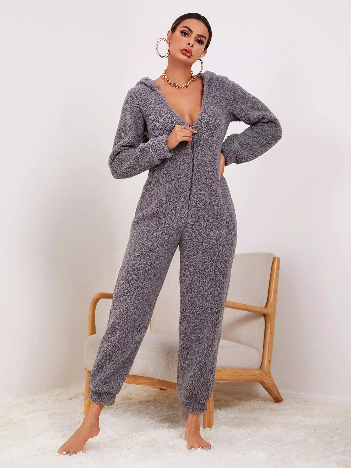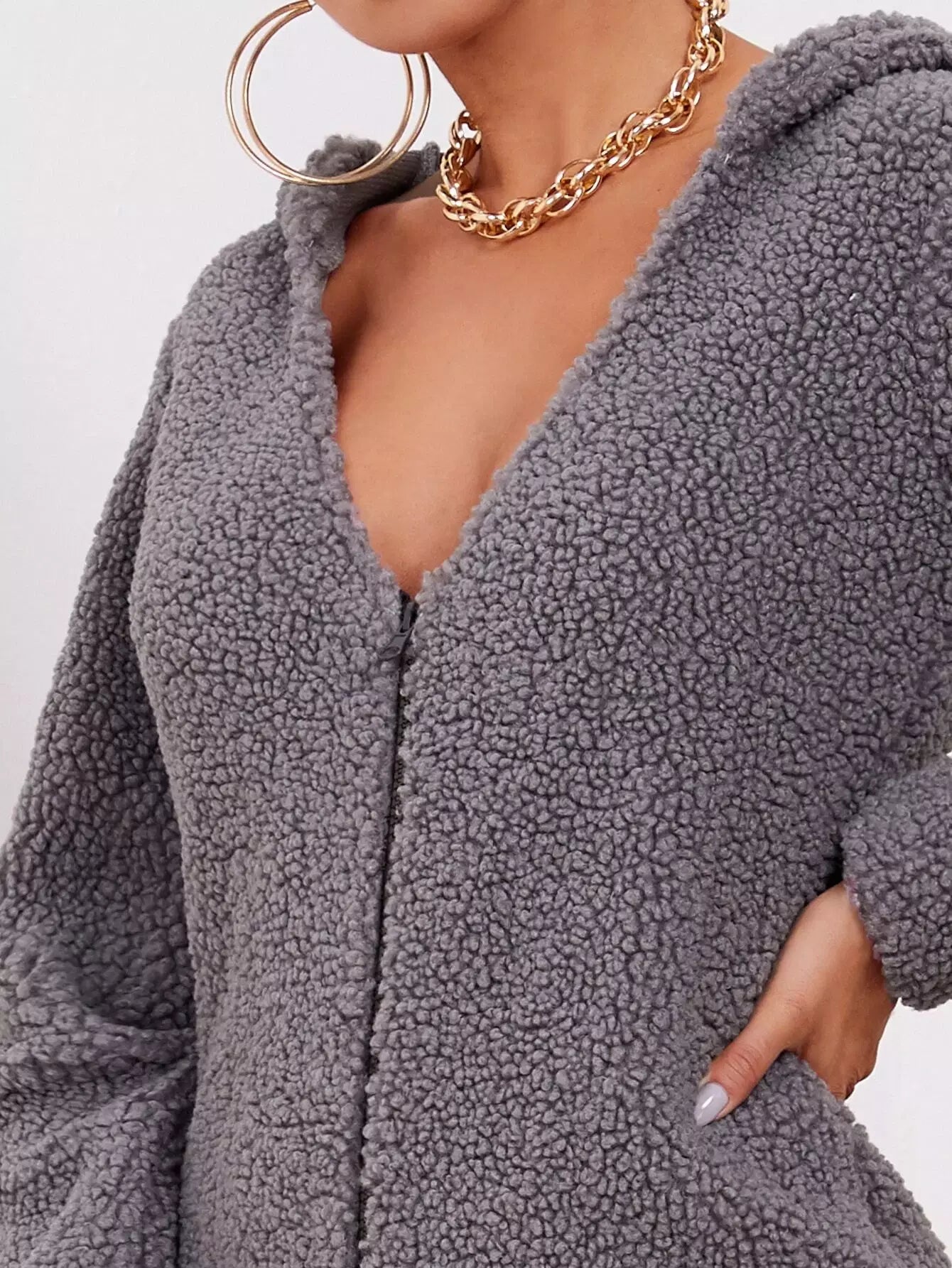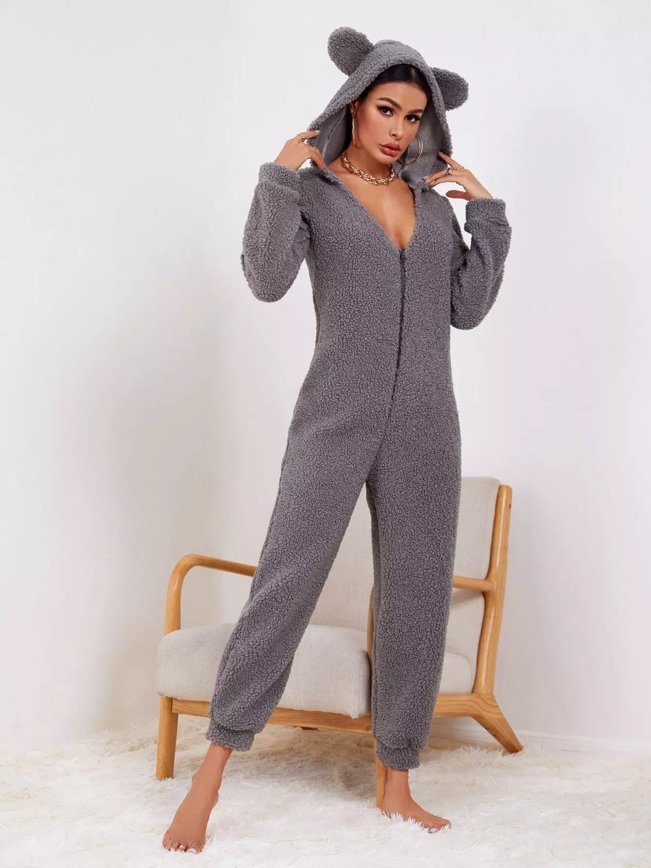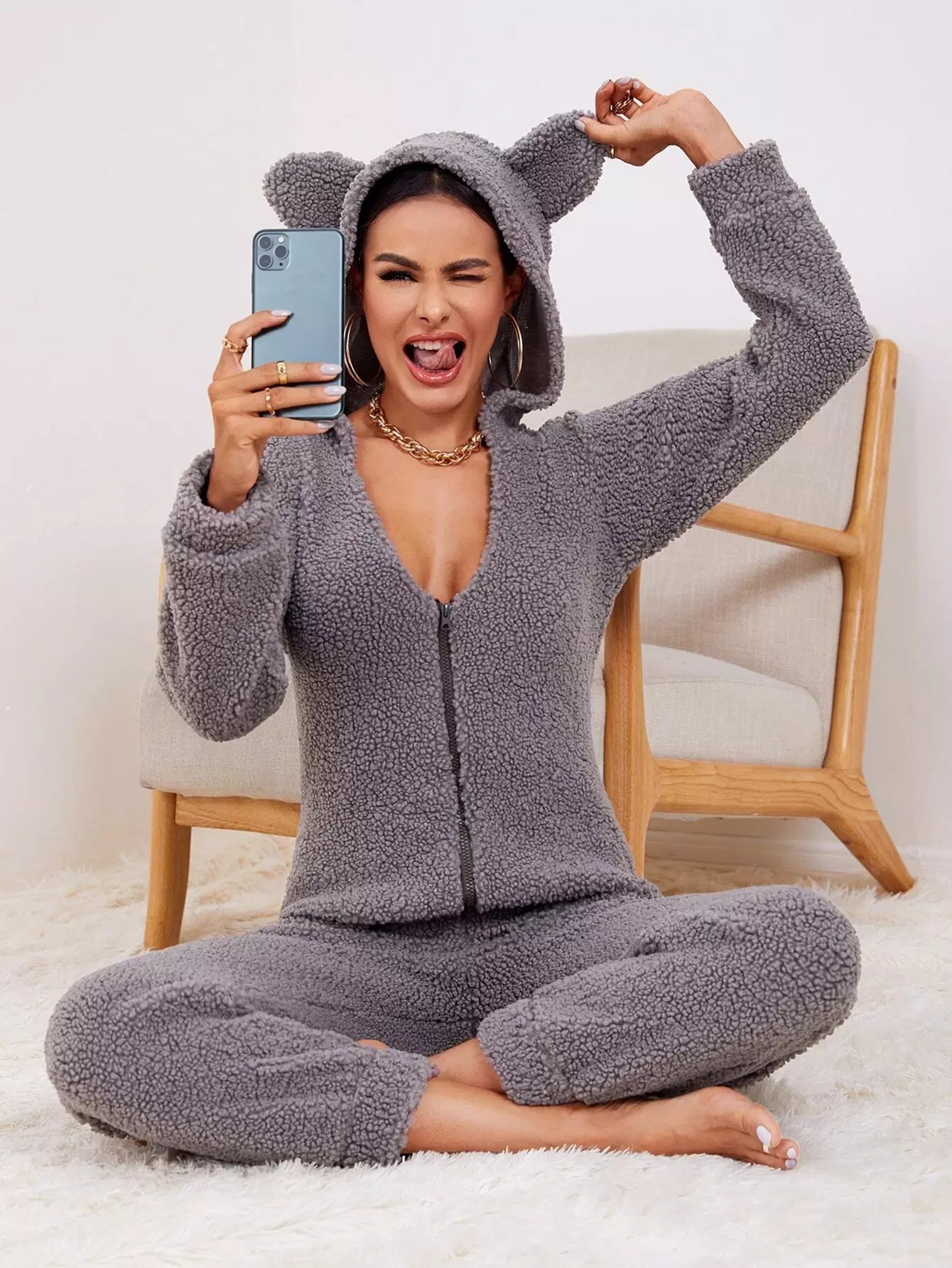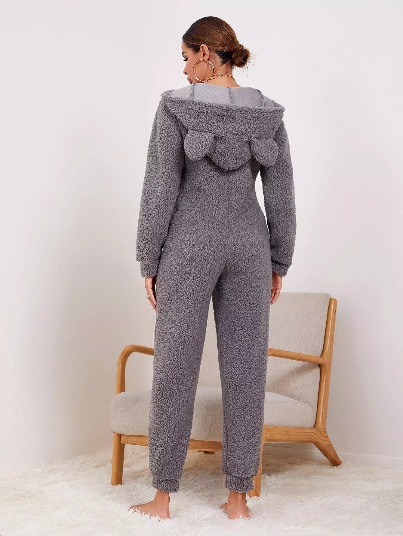 جاكيت بقلنسوة قطيفة ثلاثي الأبعاد بأذنين بسحاب من الأمام