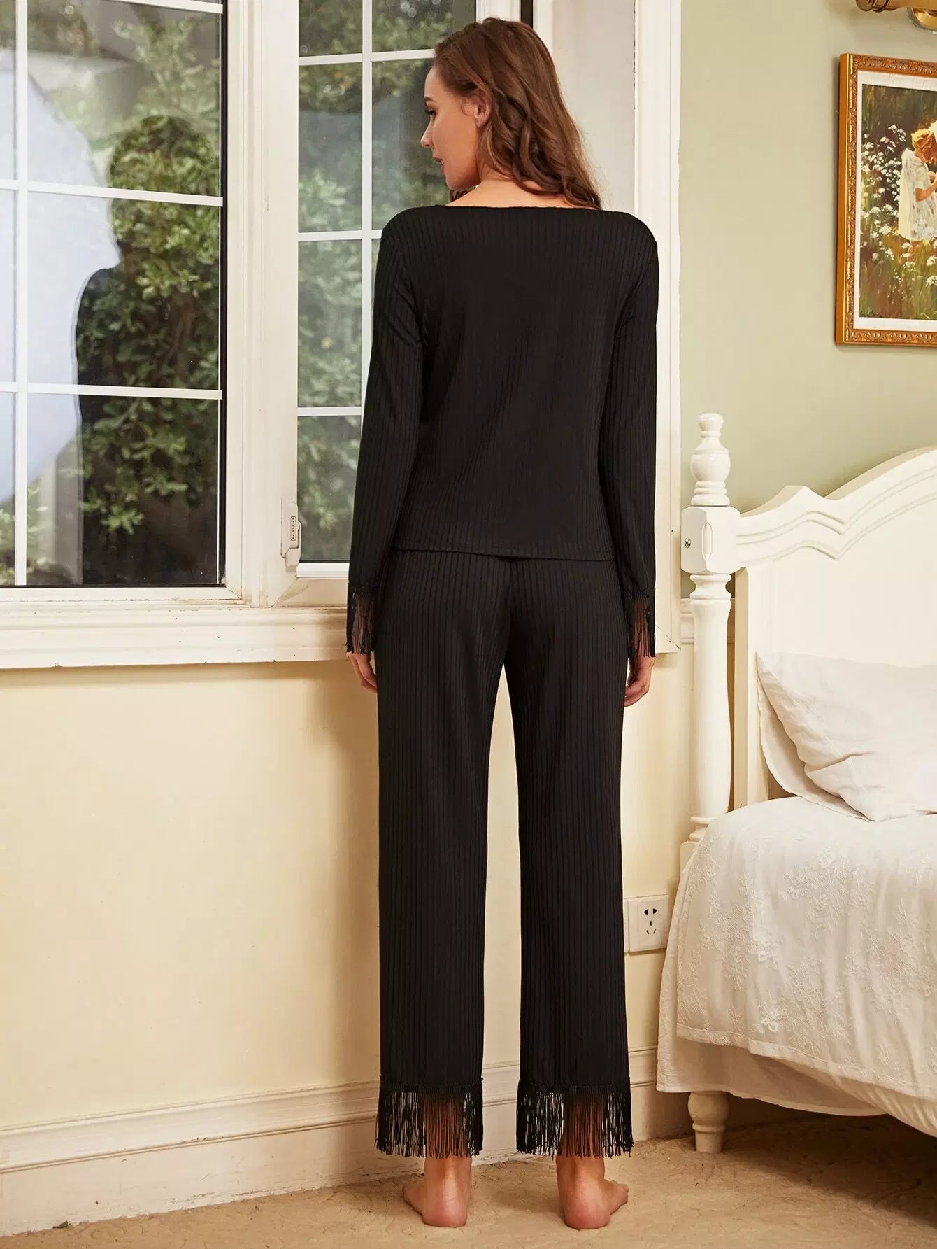 طقم تي شيرت محبوك بأزرار أمامية مضلعة وحافة بنطلون بحواف مهدبة طقم صالة