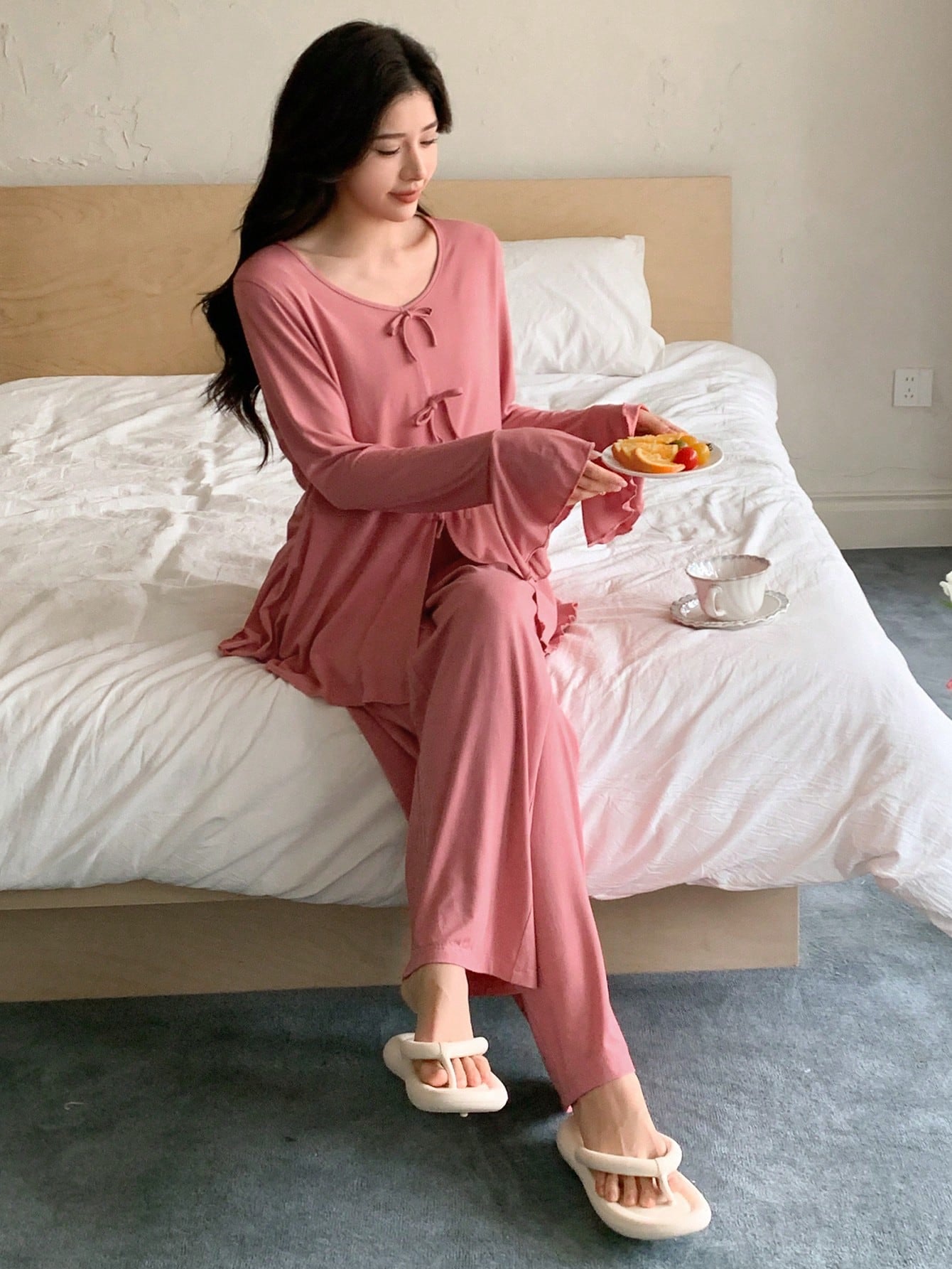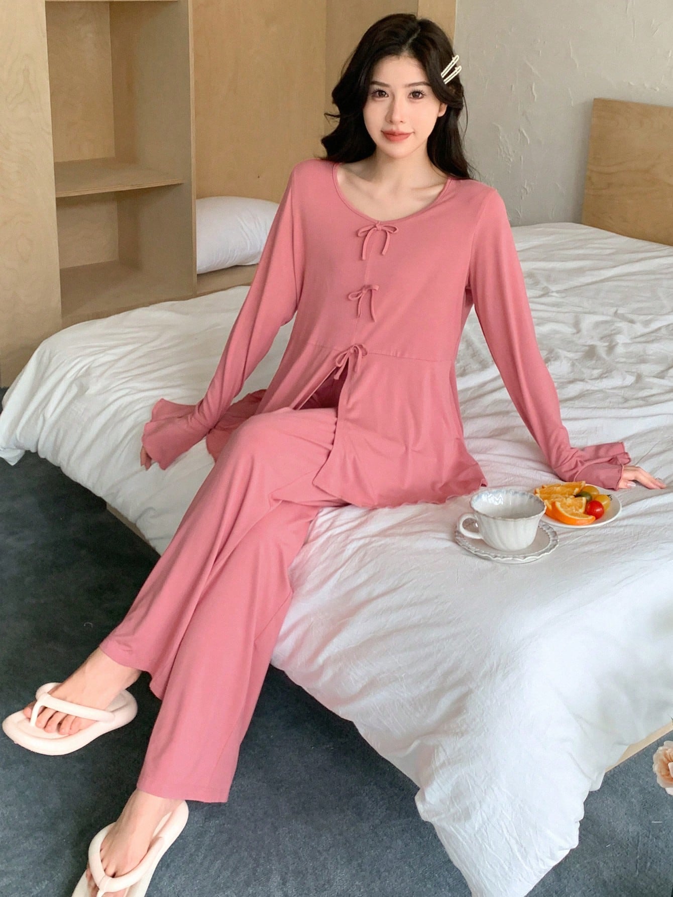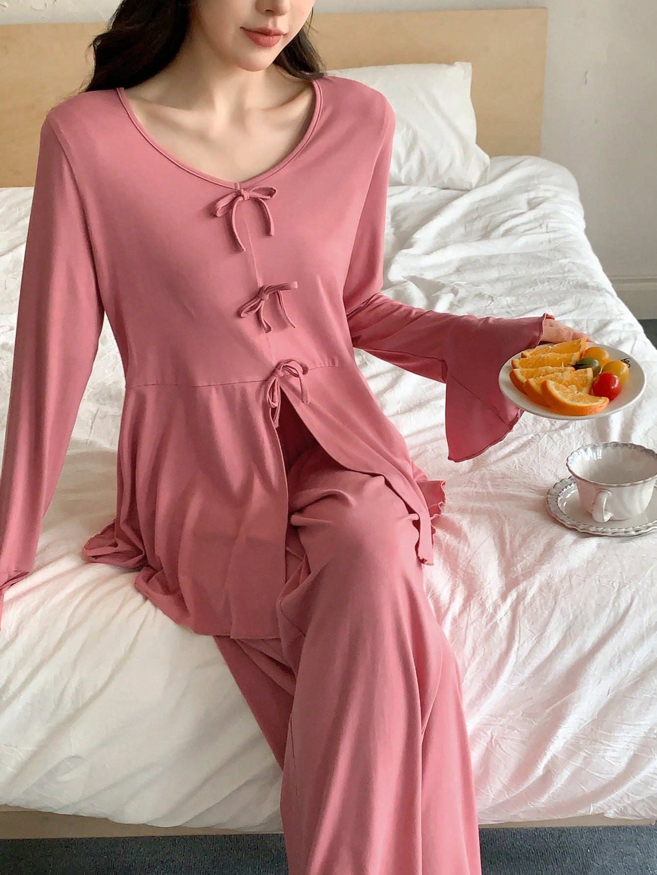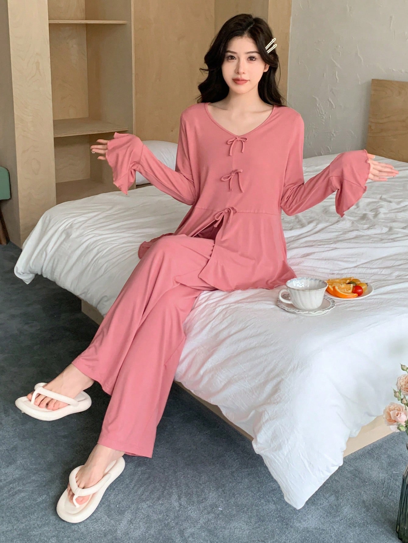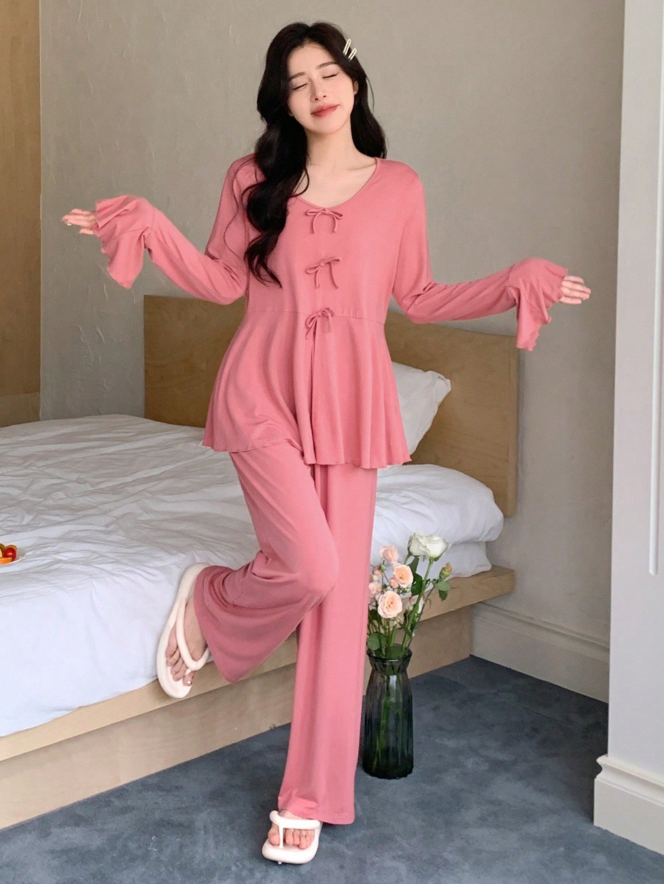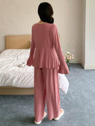 DAZY Knitted Bowknot Waistband Frilled Hem Long Sleeve Top And Pants Homewear Set, Fall Clothes