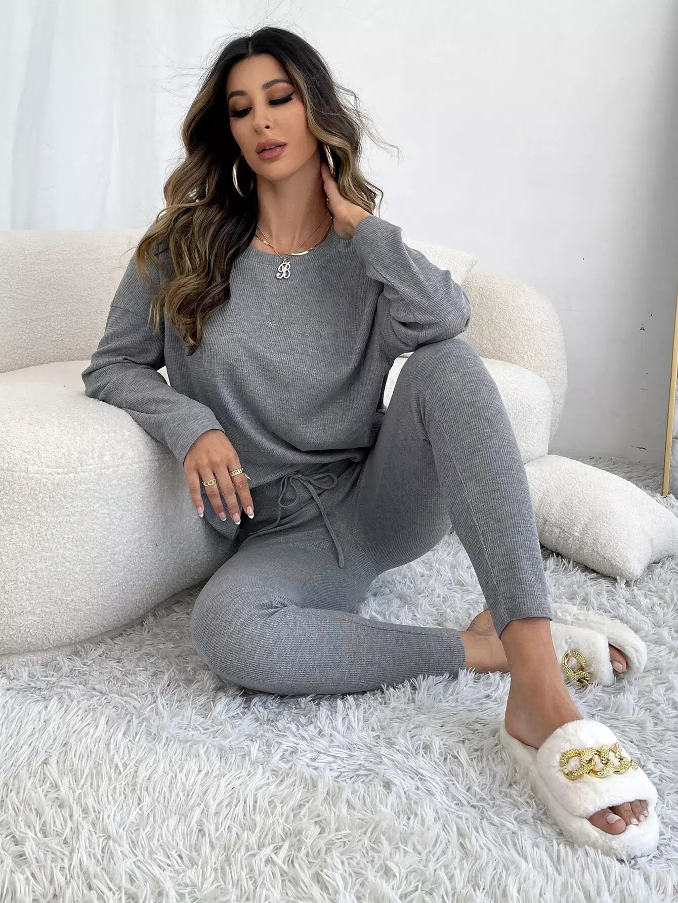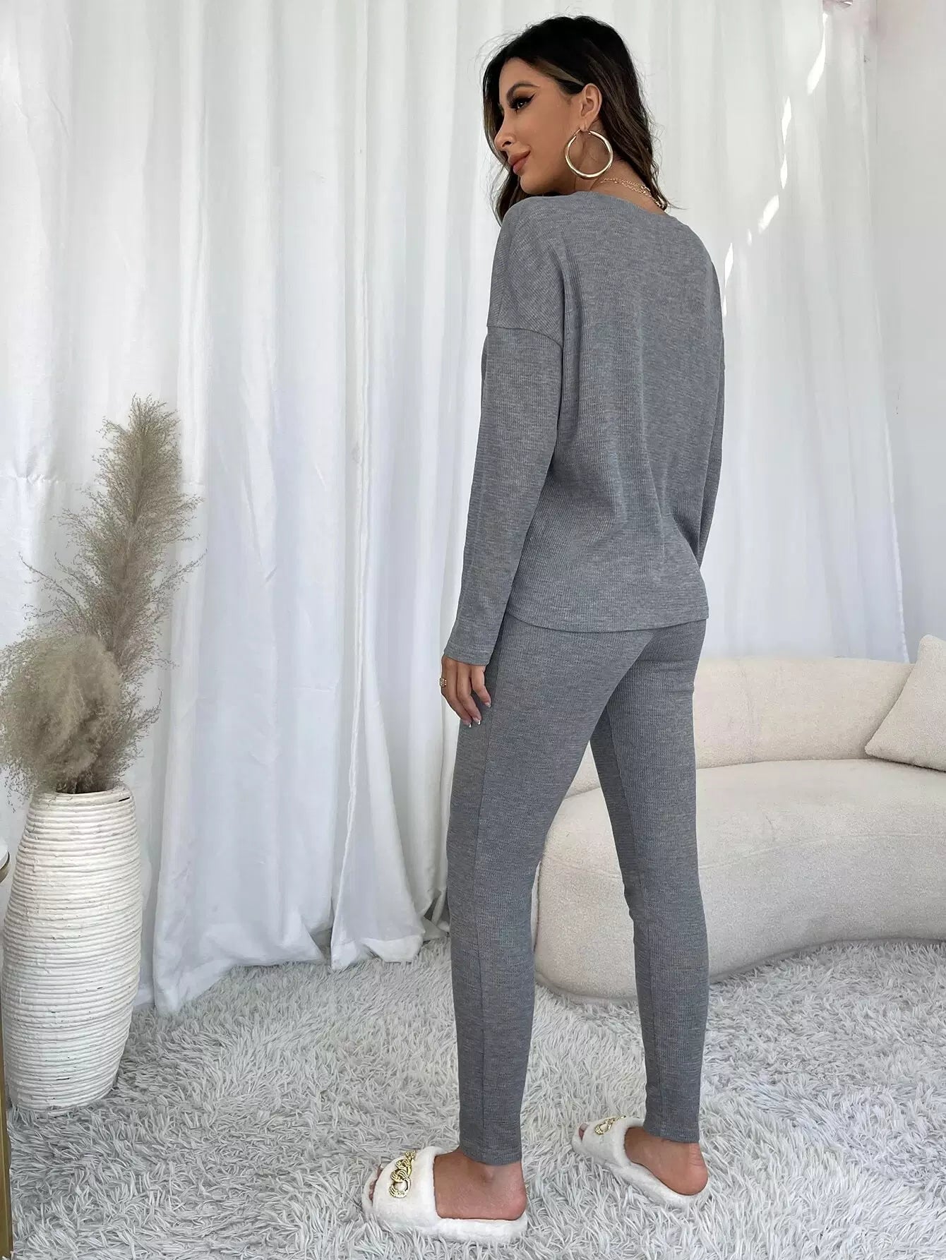 طقم صالة تي شيرت وبنطال ضيق بكتف منسدل