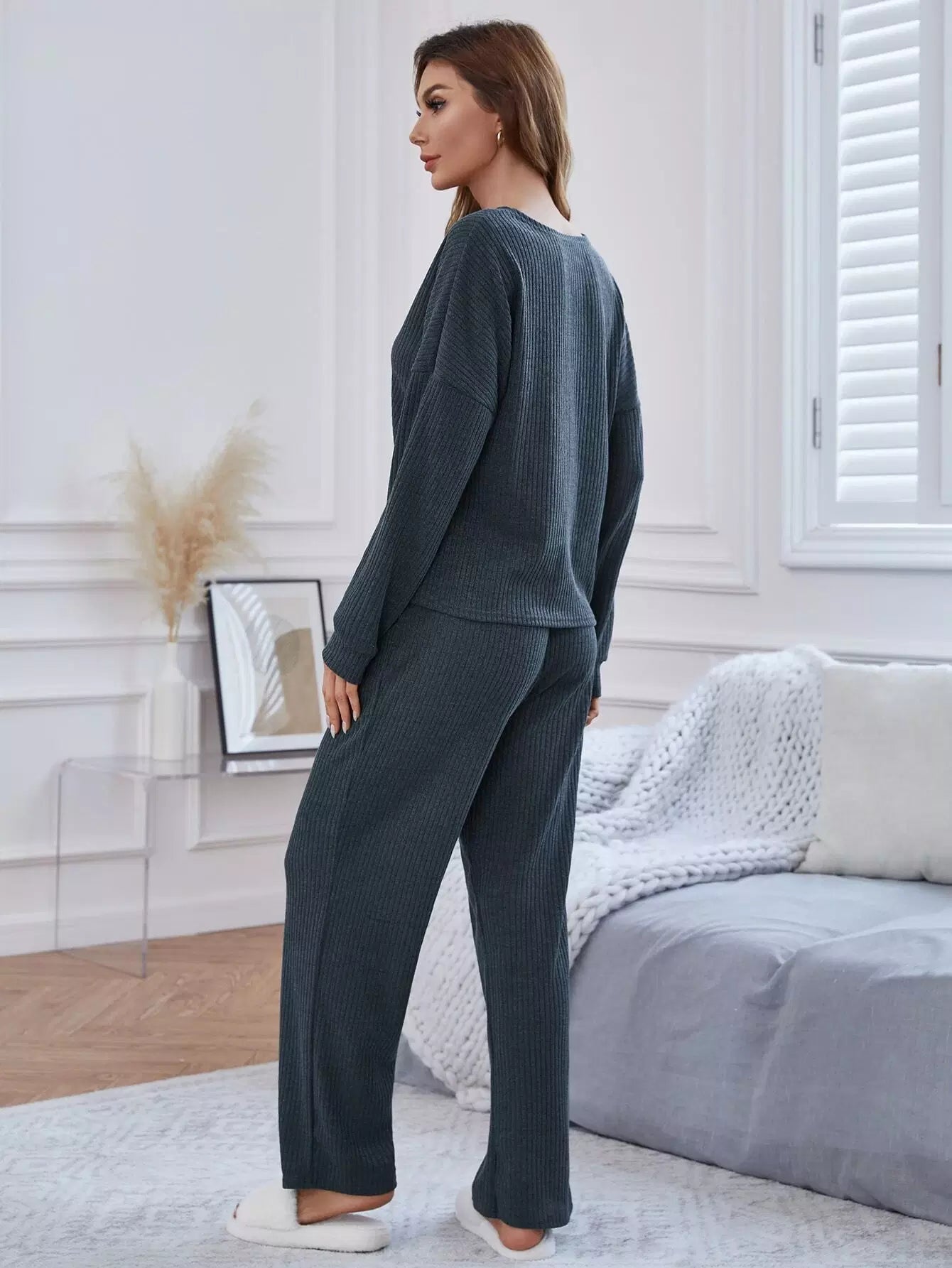 طقم بلوزة منسدلة الكتفين وبنطلون بدون أكتاف طقم استراحة