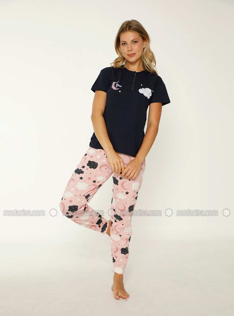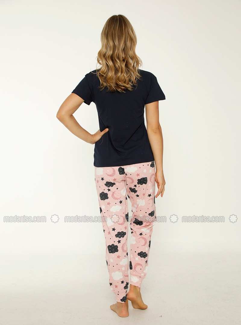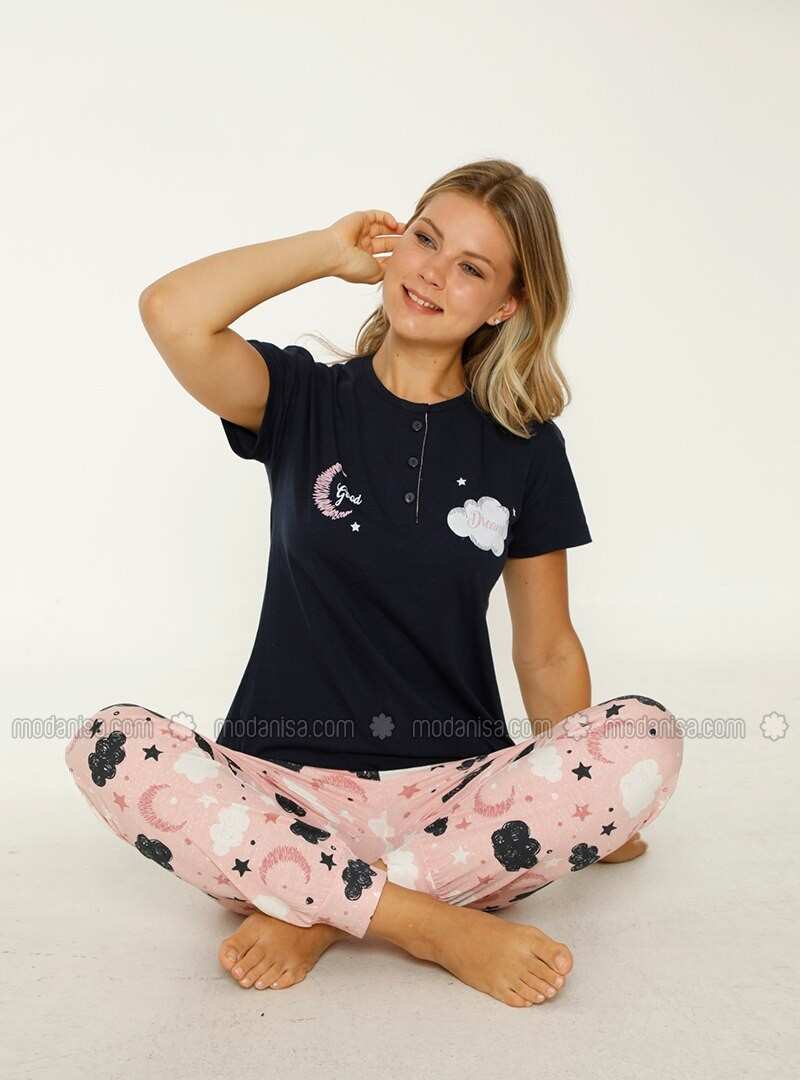 طقم بيجامة متعدد الألوان برقبة دائرية باللون الأزرق الداكن