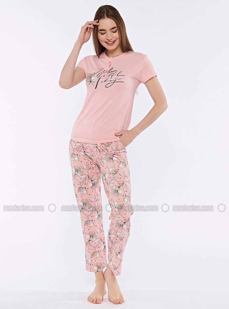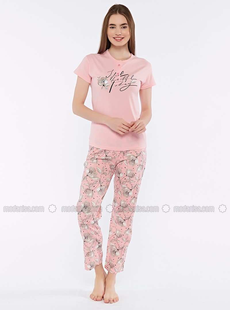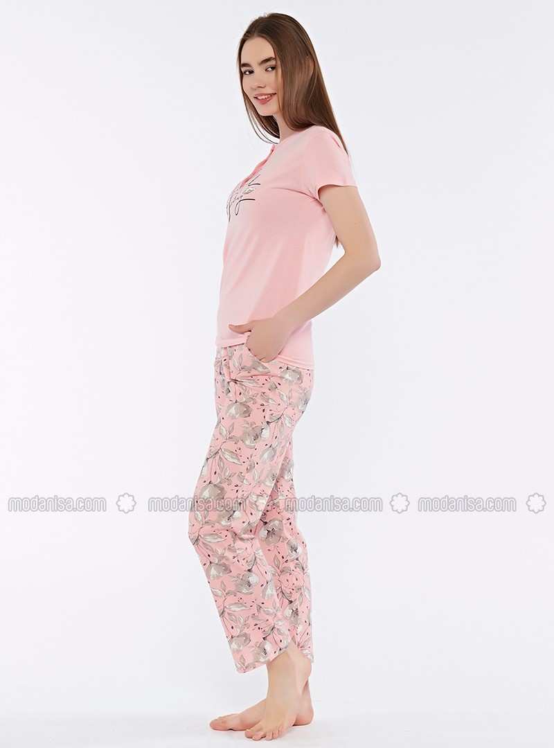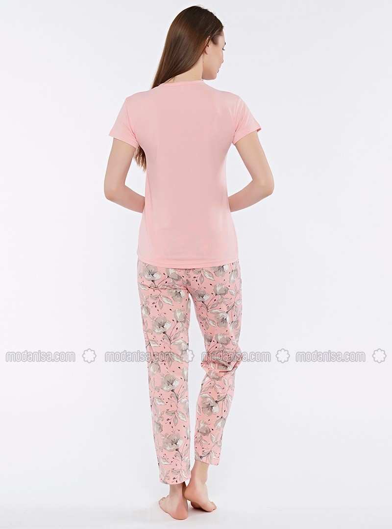 طقم بيجامة متعدد الألوان برقبة دائرية باللون الوردي