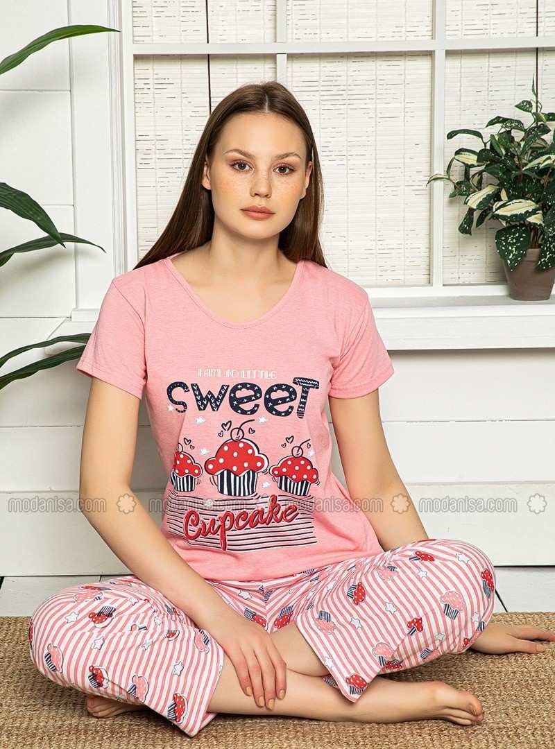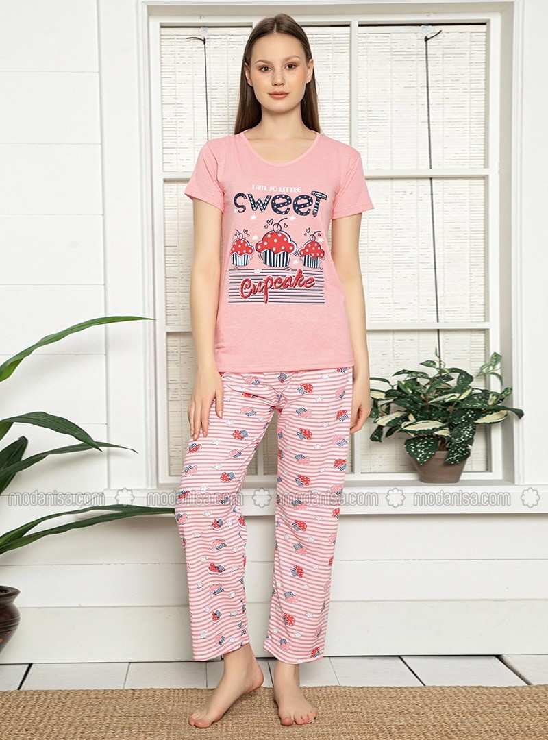 طقم بيجامة برقبة دائرية باللون الوردي