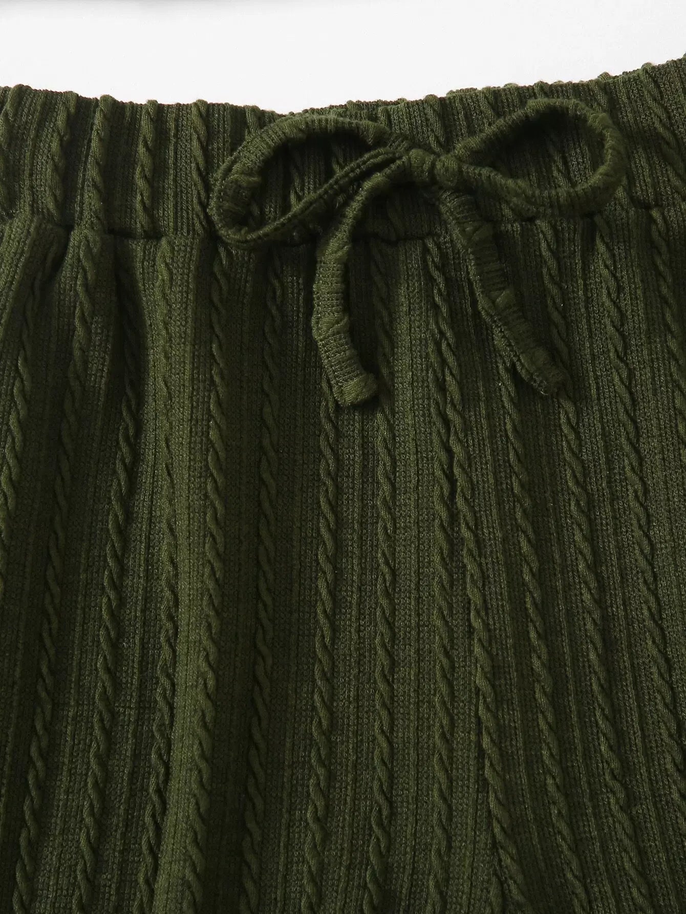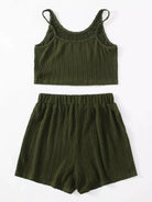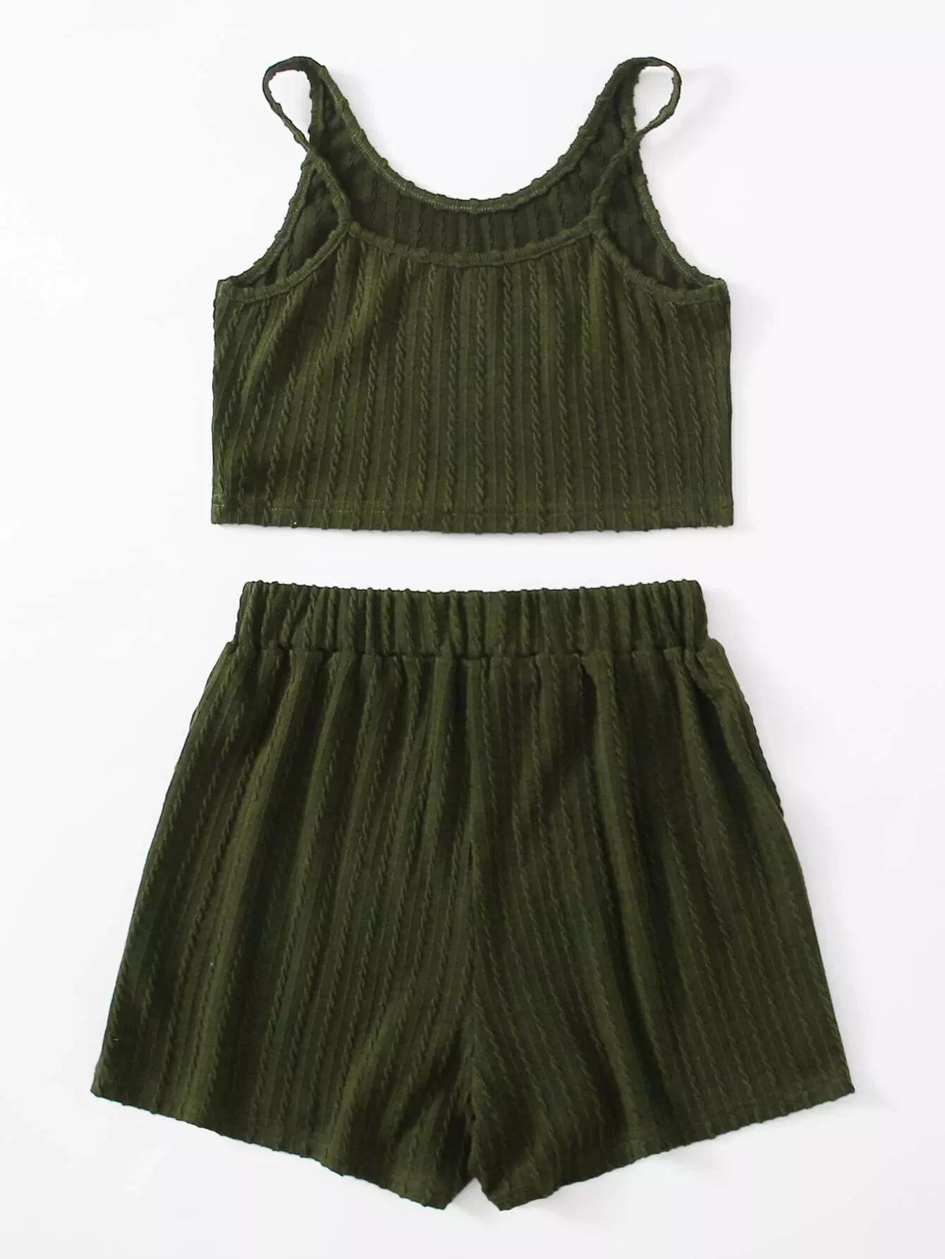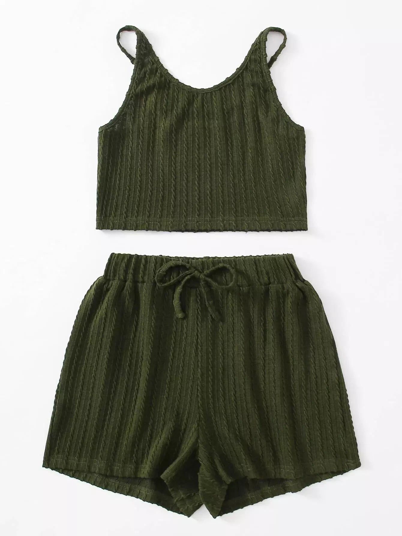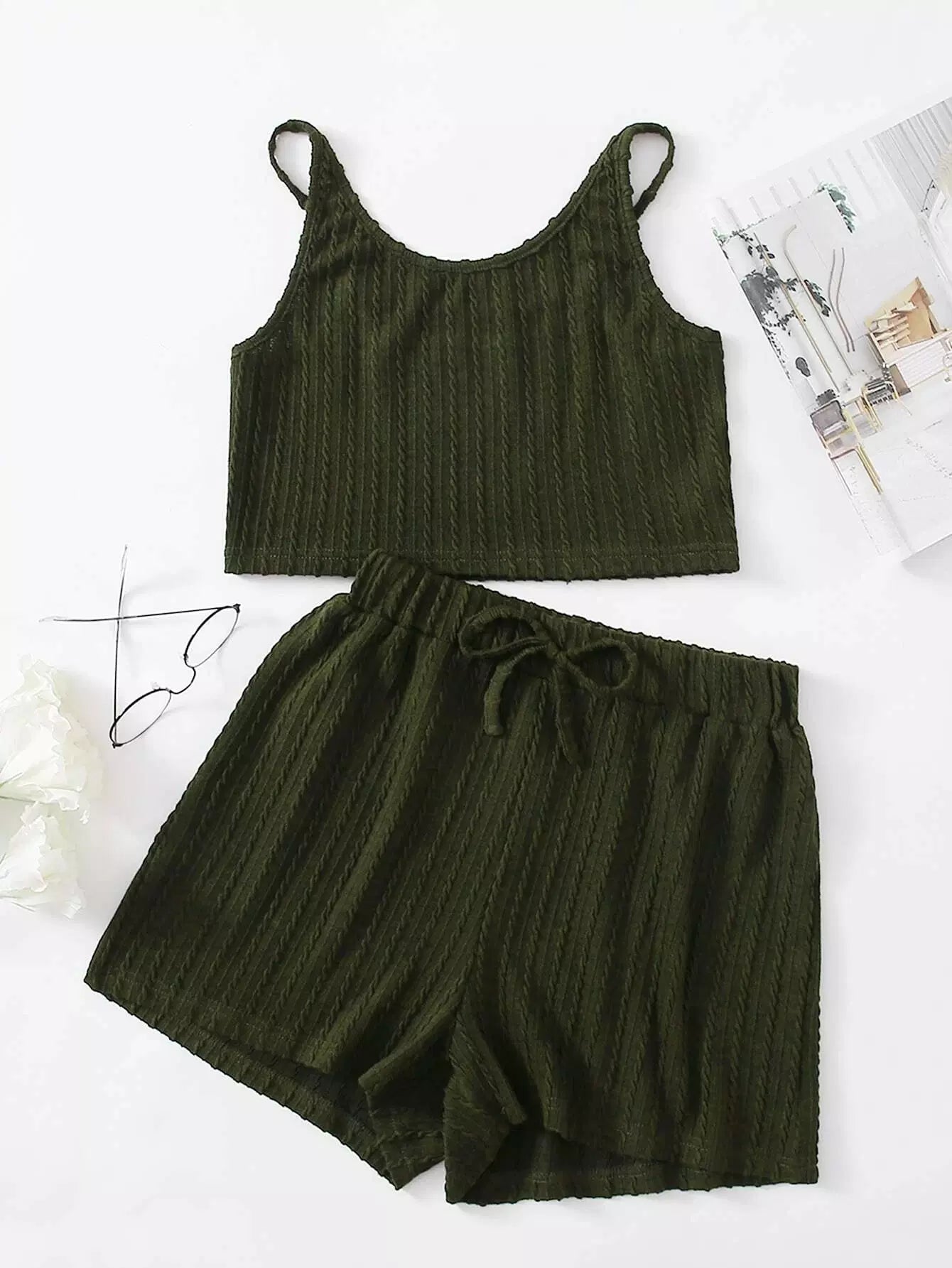 طقم صالة مكون من بلوزة كامي سادة وشورت برباط أمامي