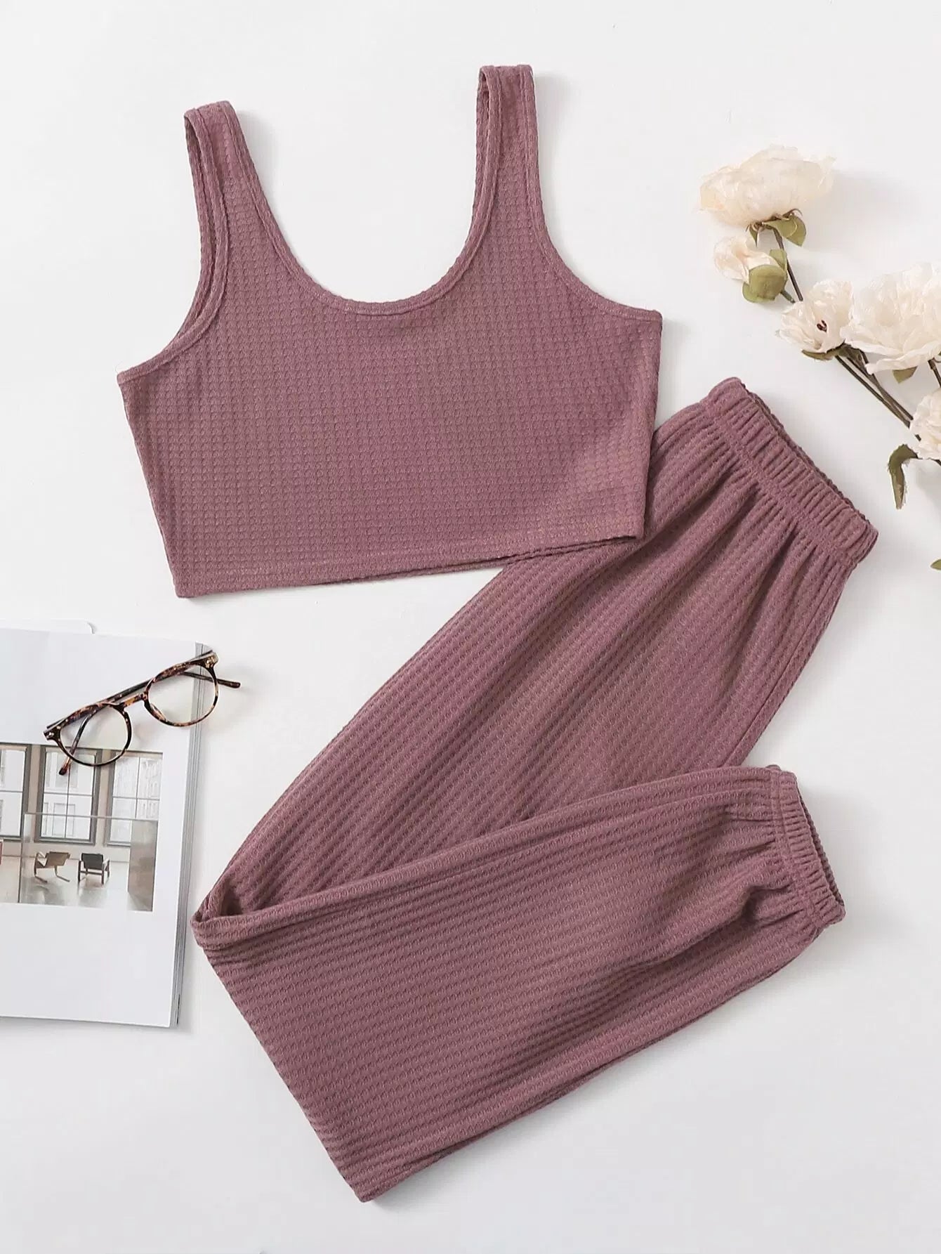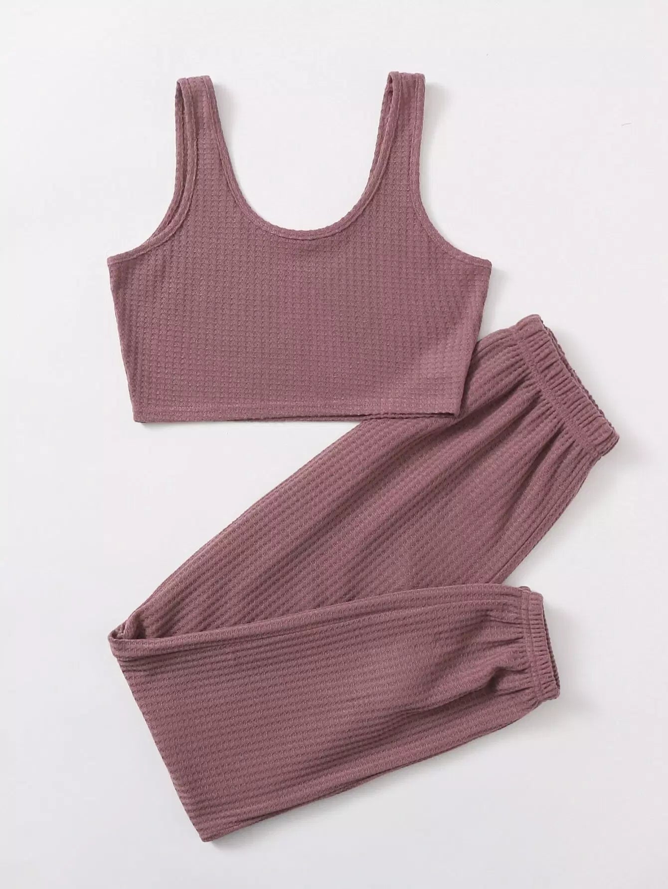 طقم صالة مكون من توب وبنطلون محبوك من الوافل