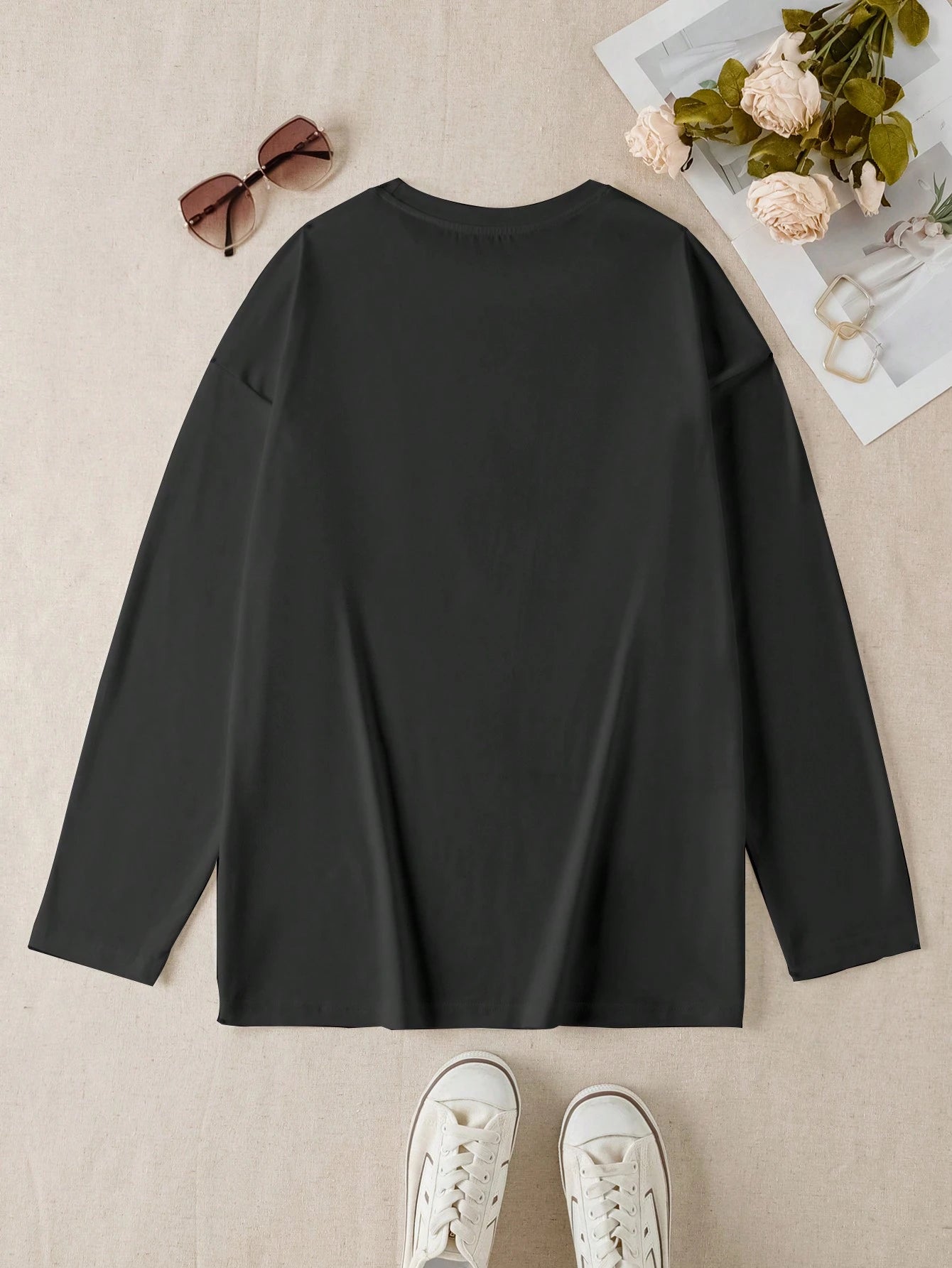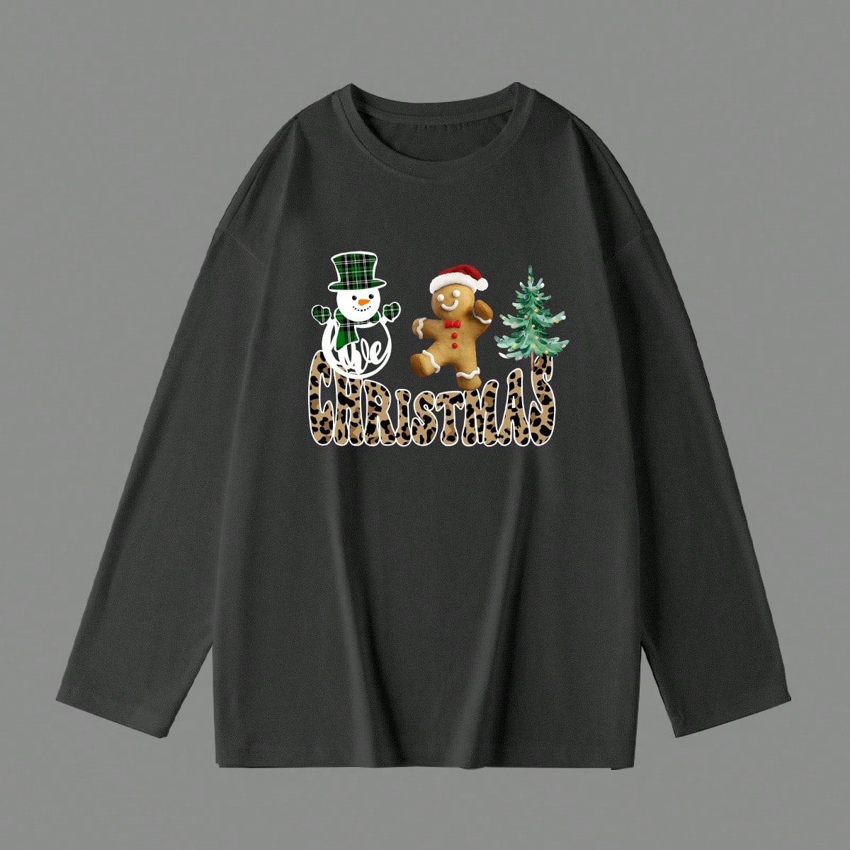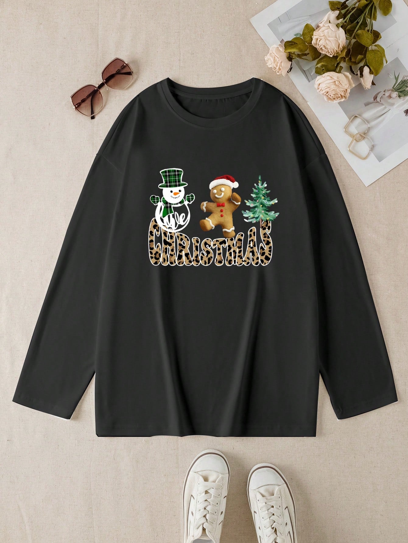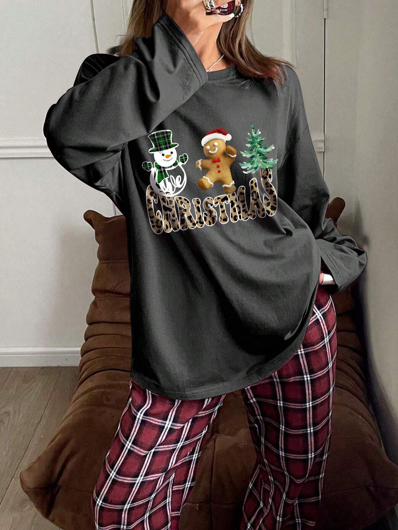 تي شيرت نسائي بأكمام طويلة ورقبة دائرية فضفاضة، قطعة واحدة، بتصميم بسيط وأنيق، مناسب لعطلات الكريسماس