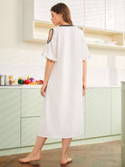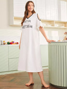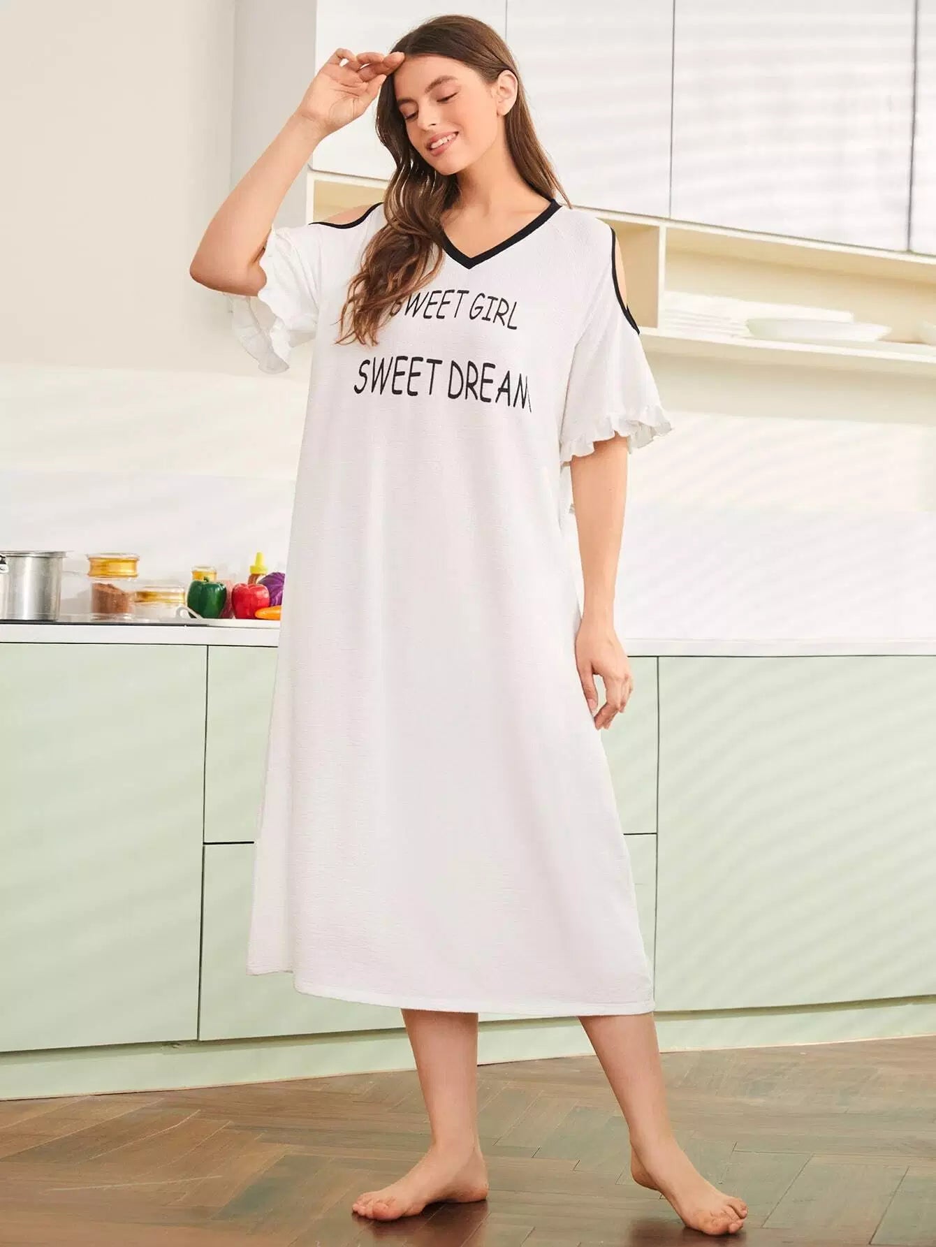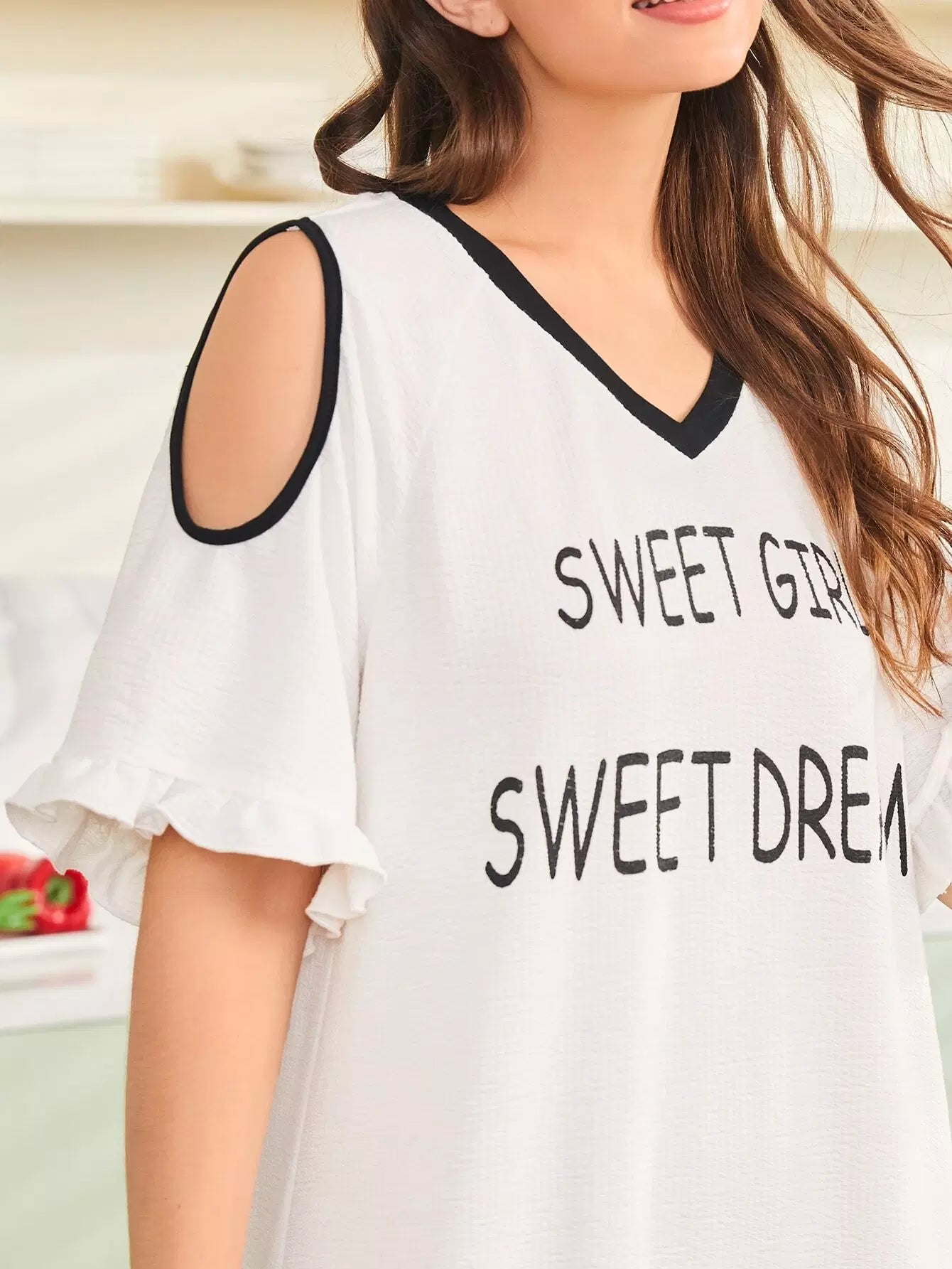 فستان نوم مفتوح الكتفين مع رباط متباين وأساور مكشكشة ورسومات بأحرف
