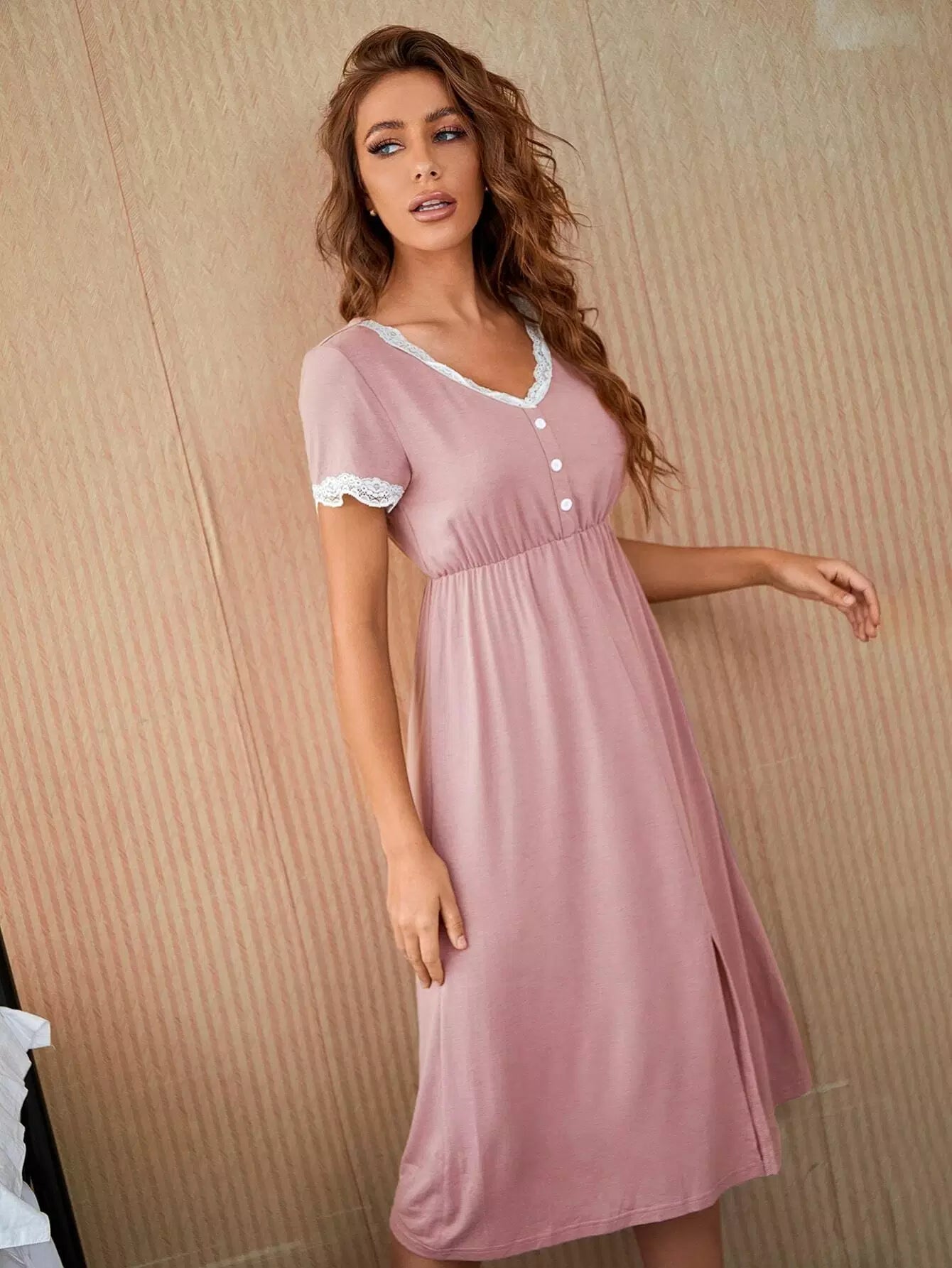 فستان نوم ذو حواف مشقوقة من الدانتيل بتفاصيل بلون مغاير