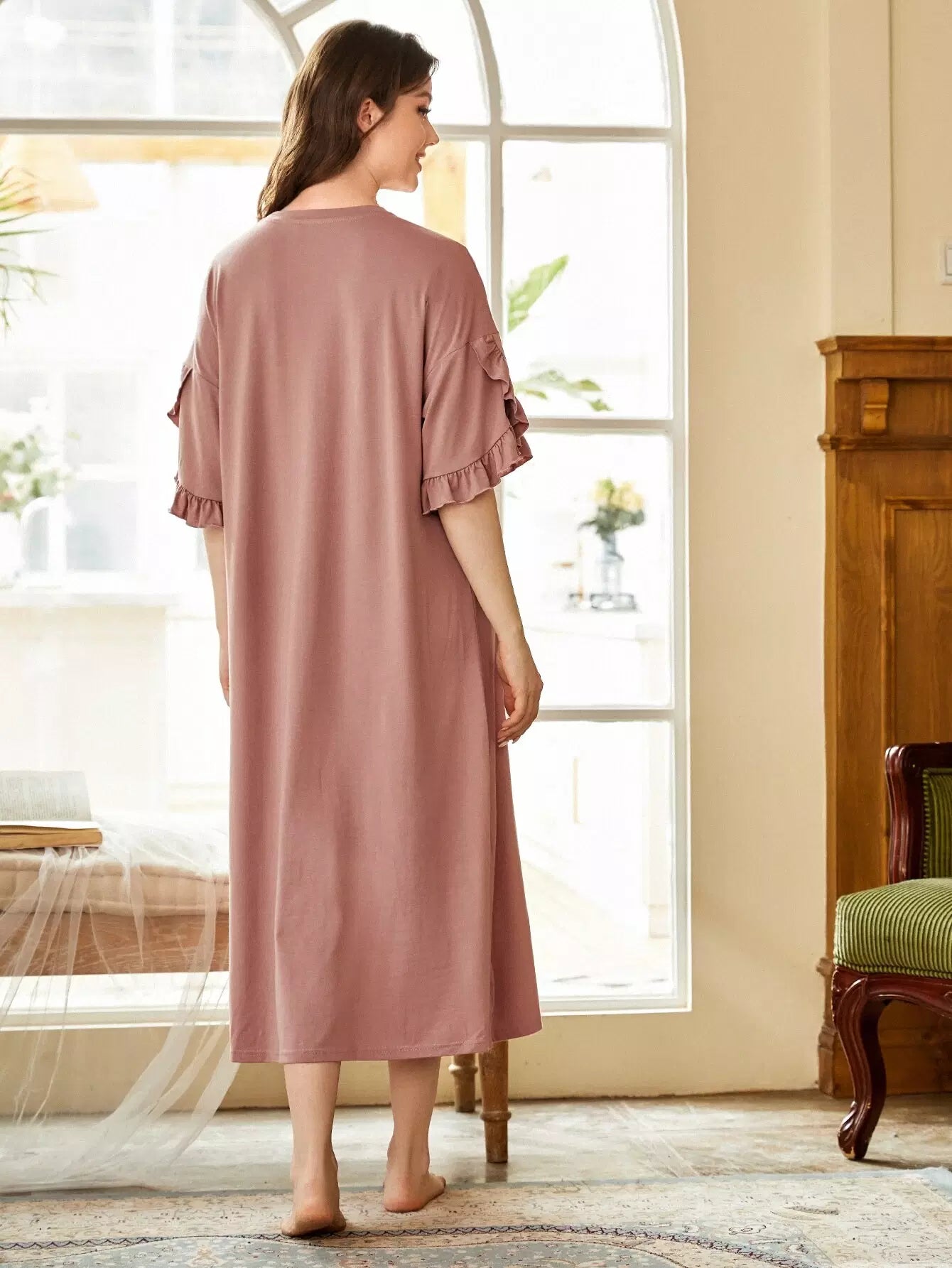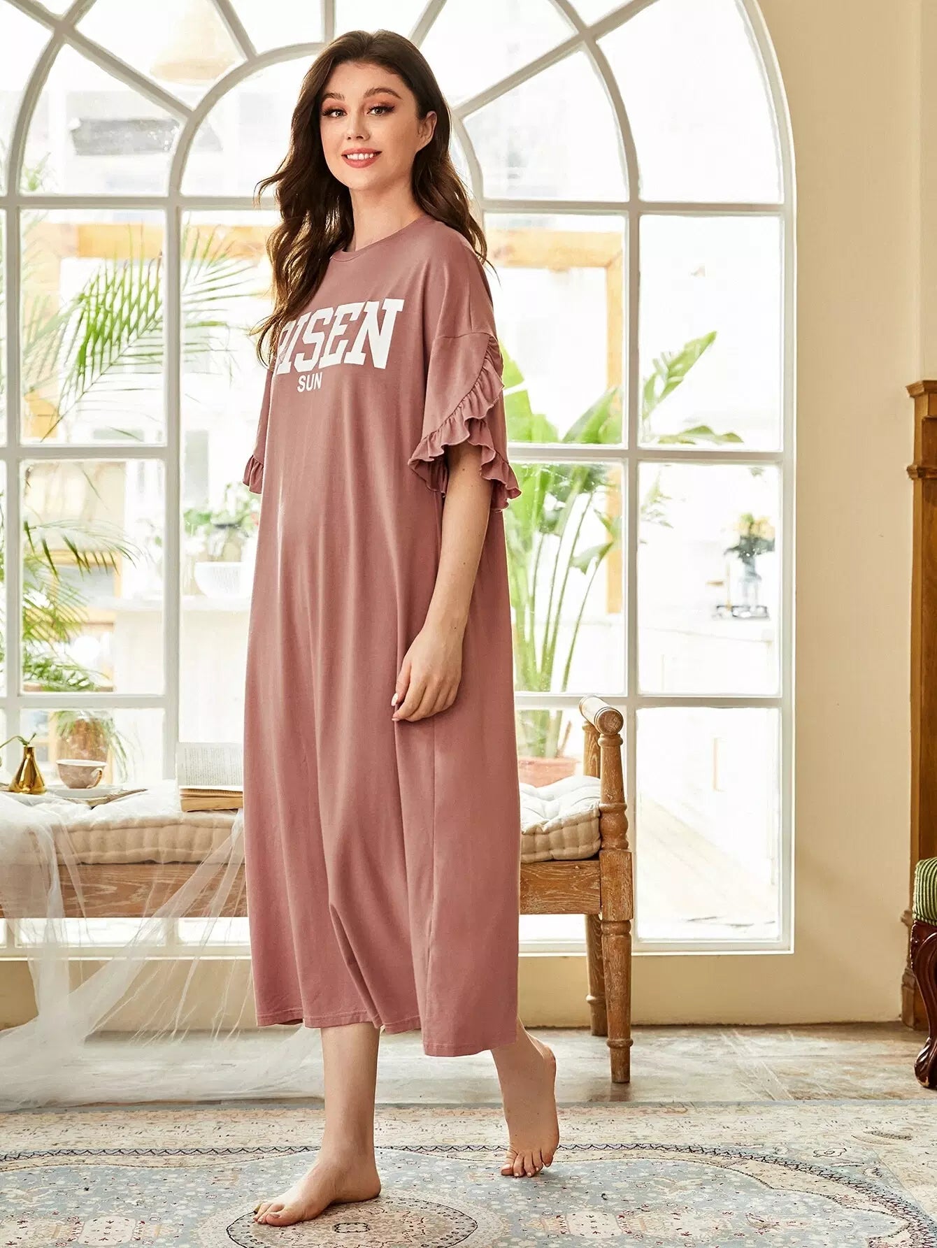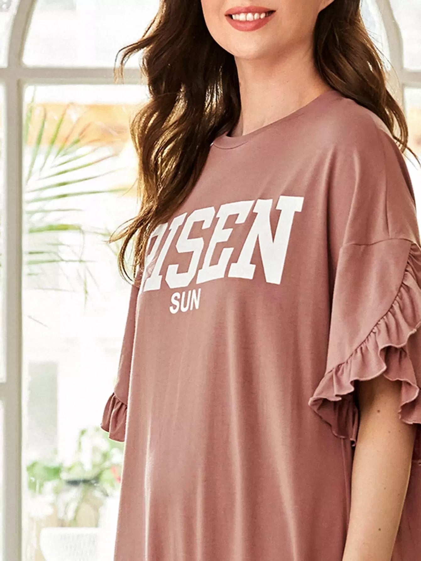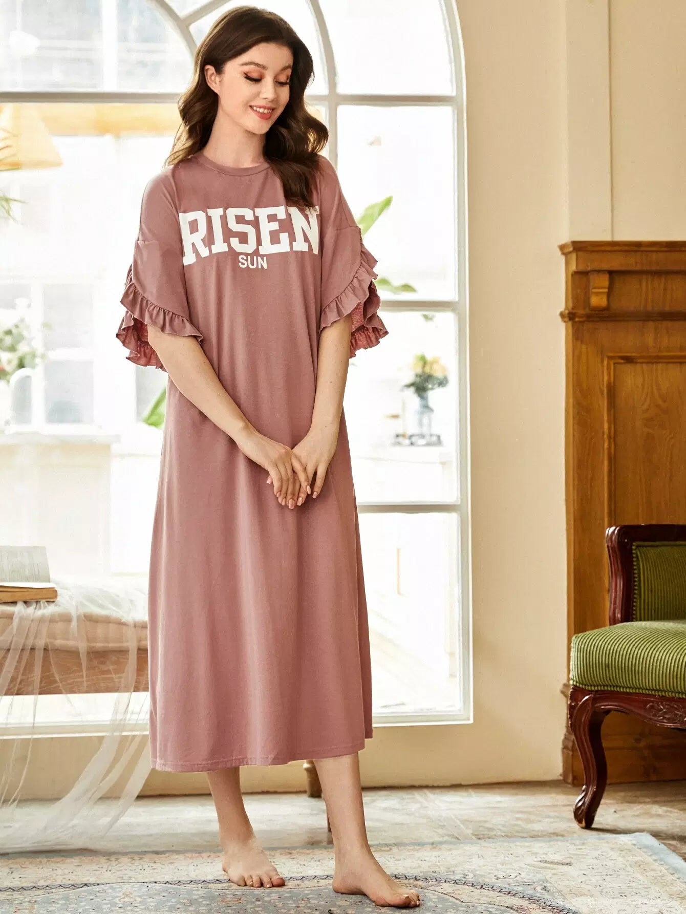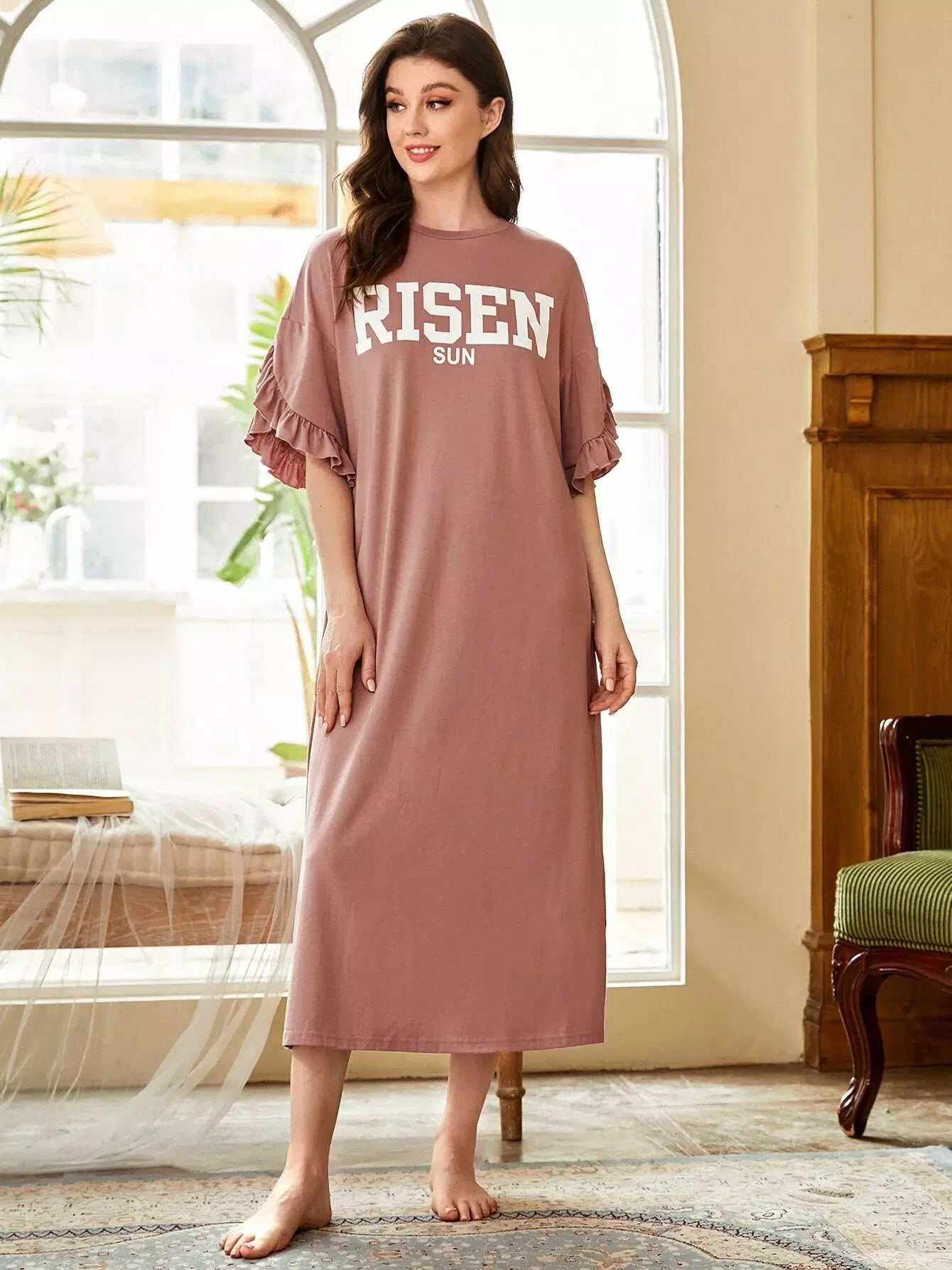 فستان نوم كشكش منسدل على الأكتاف بأكمام كشكش برسومات حروف