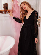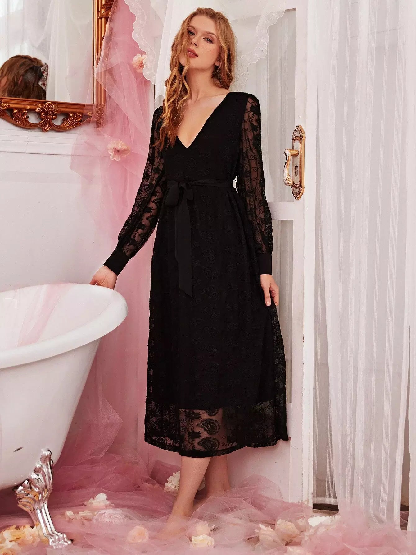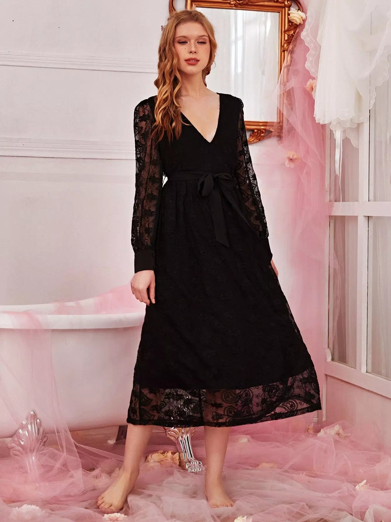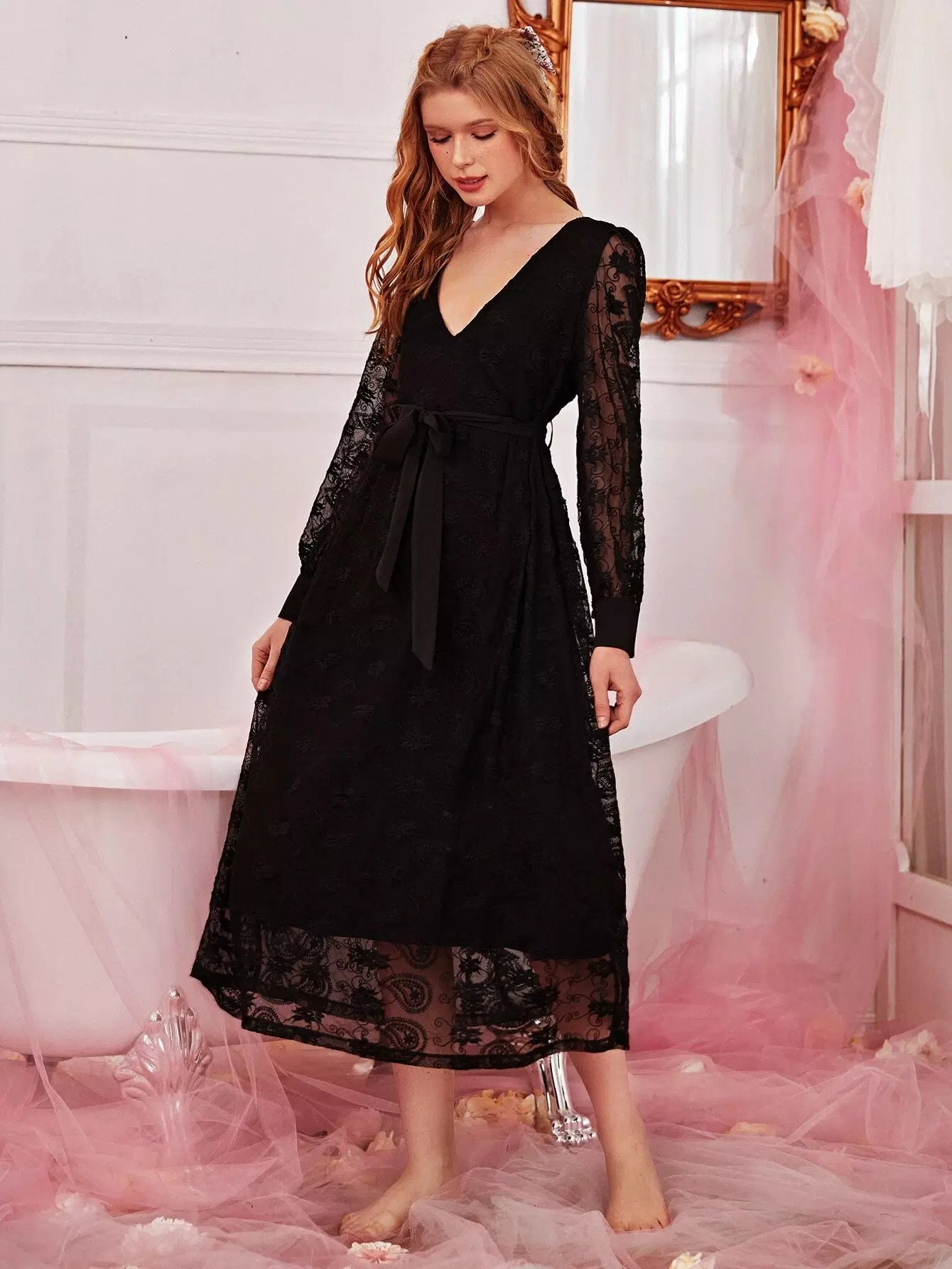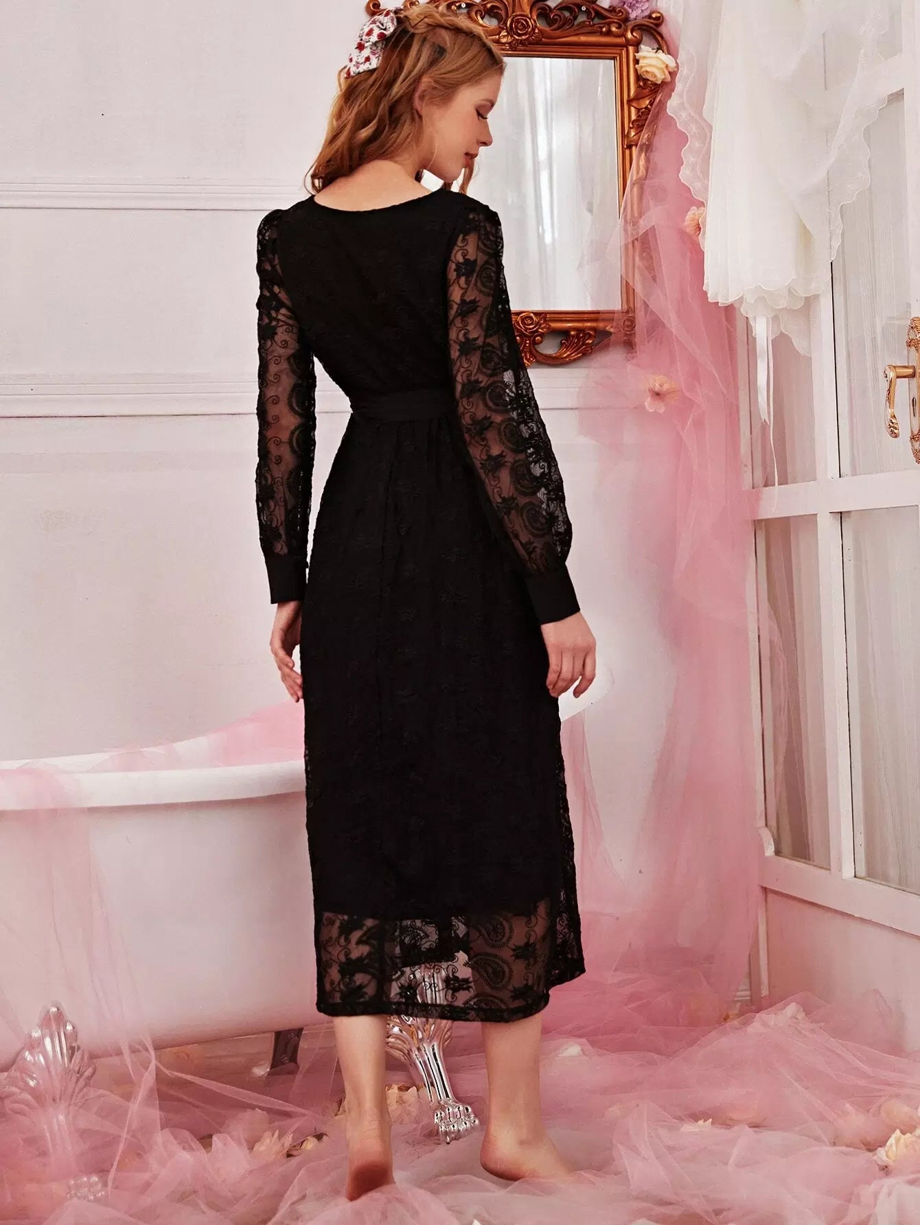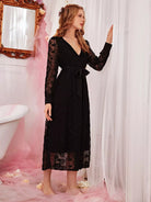 فستان نوم بطبقة شبكية مطرزة بدون حزام