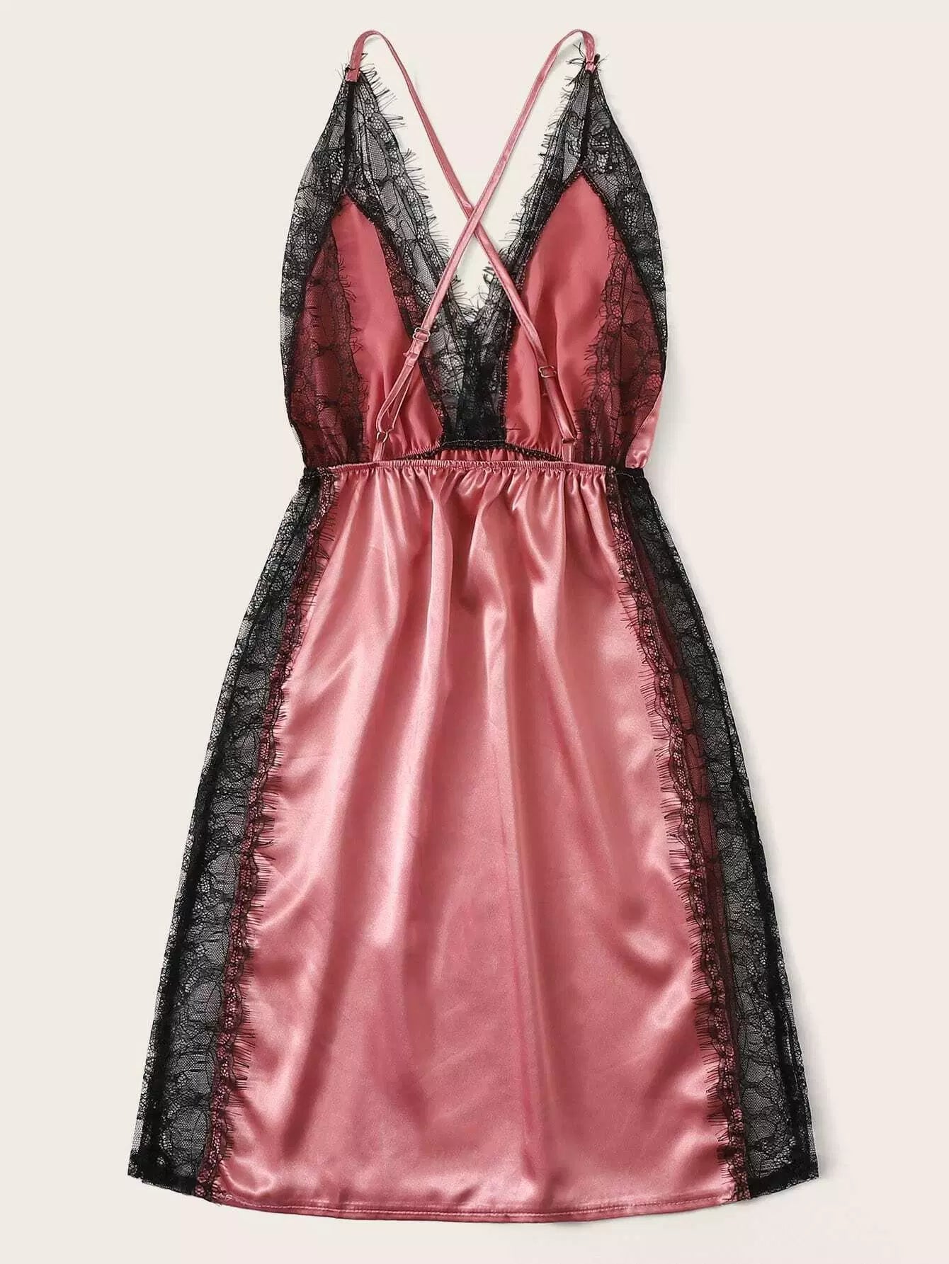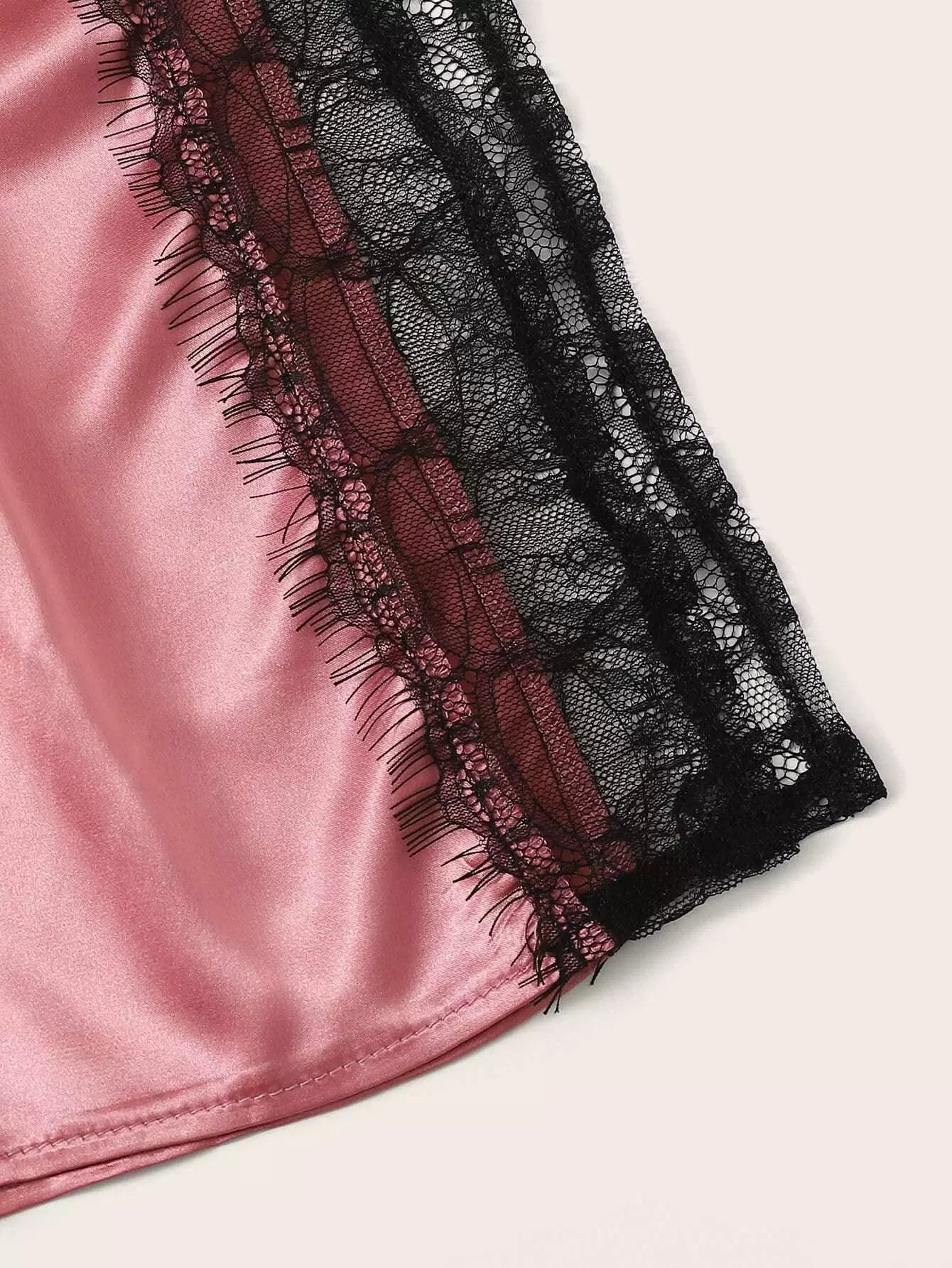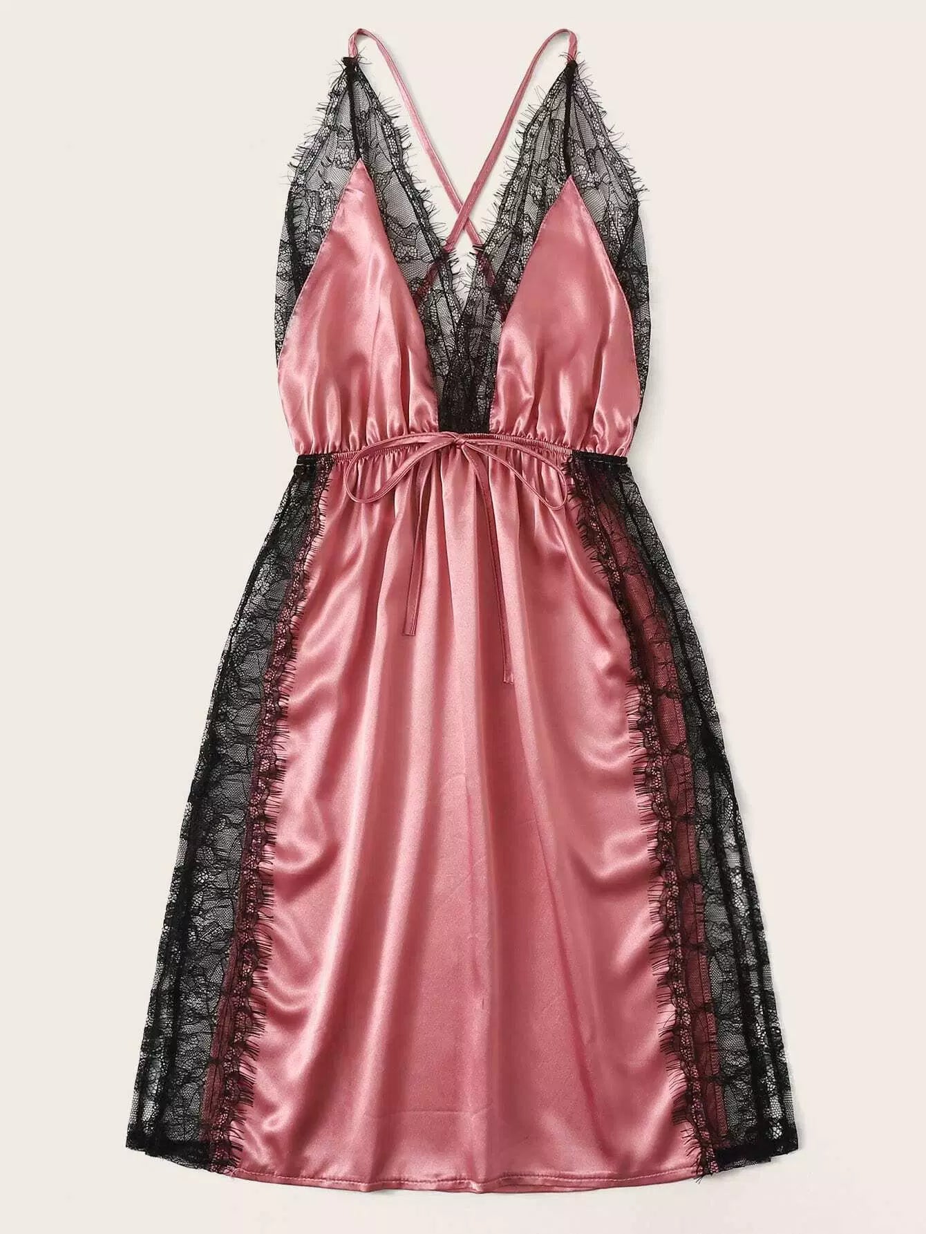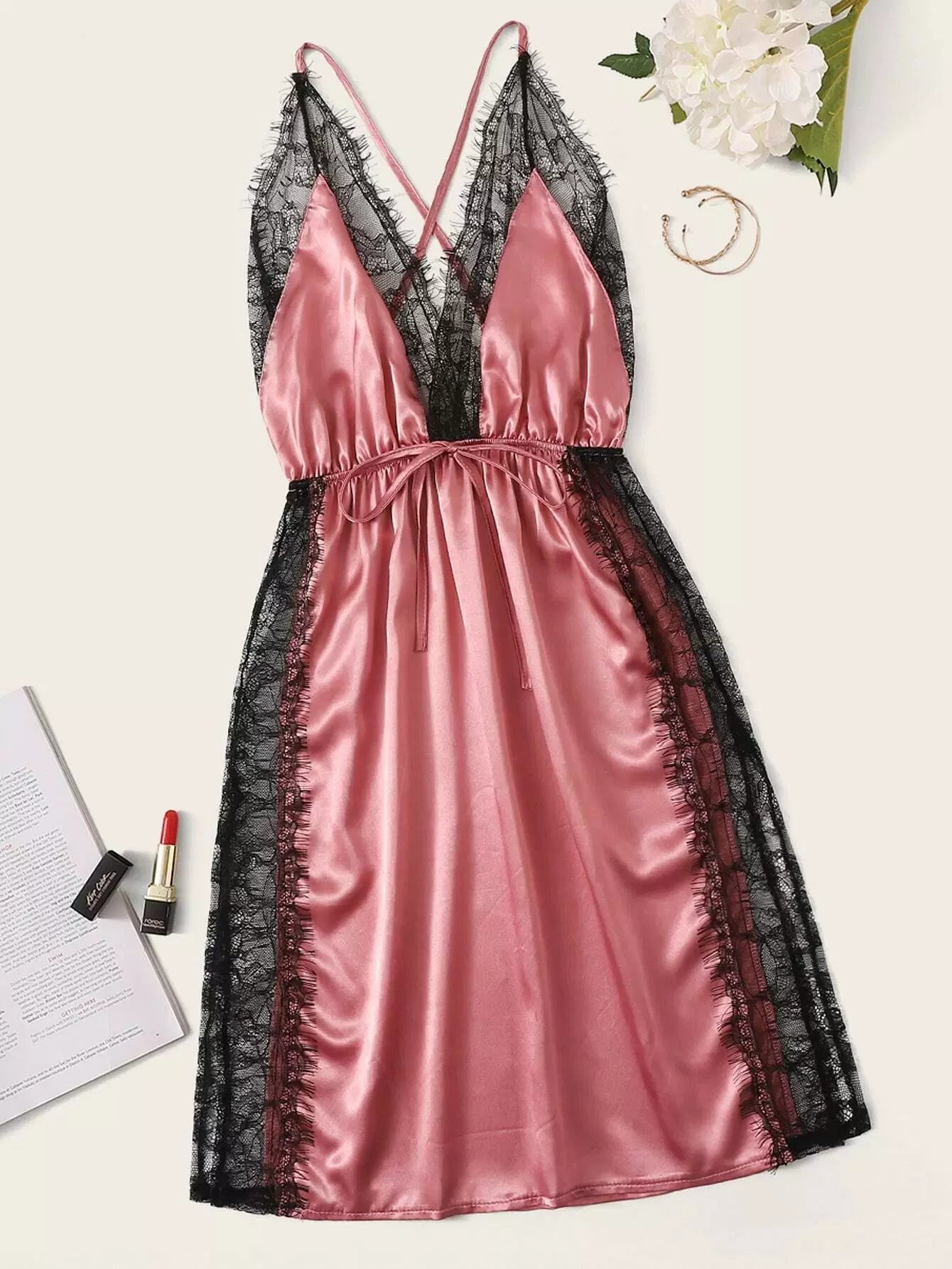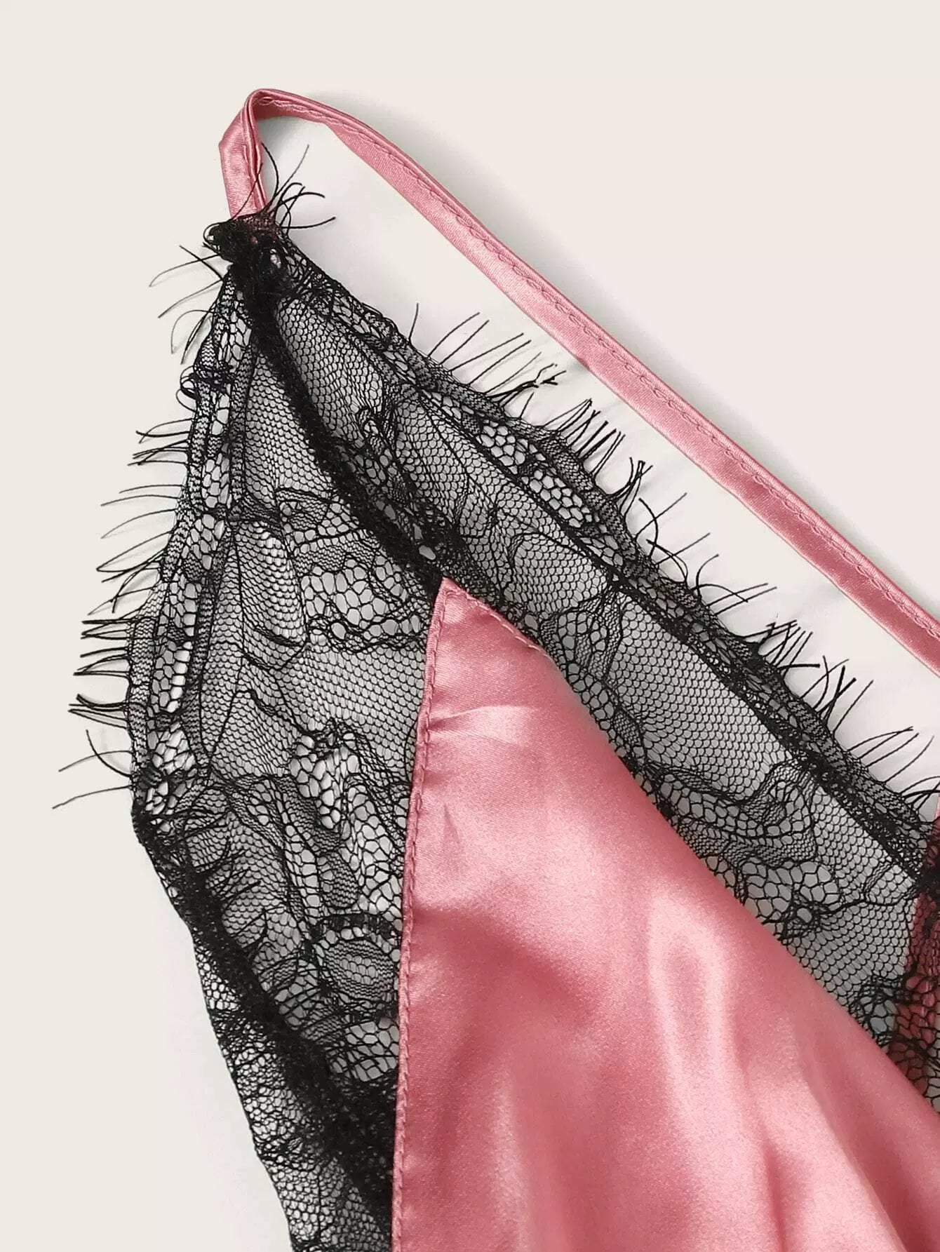 فستان كامي ساتان بفتحة عالية وإضافات من الدانتيل