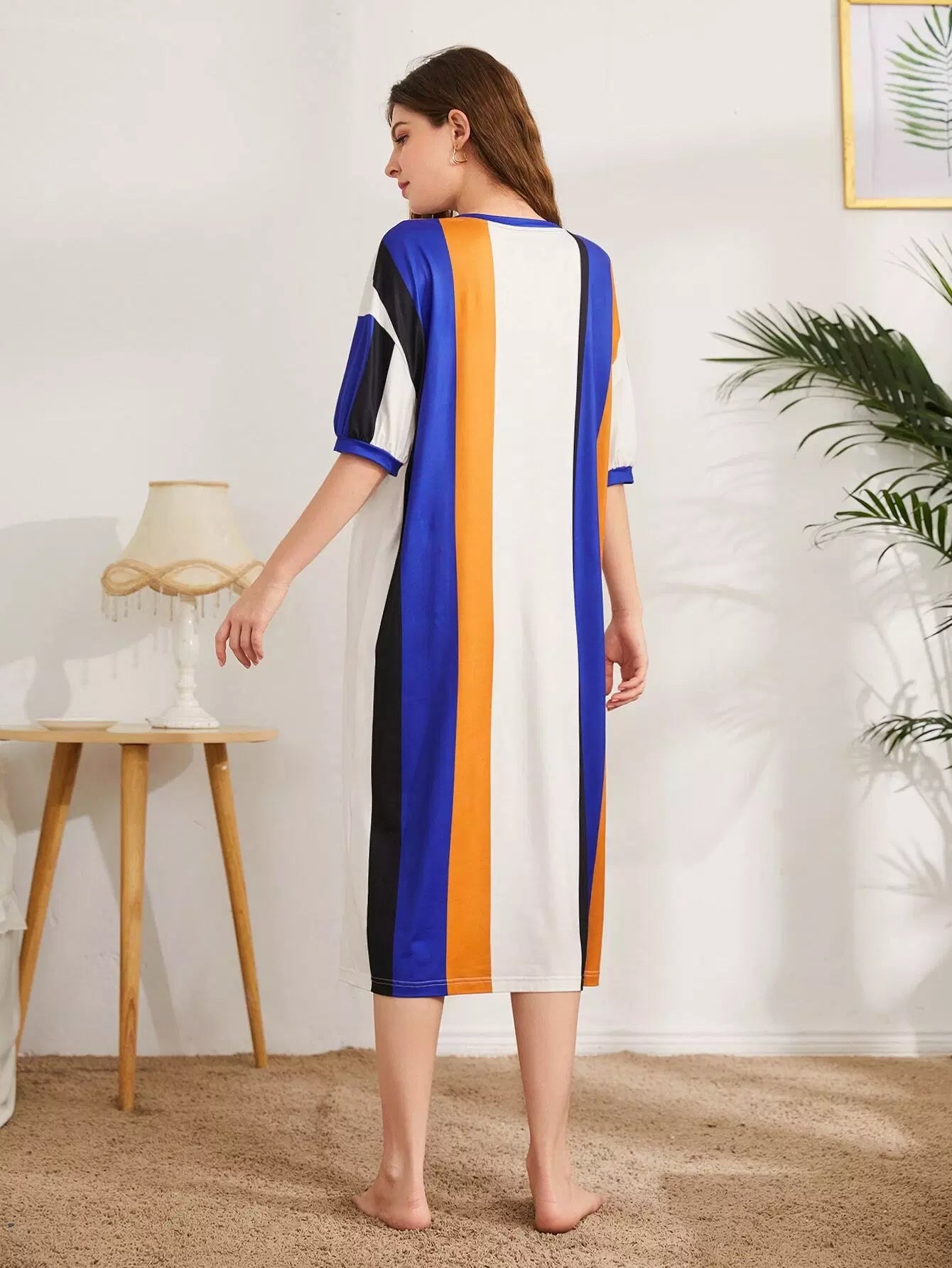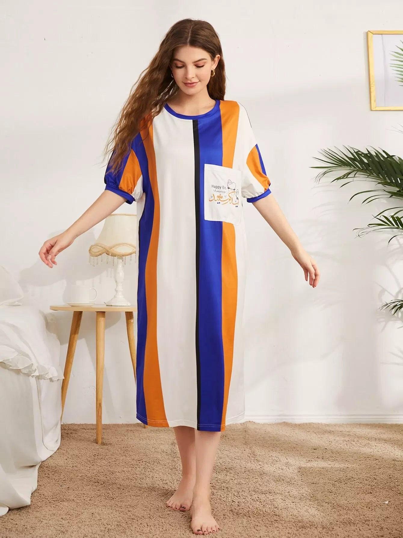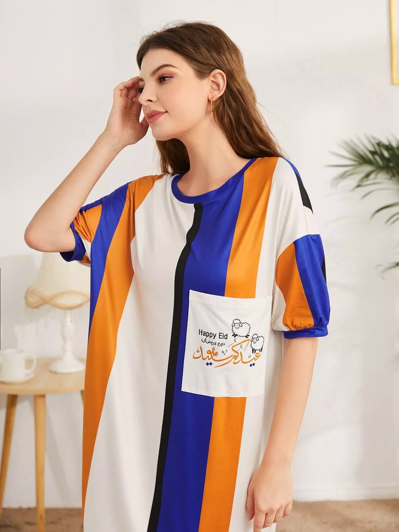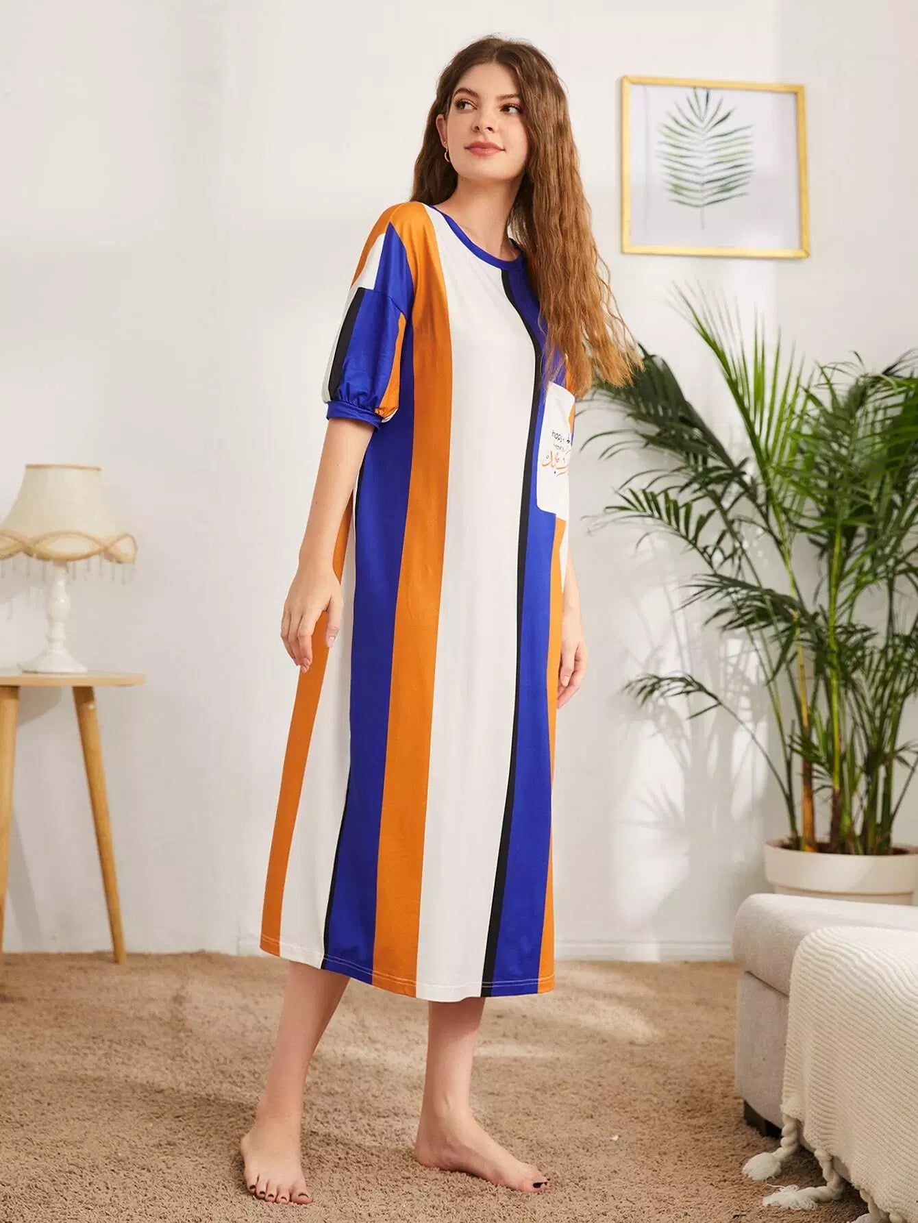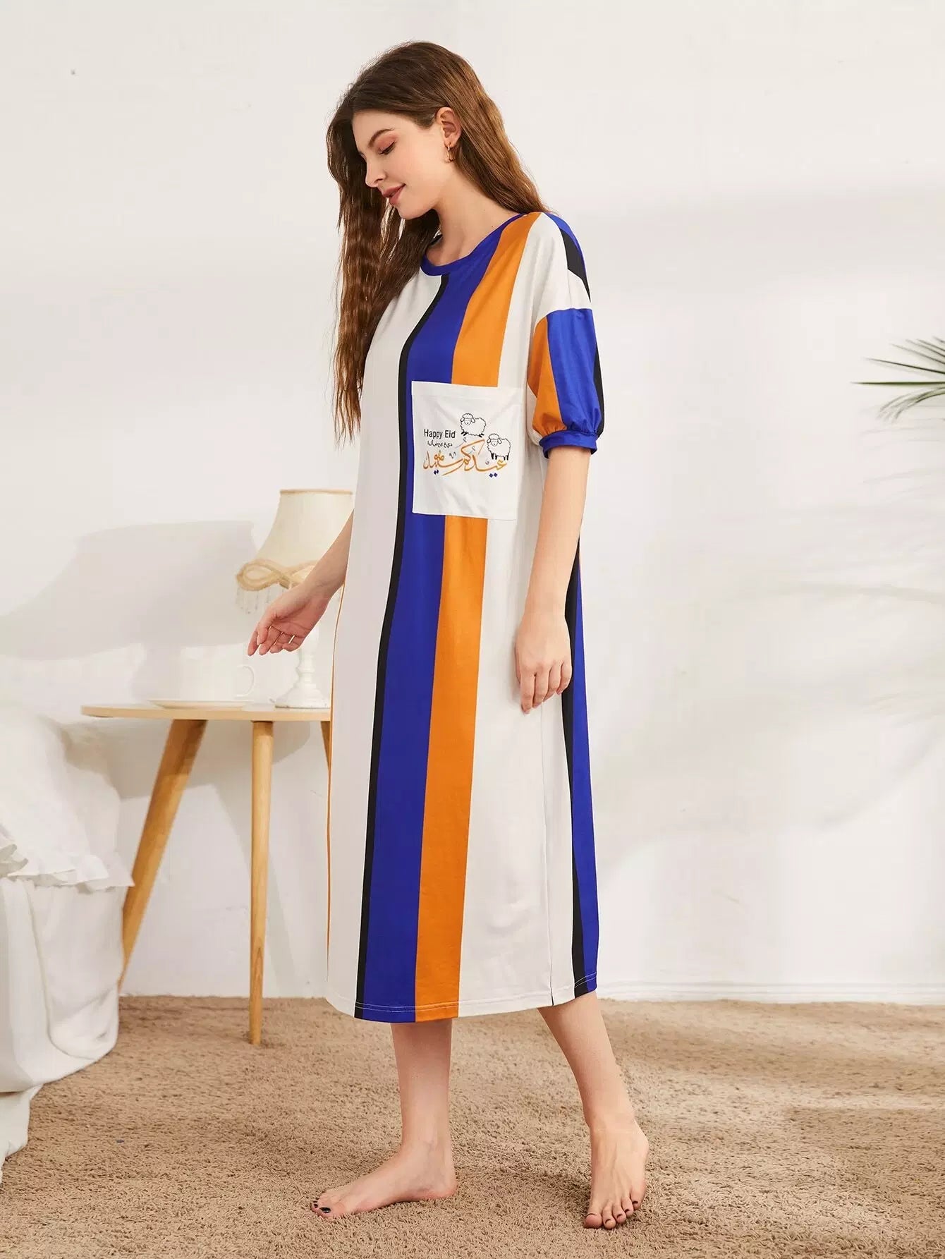 فستان نوم مخطط بطبعة حروف وخراف