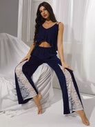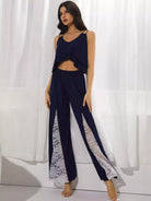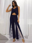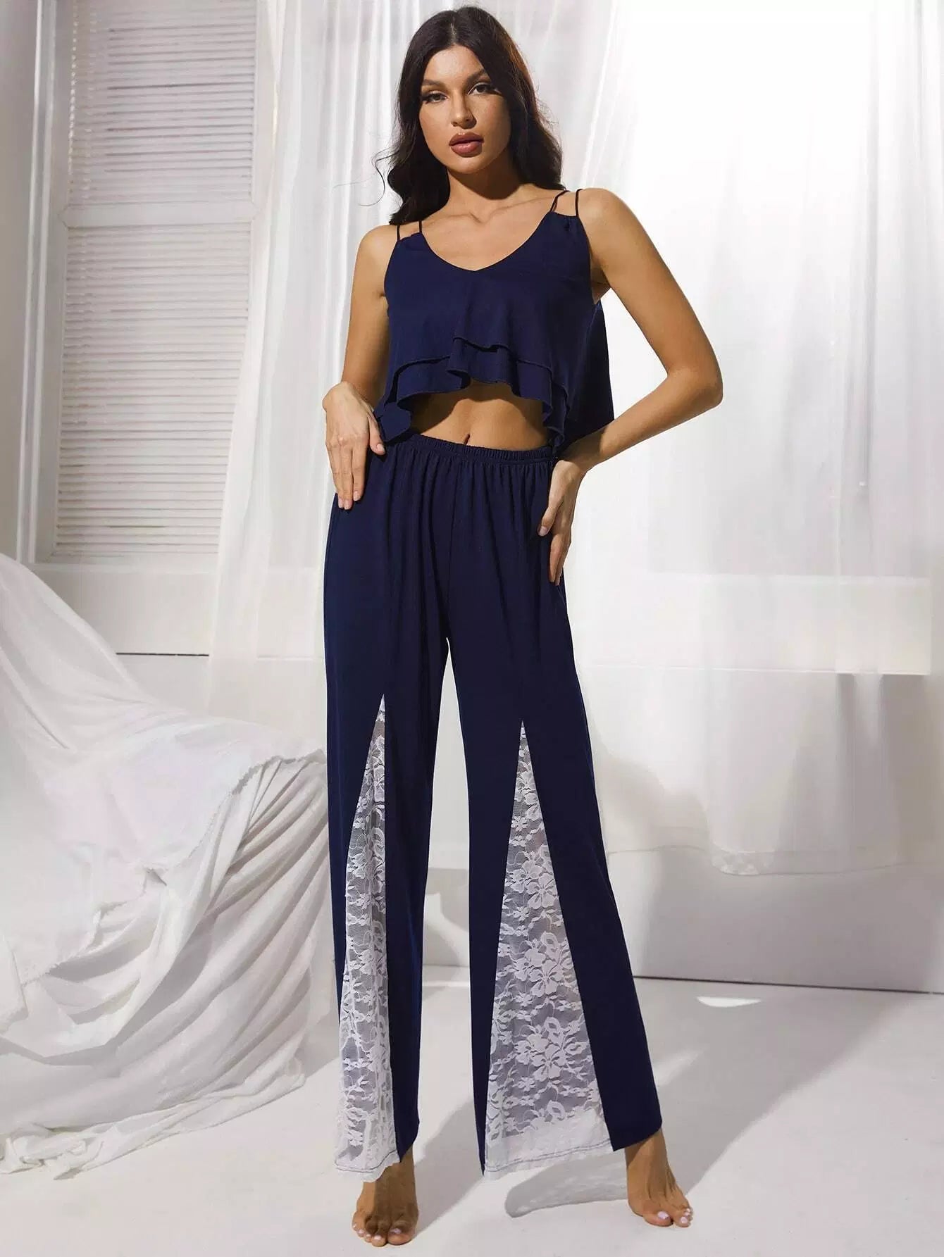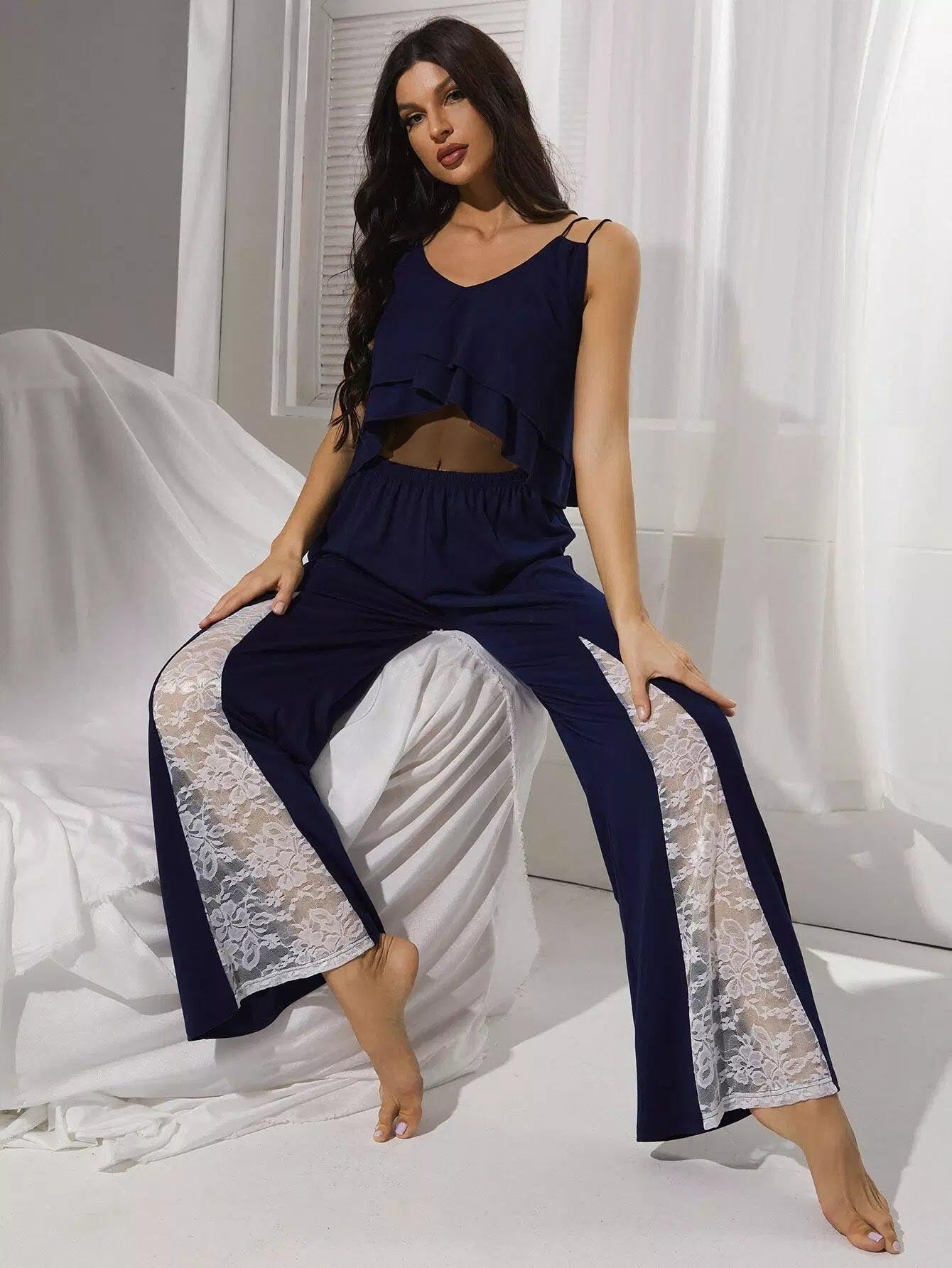 طقم بلوزة بحافة غير متماثلة بحاشية غير متماثلة وطقم بيجامة دانتيل بلون مغاير