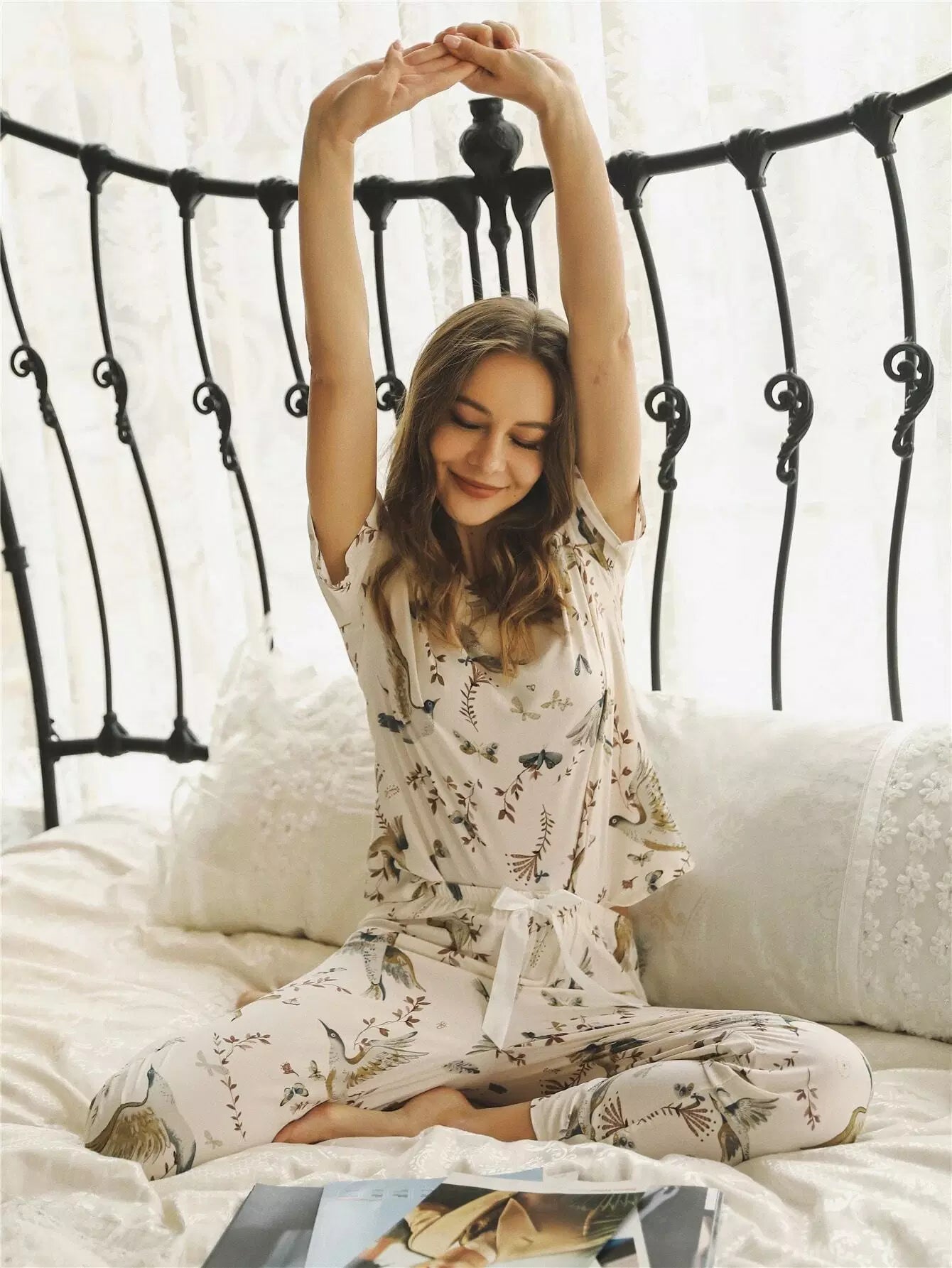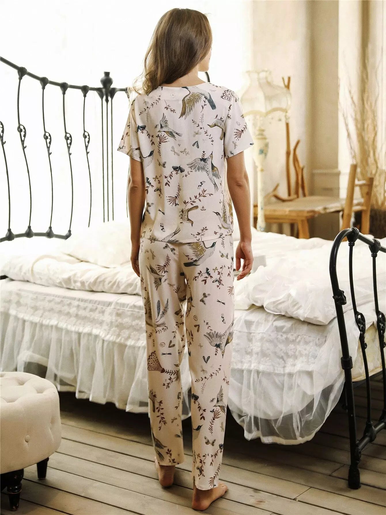 حريمي - طقم بيجامة بطبعة طيور ونباتات