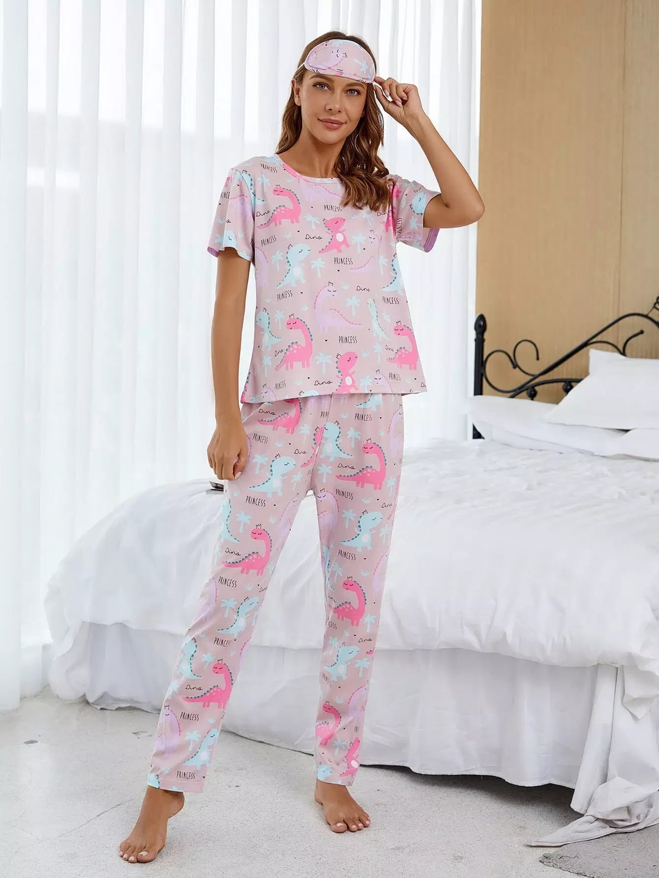 طقم بيجامات بطبعة ديناصور كرتوني وقناع للعينين