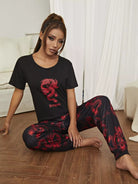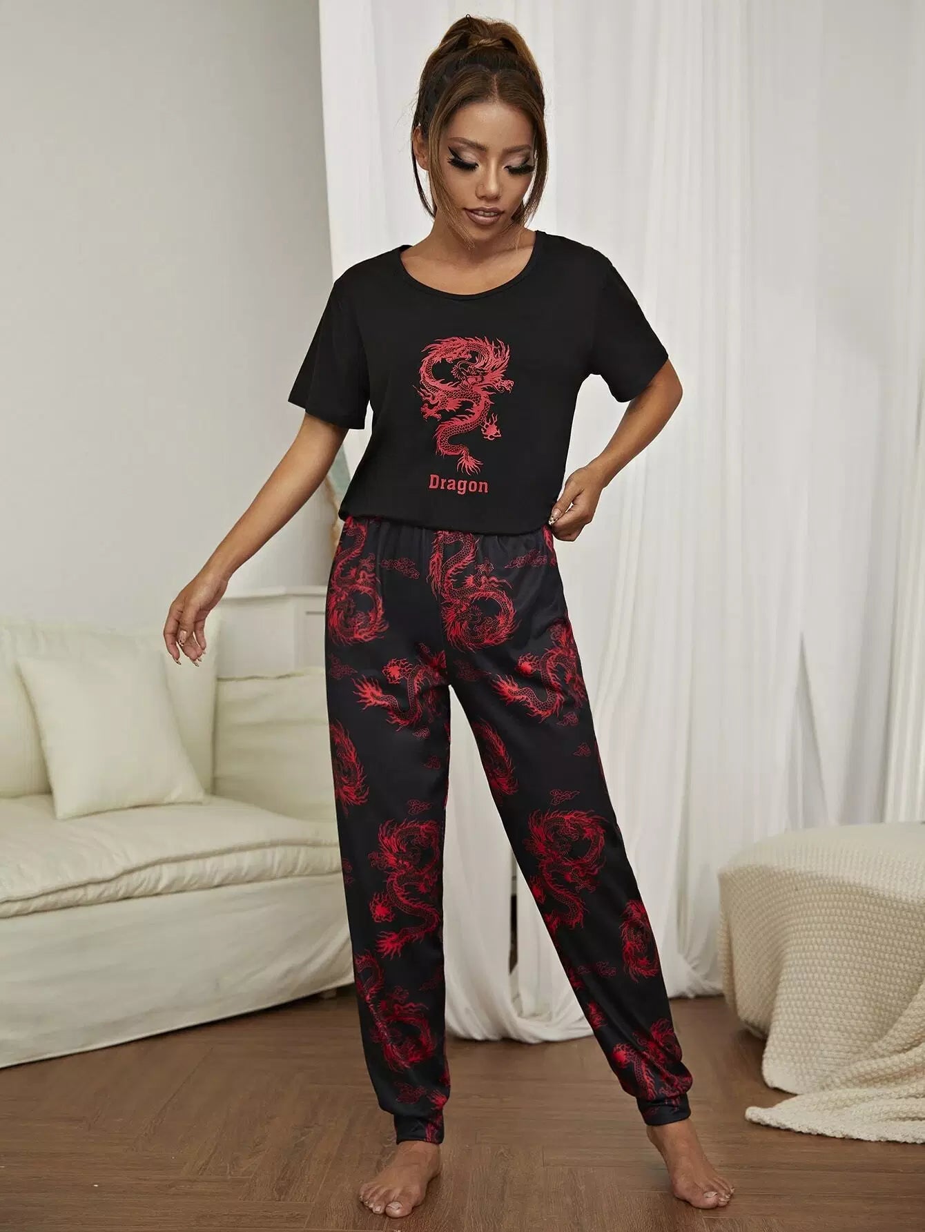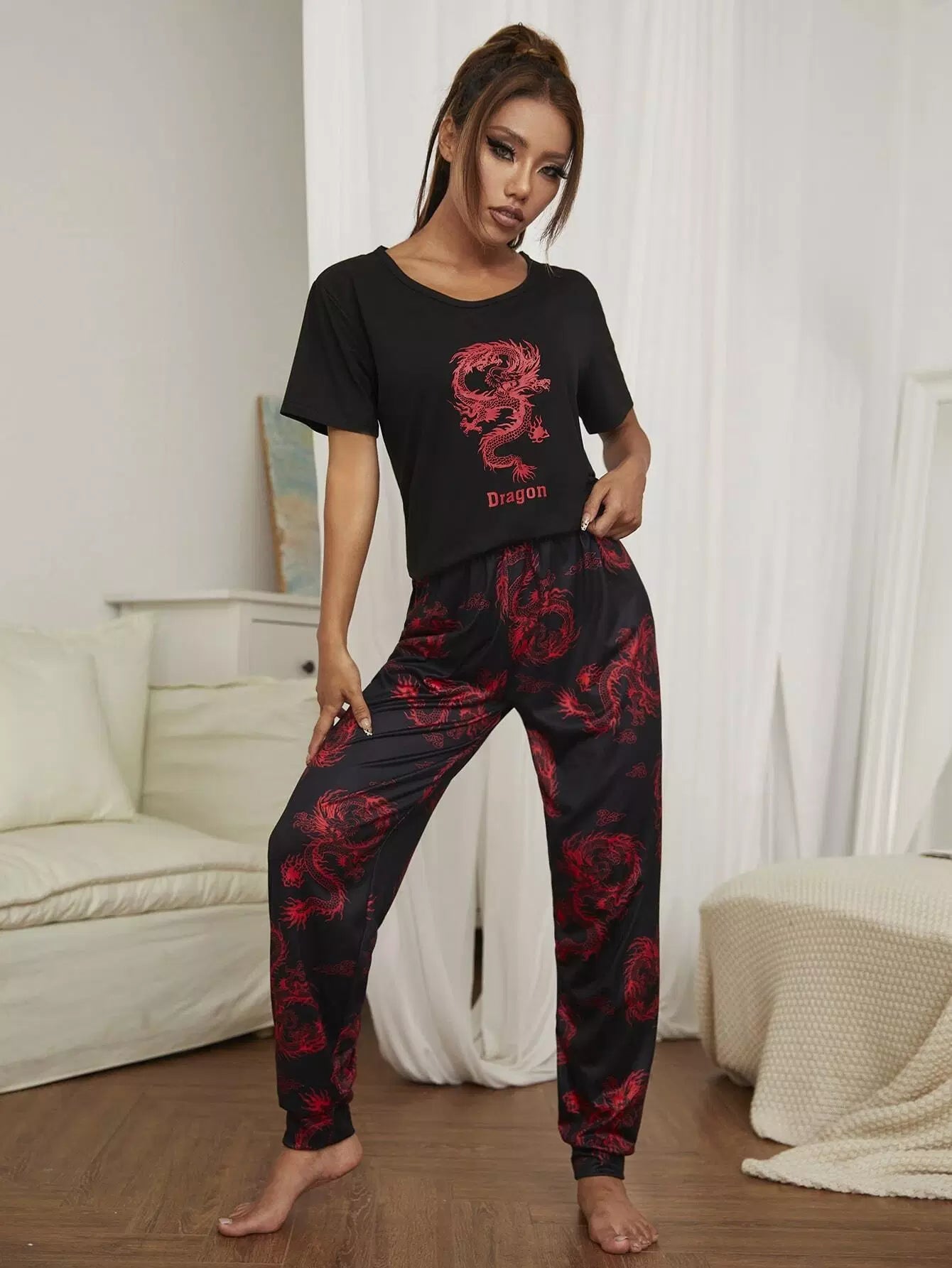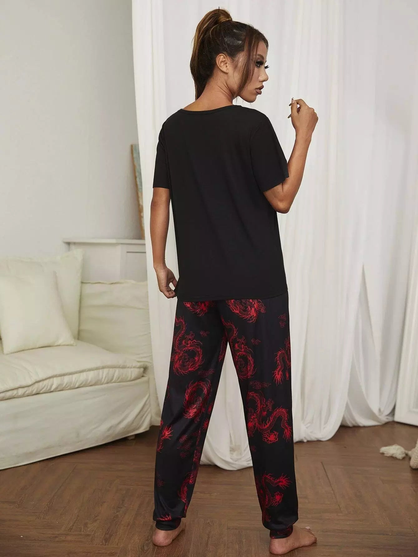 طقم بلوزة وبنطلون بيجامة بطبعة تنين صيني