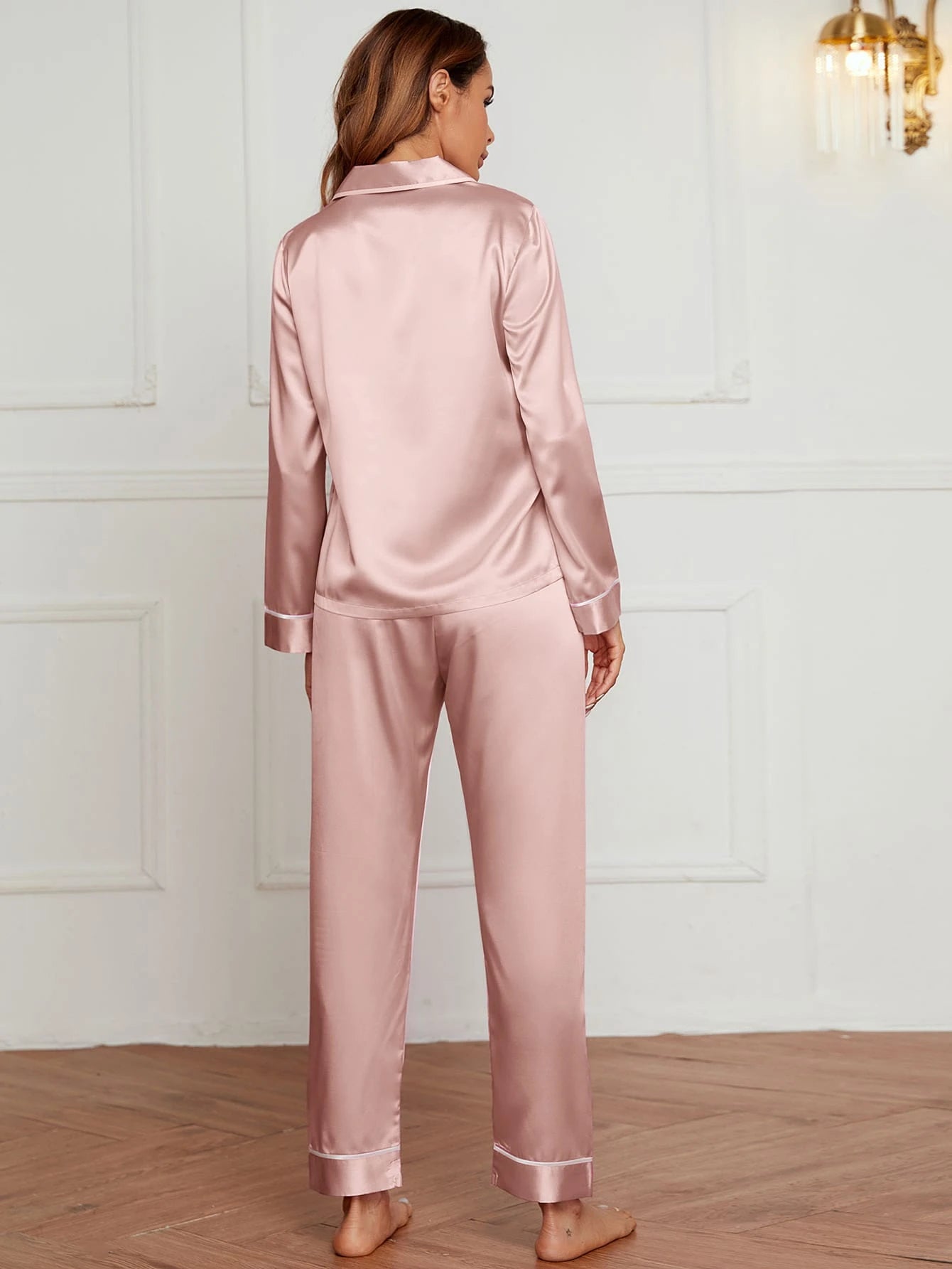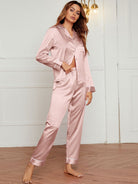 Contrast Binding Button Front Lapel Collar Satin PJ Set