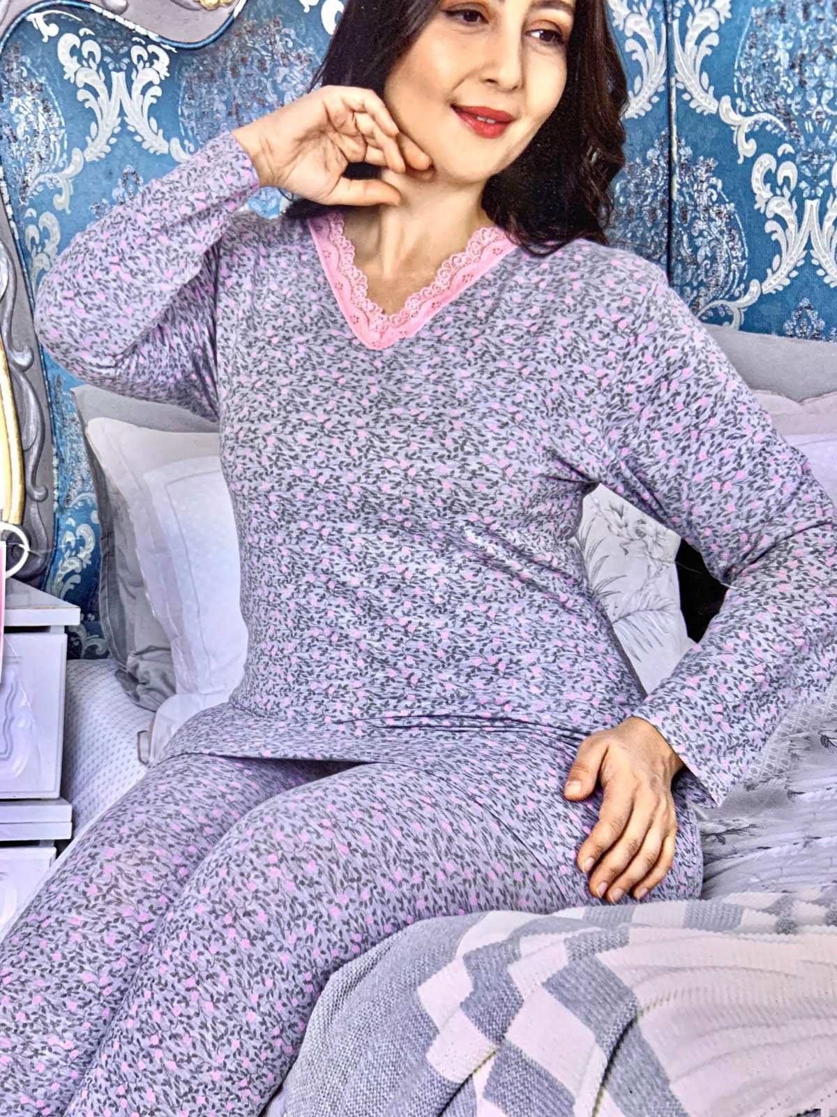 بيجامة سماوي مع طباعة زهور وردية