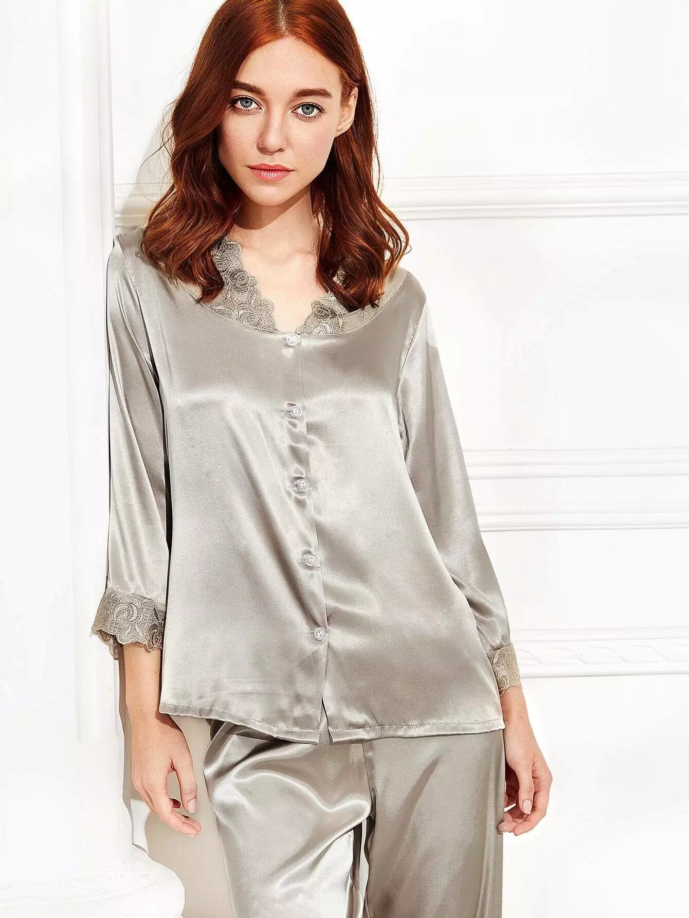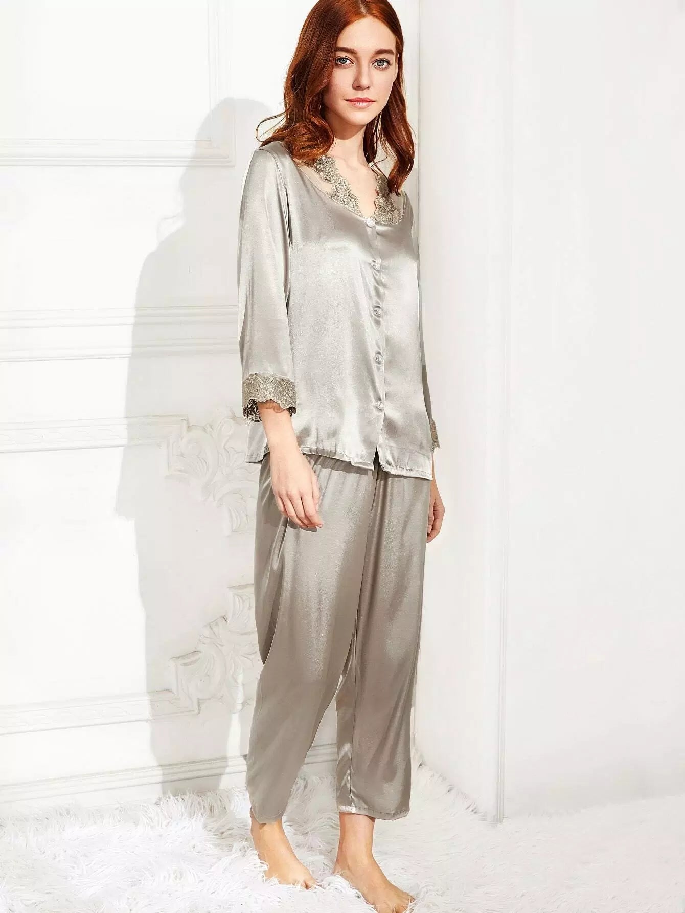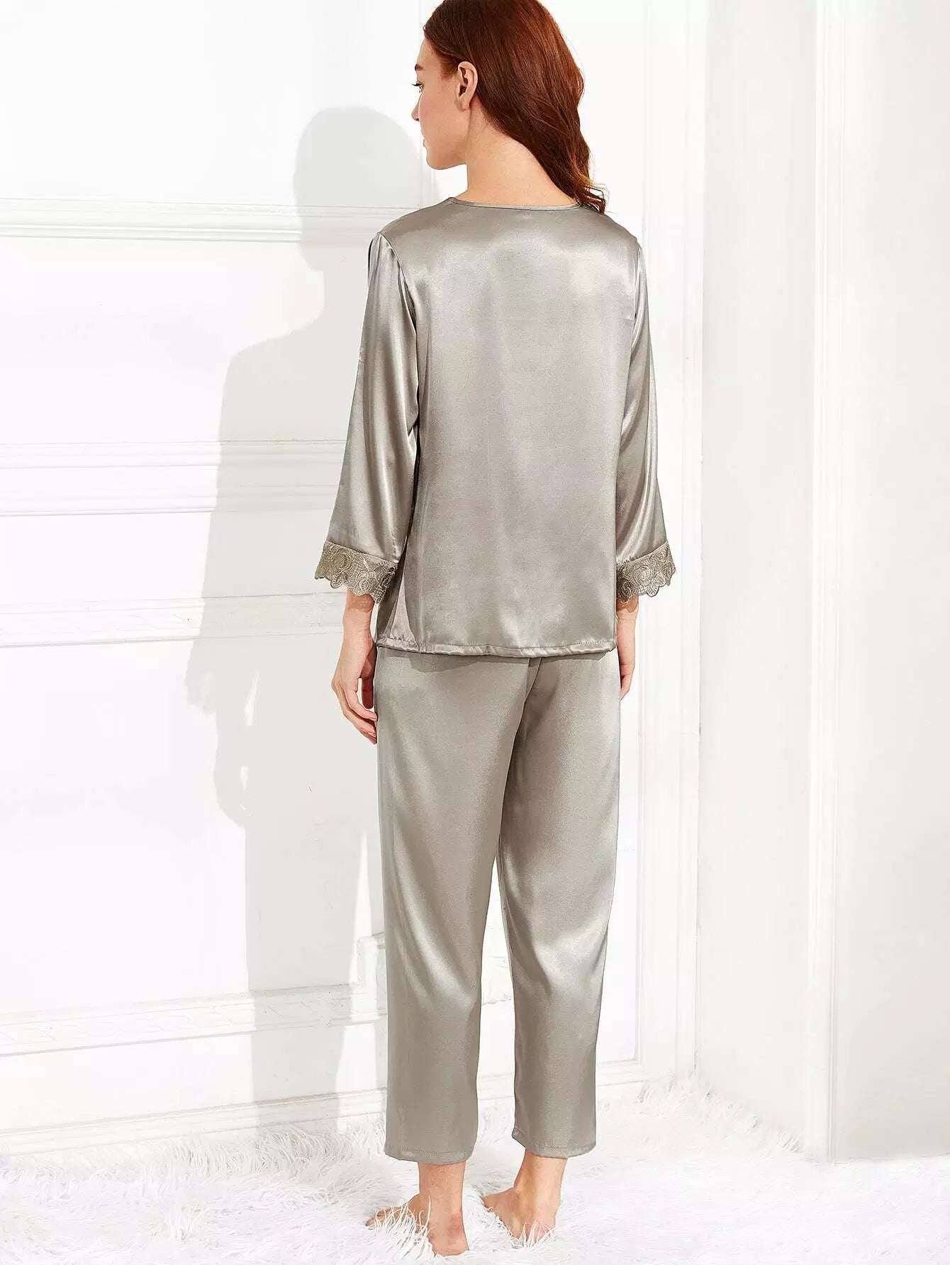 طقم بيجامة ساتان مطرز بحواف من الدانتيل المطرز