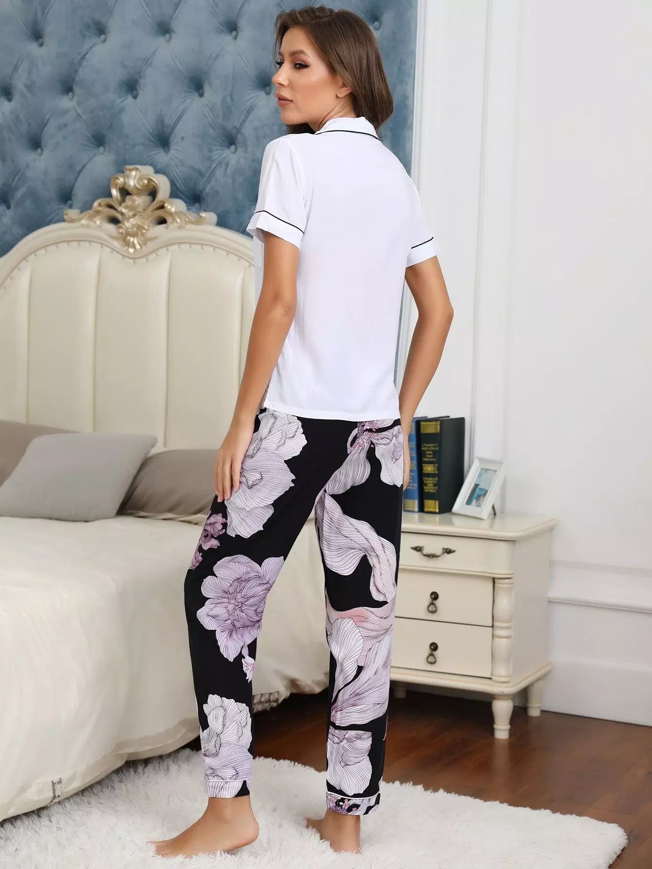 طقم بيجامة مزين بنقوش زهرية بلون مغاير
