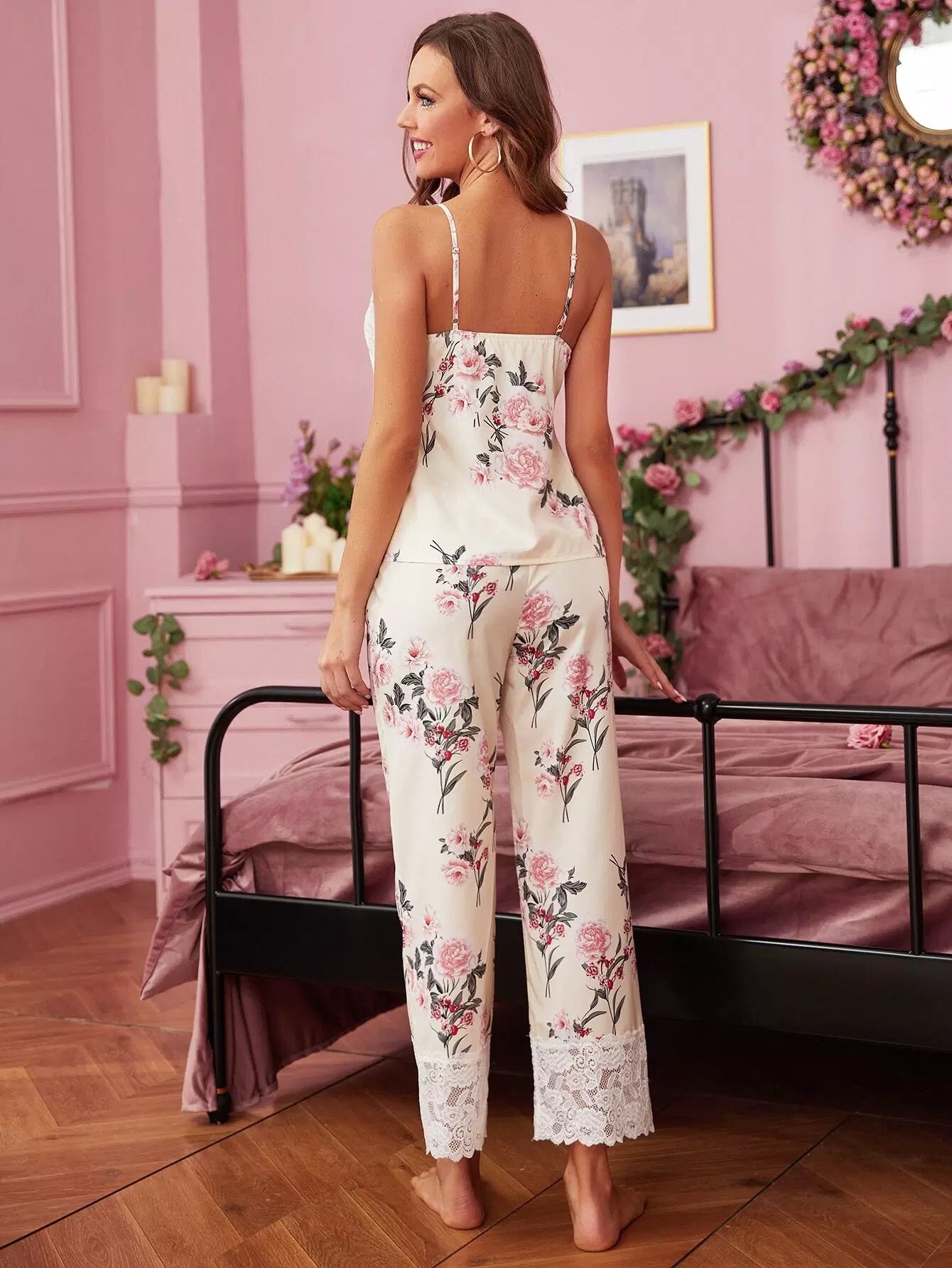 طقم بيجامة بيجامة دانتيل بطبعة زهور بلون مغاير
