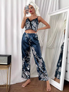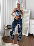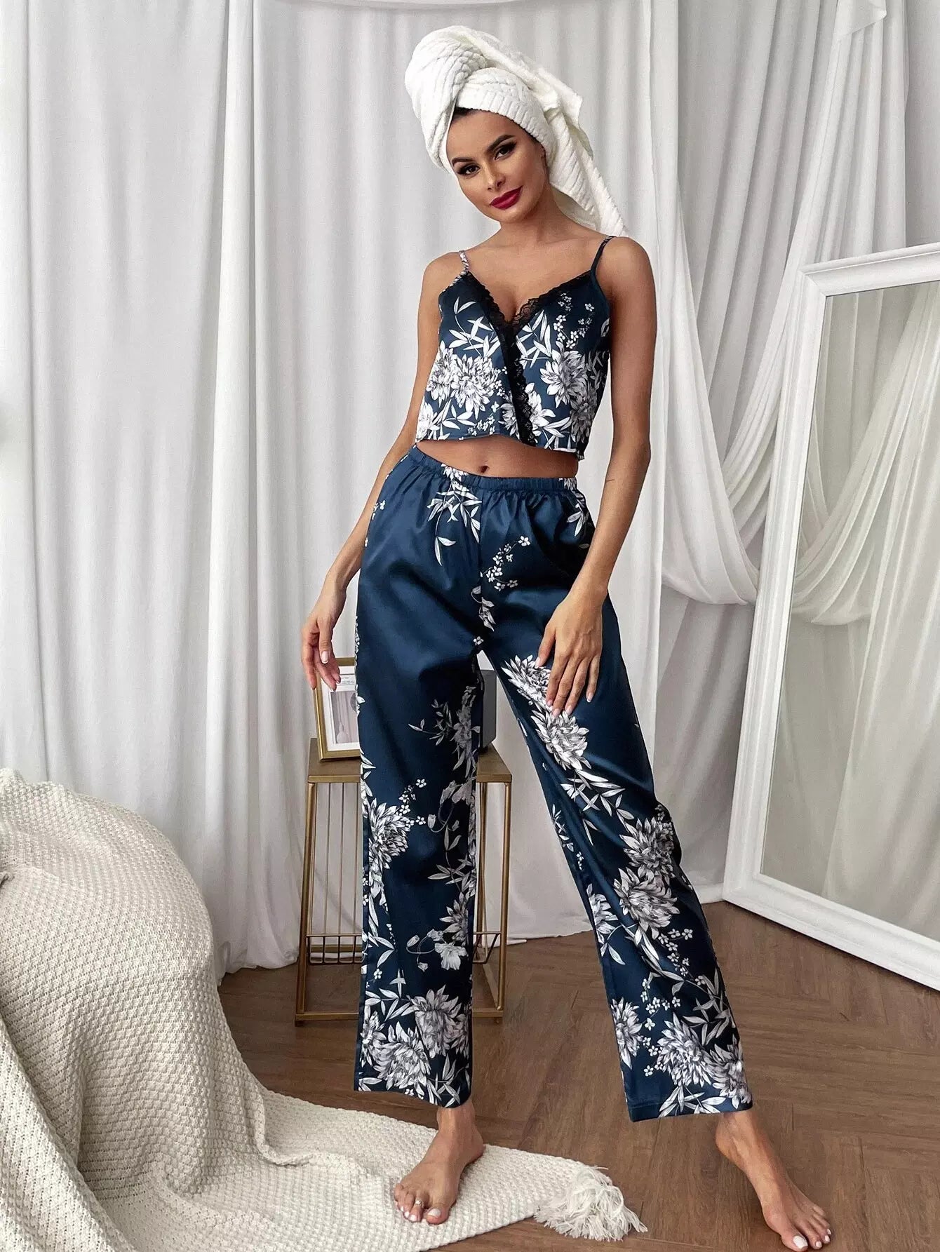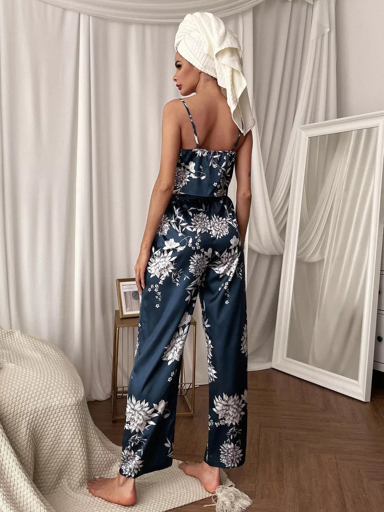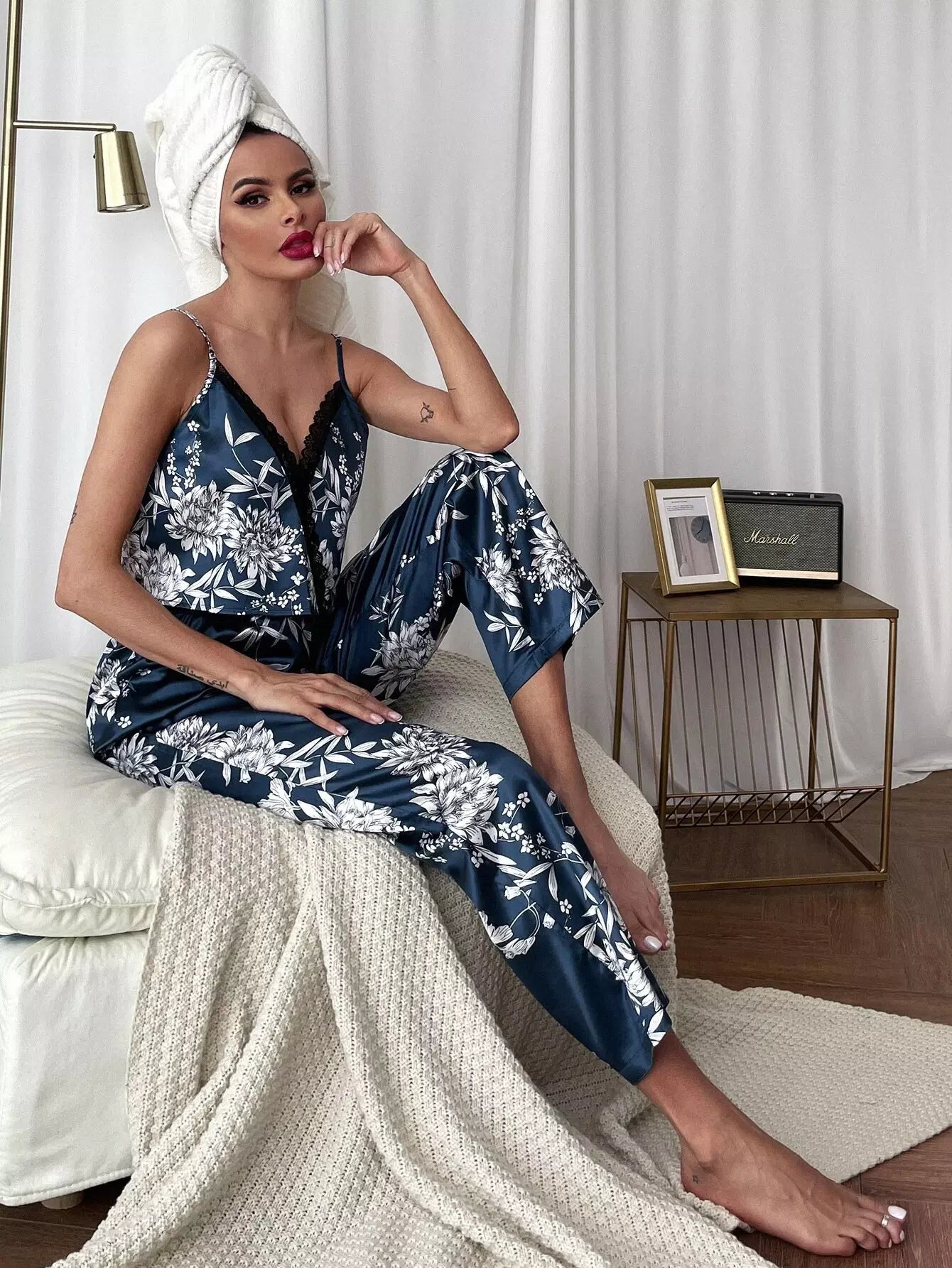 طقم ليلي من الدانتيل الساتان الدانتيل بطبعة زهور بلون مغاير