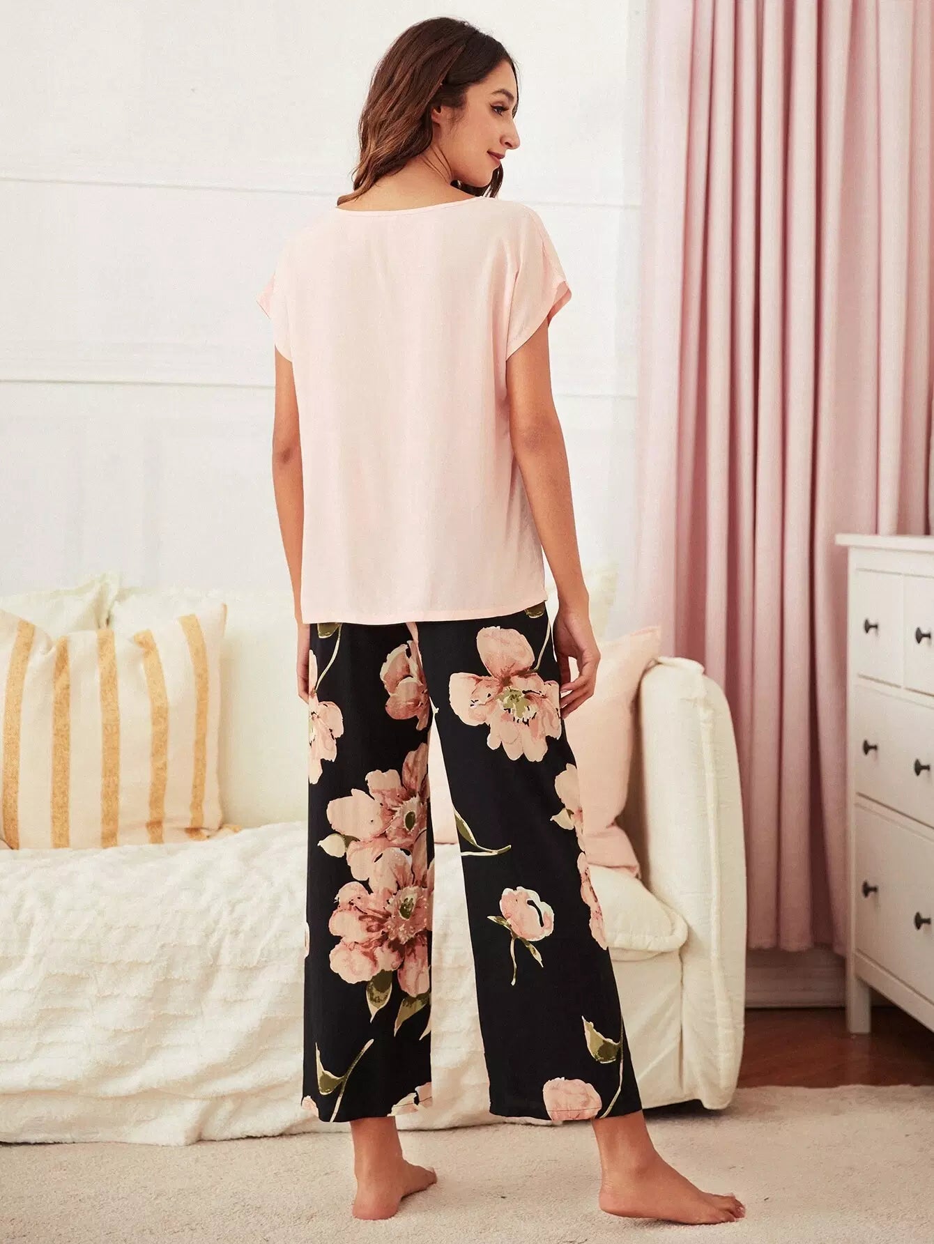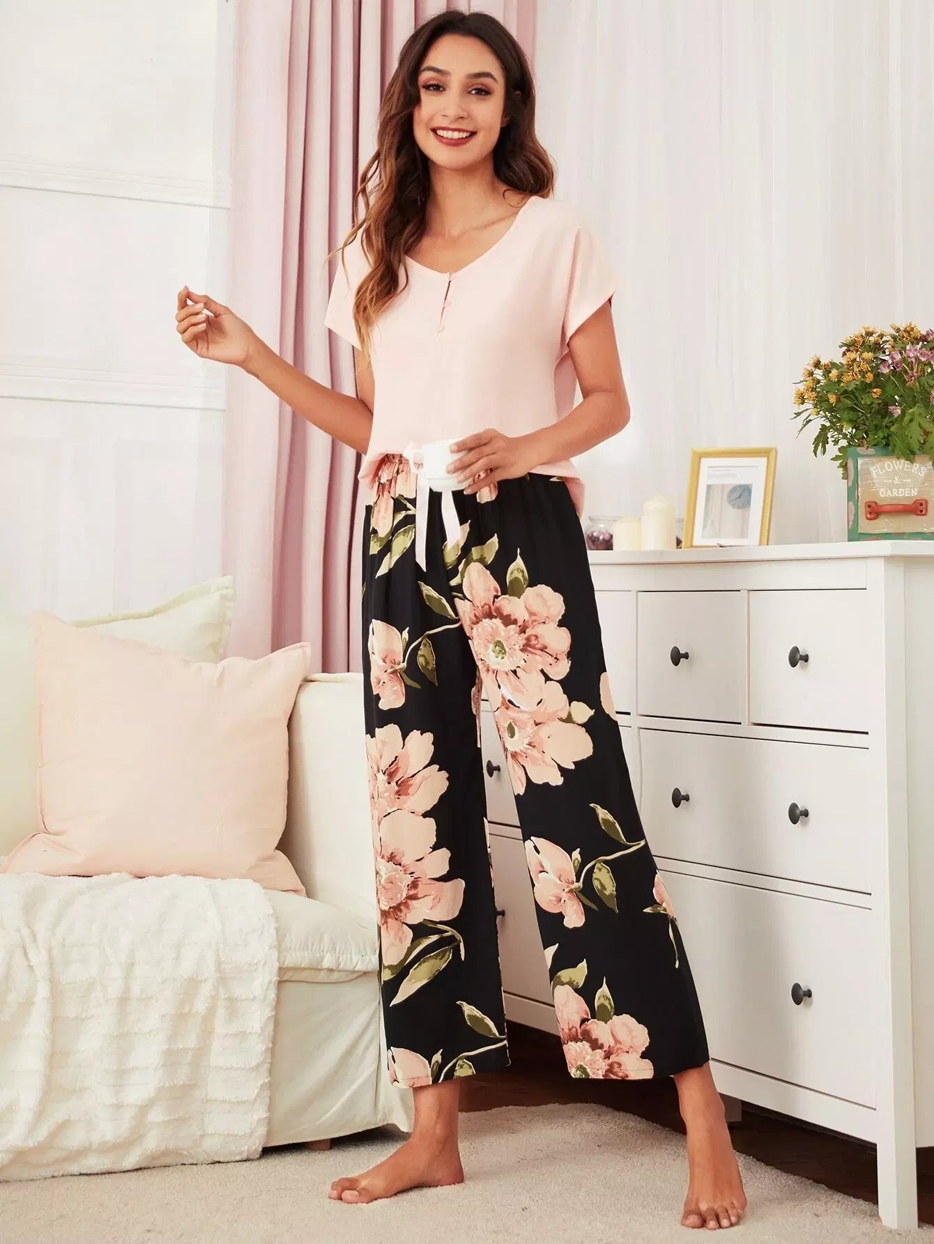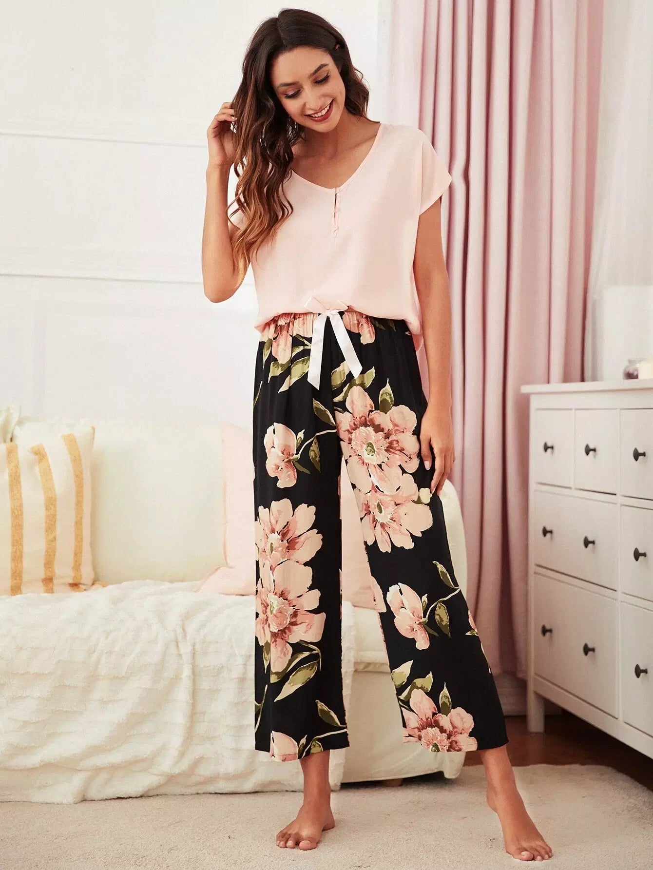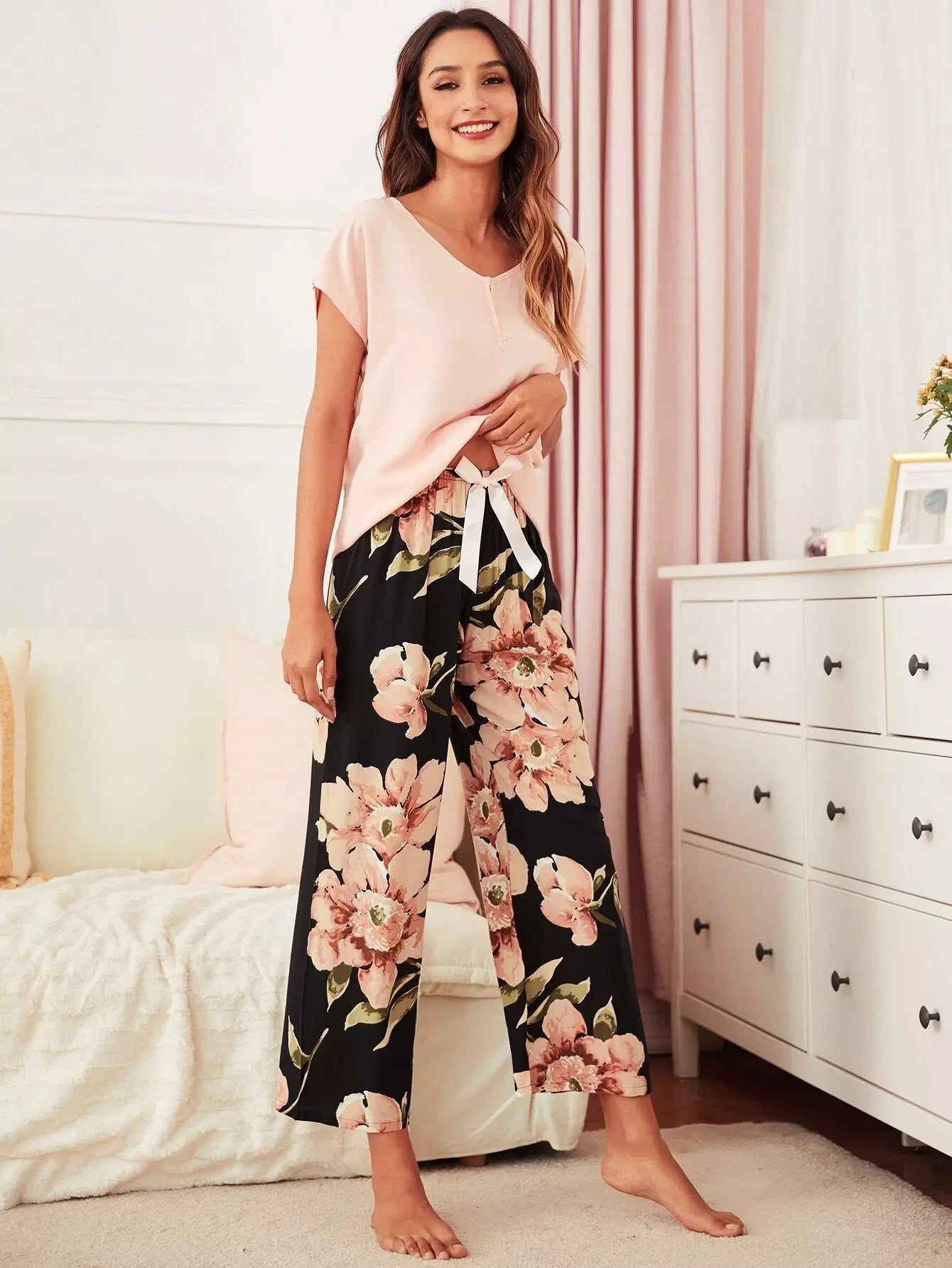طقم بيجامة مطبوع عليه عقدة أمامية بطبعة زهور