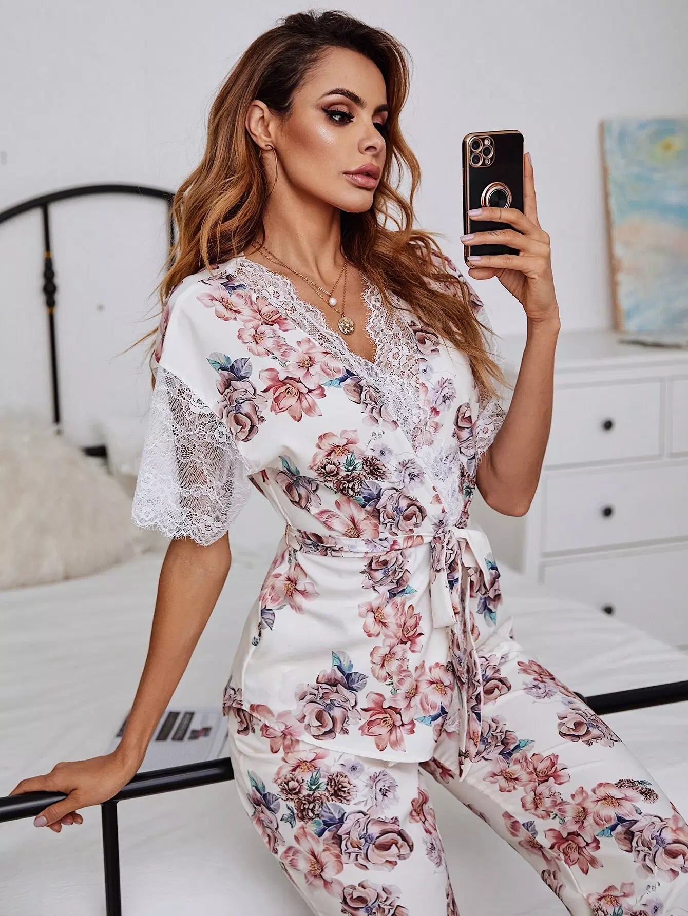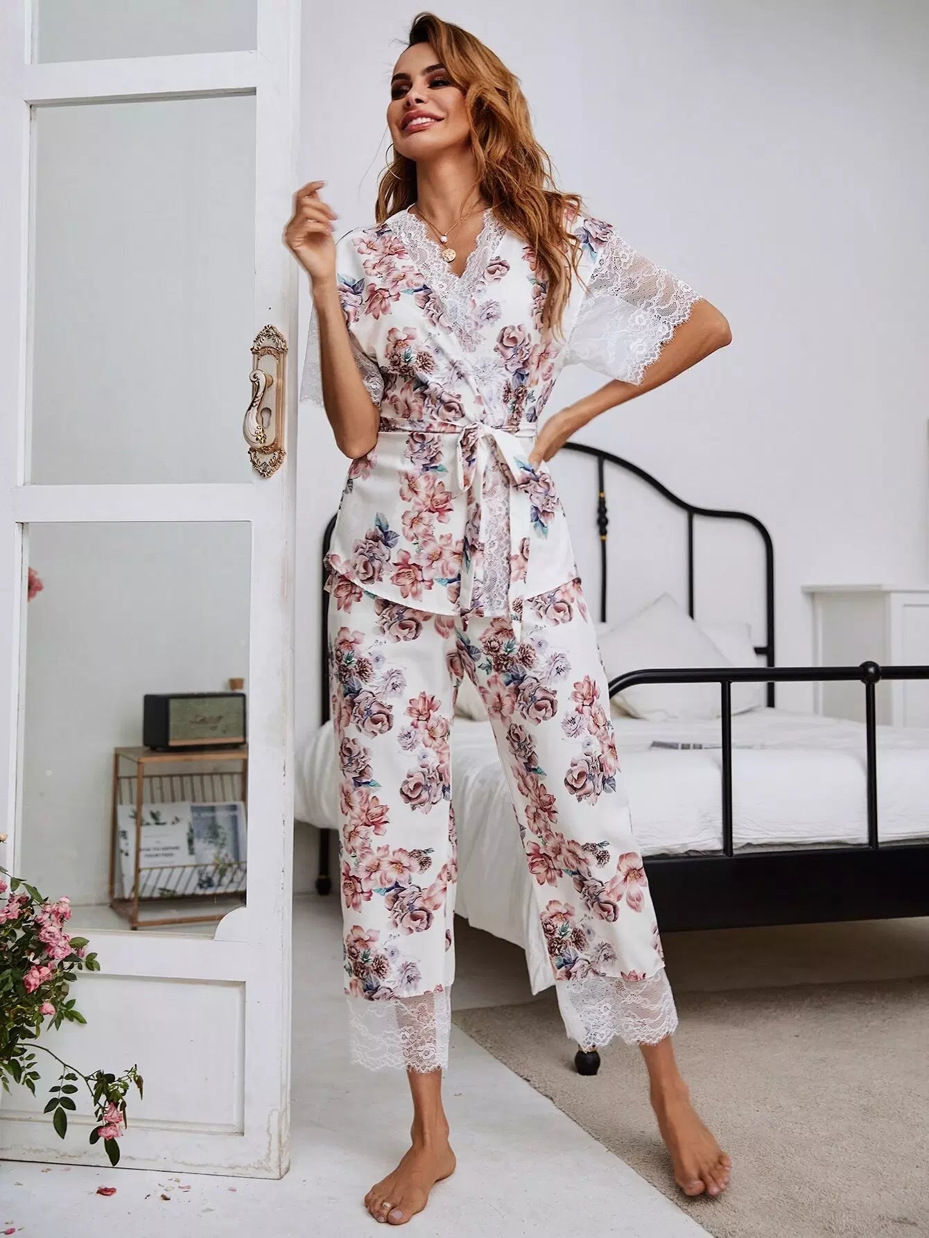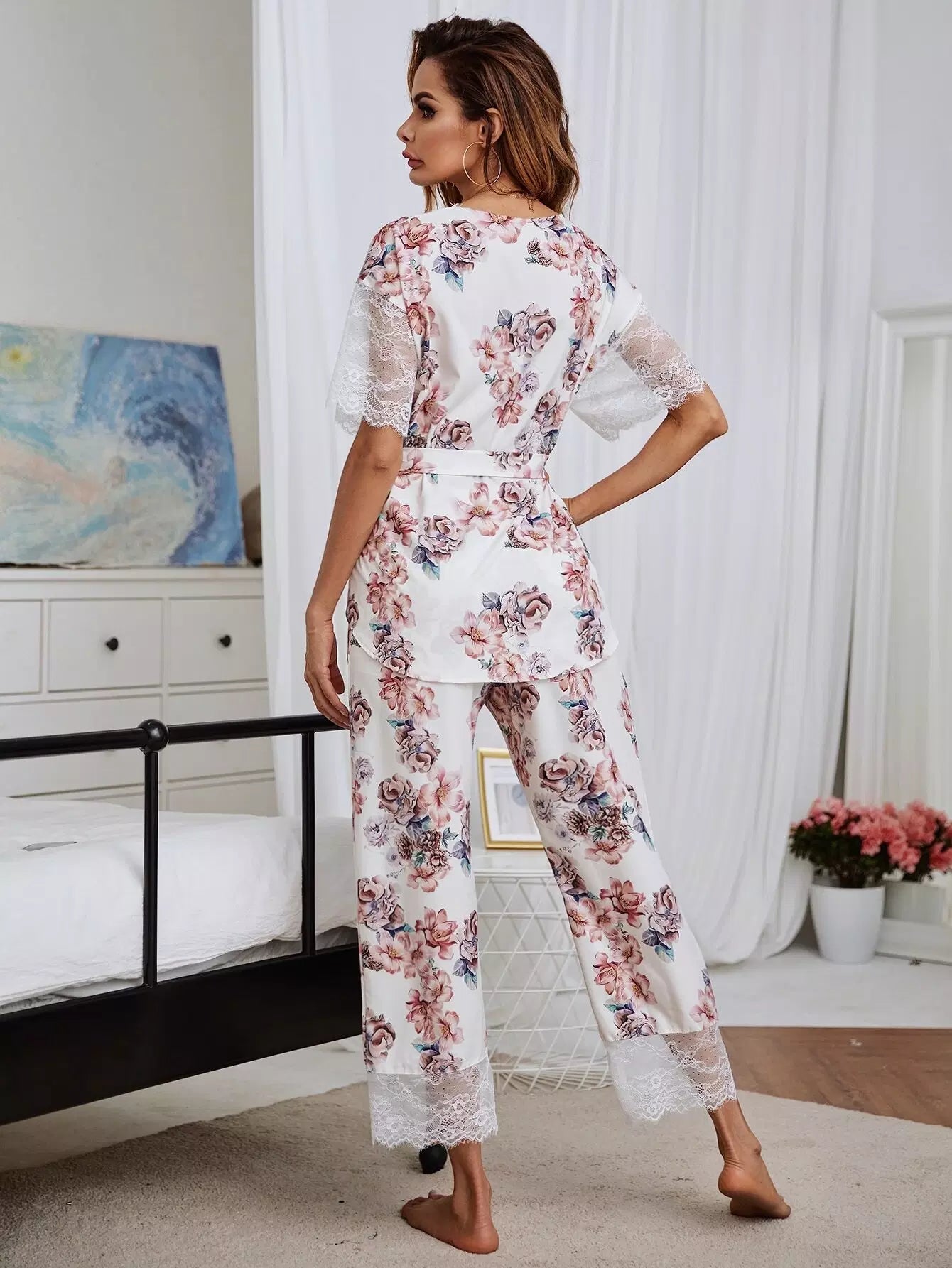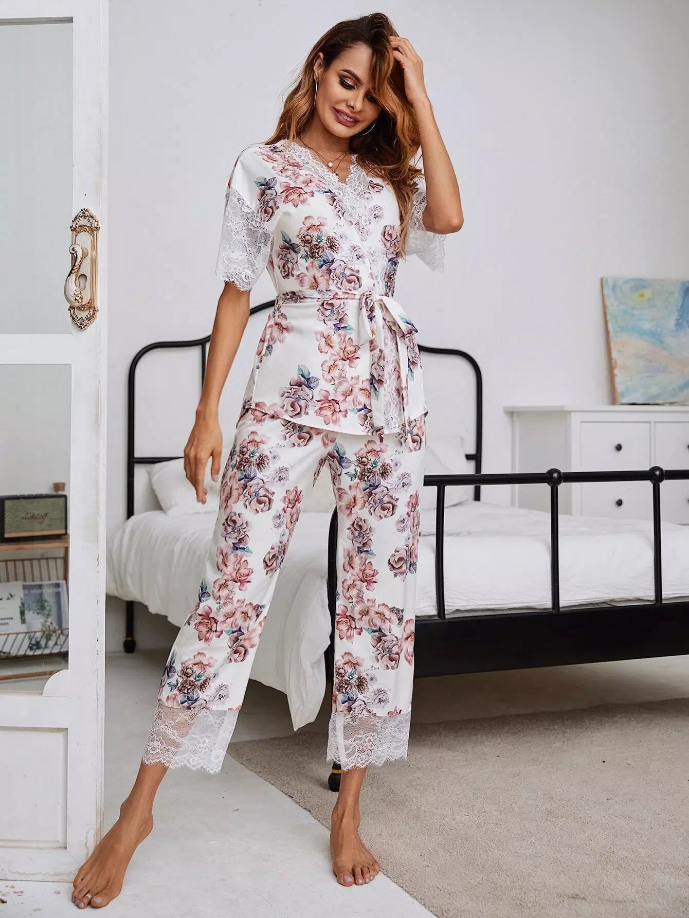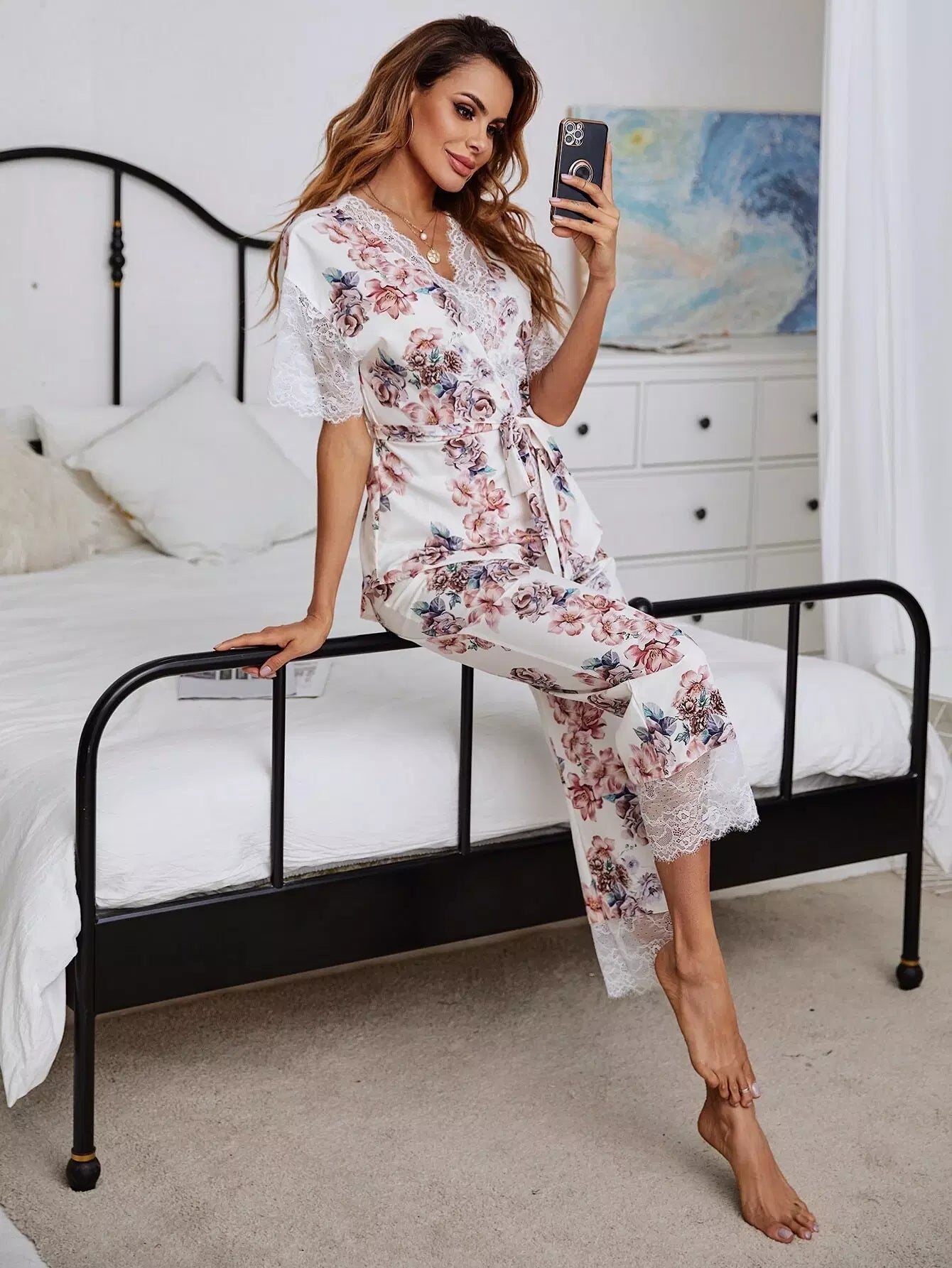 طقم بيجامة روب وسروال بتفاصيل دانتيل وطبعة زهور بدون حزام