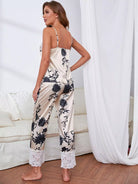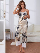 طقم قمصان وبنطال بيجامة بنقشة زهور من الساتان المزين بالدانتيل