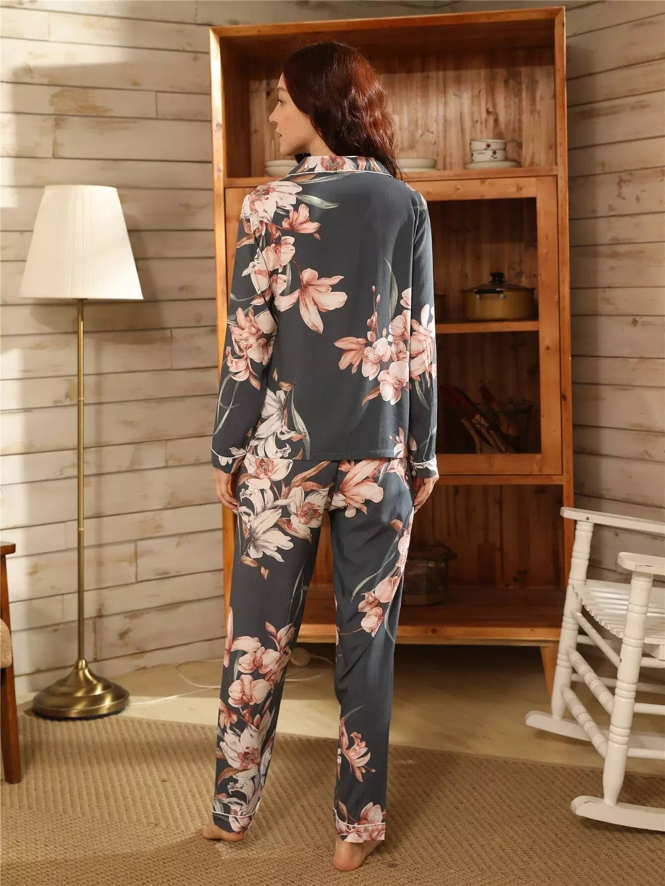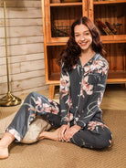 طقم بيجامة برقبة رقبة على شكل أزهار مطبوع عليه رقبة على شكل أزهار