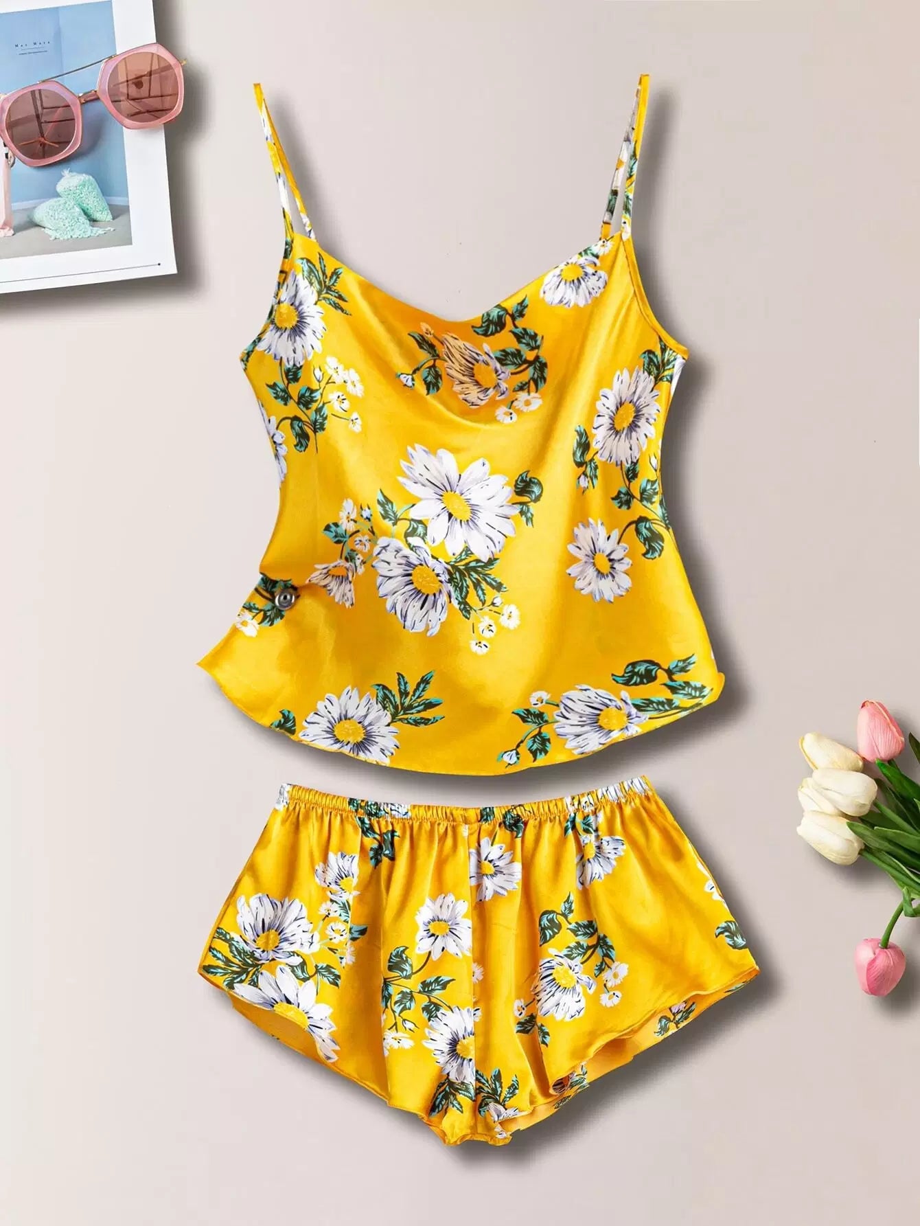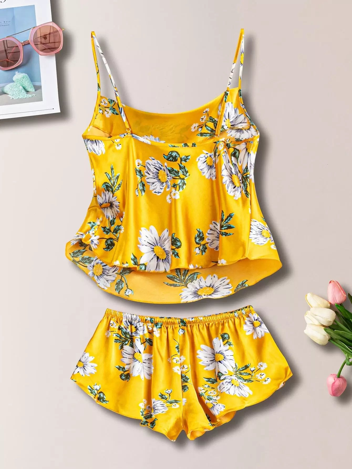 طقم ليلي من الساتان المطبوع بالورود