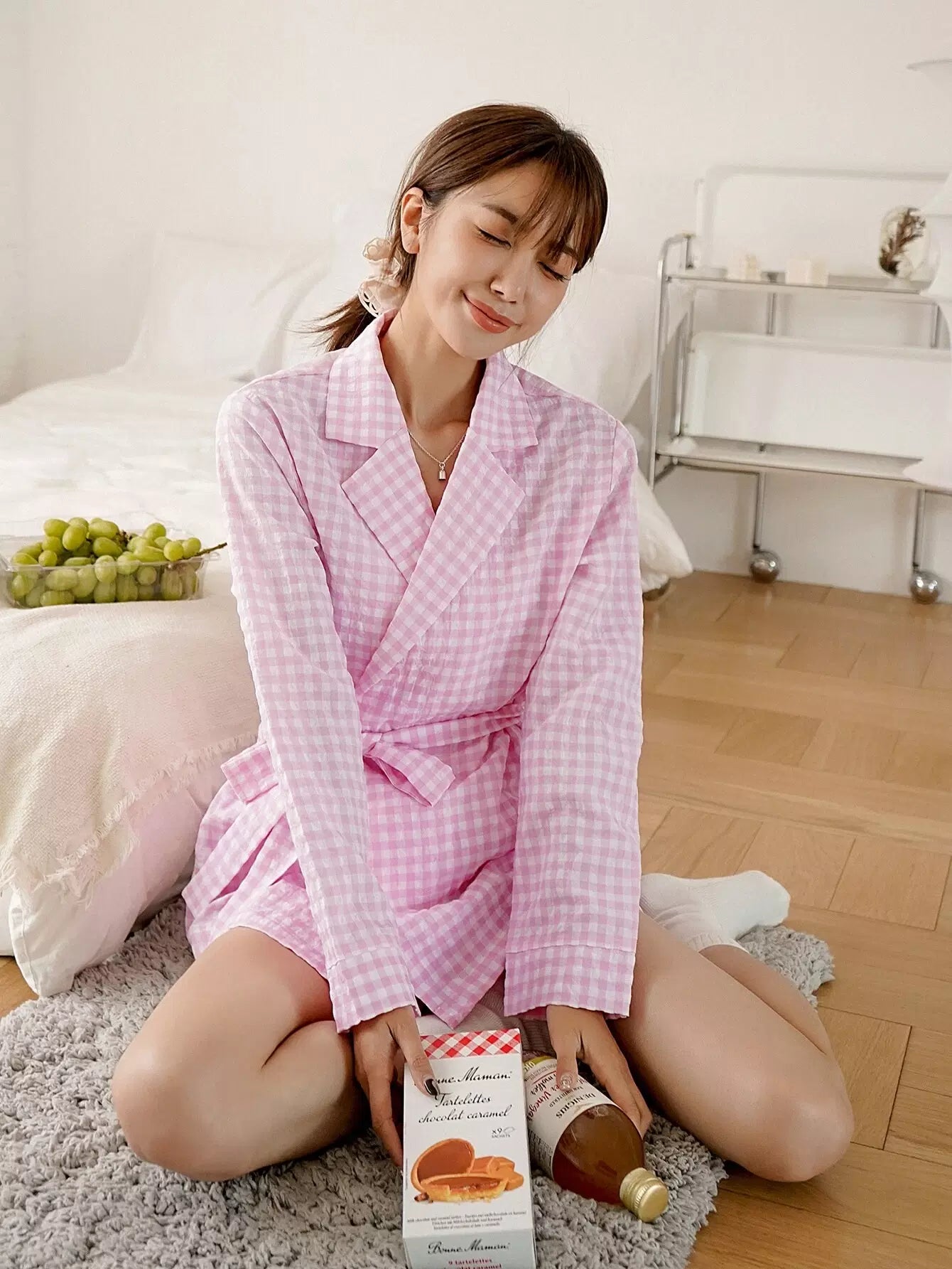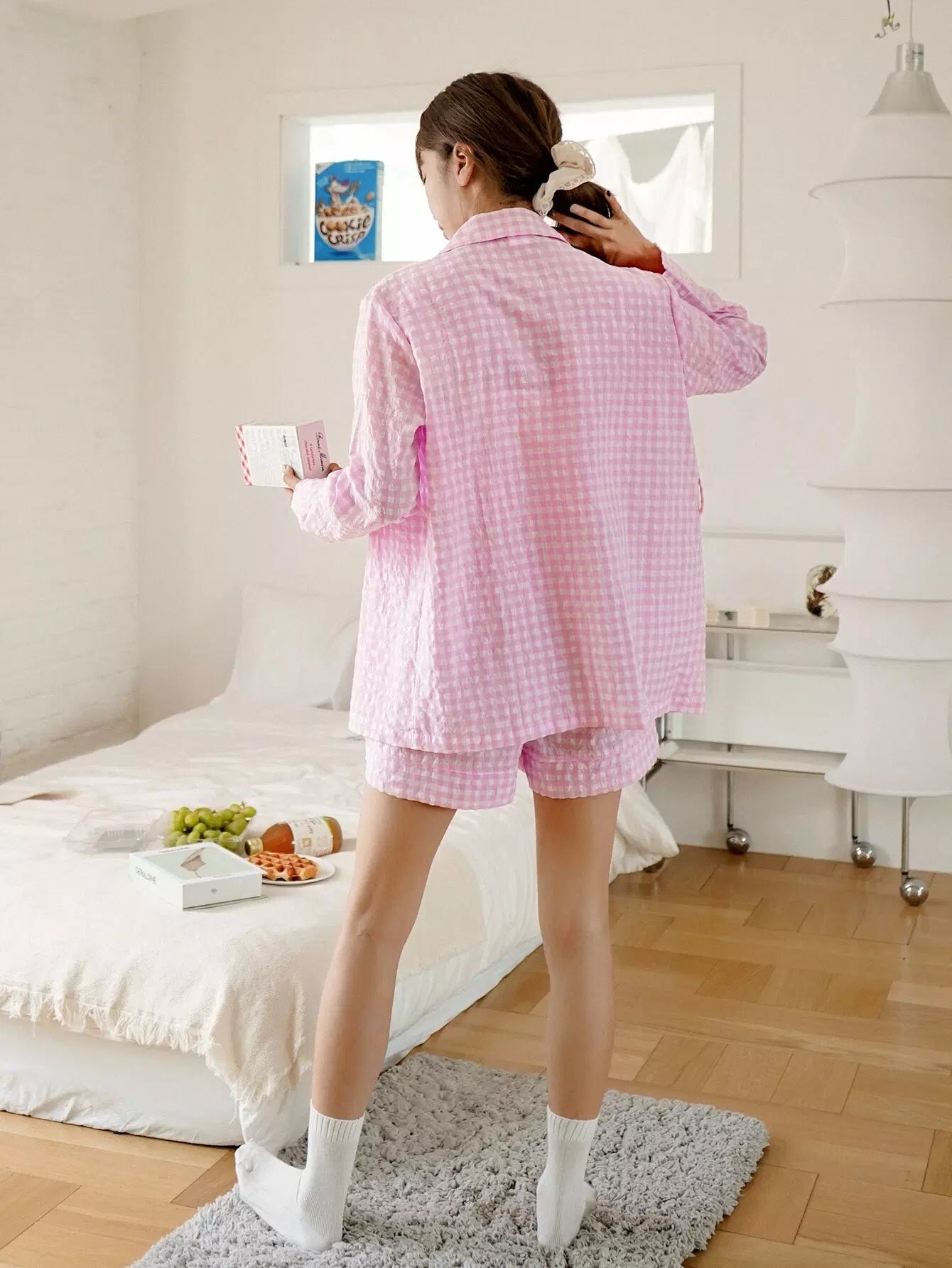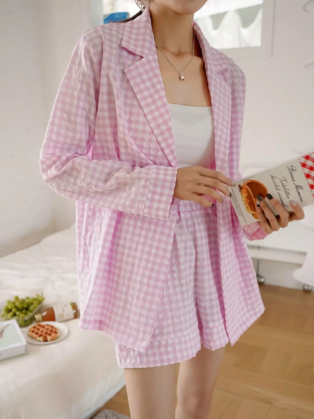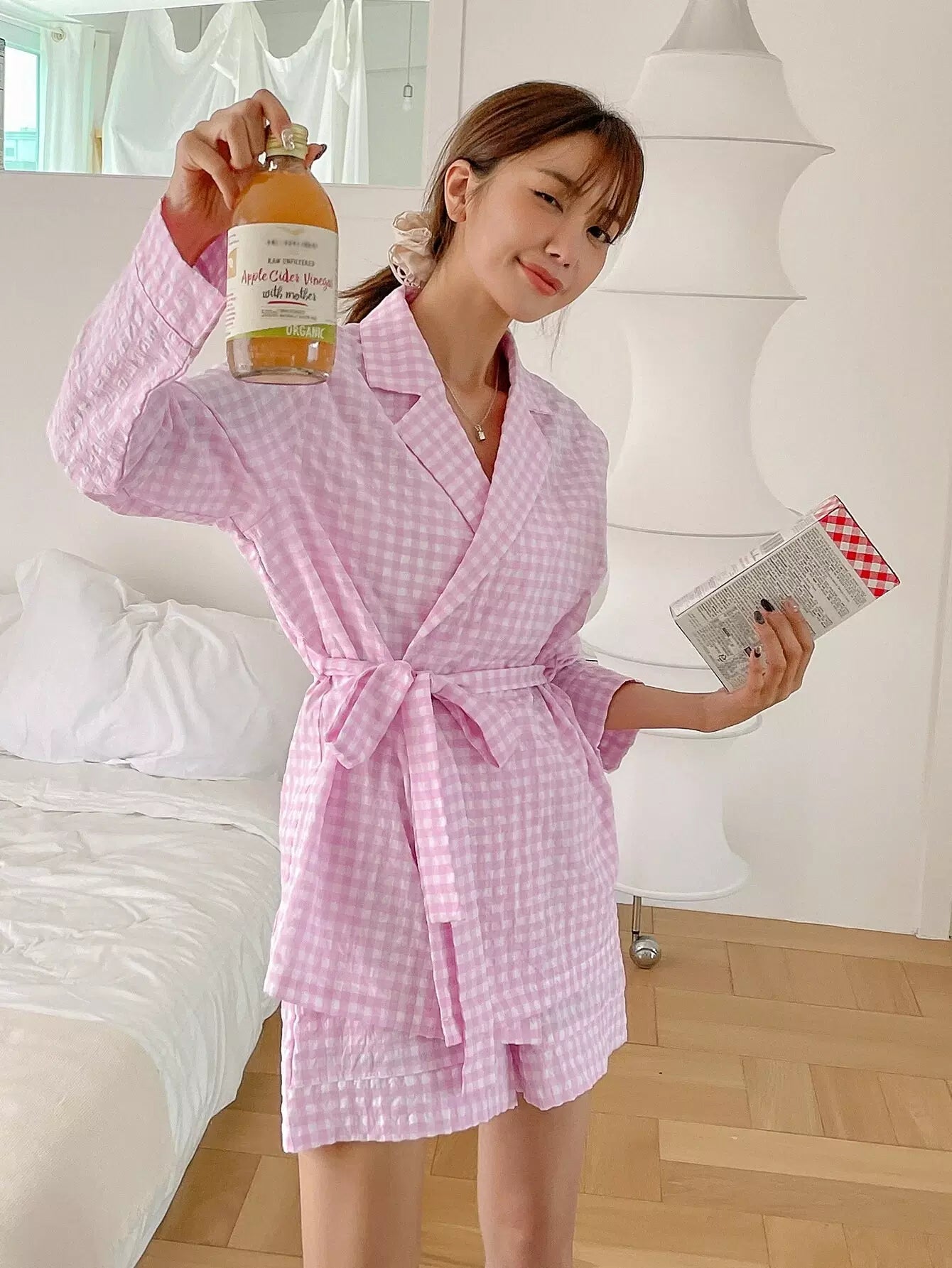 طقم بيجامة بطبعة جينجهام بدون حزام