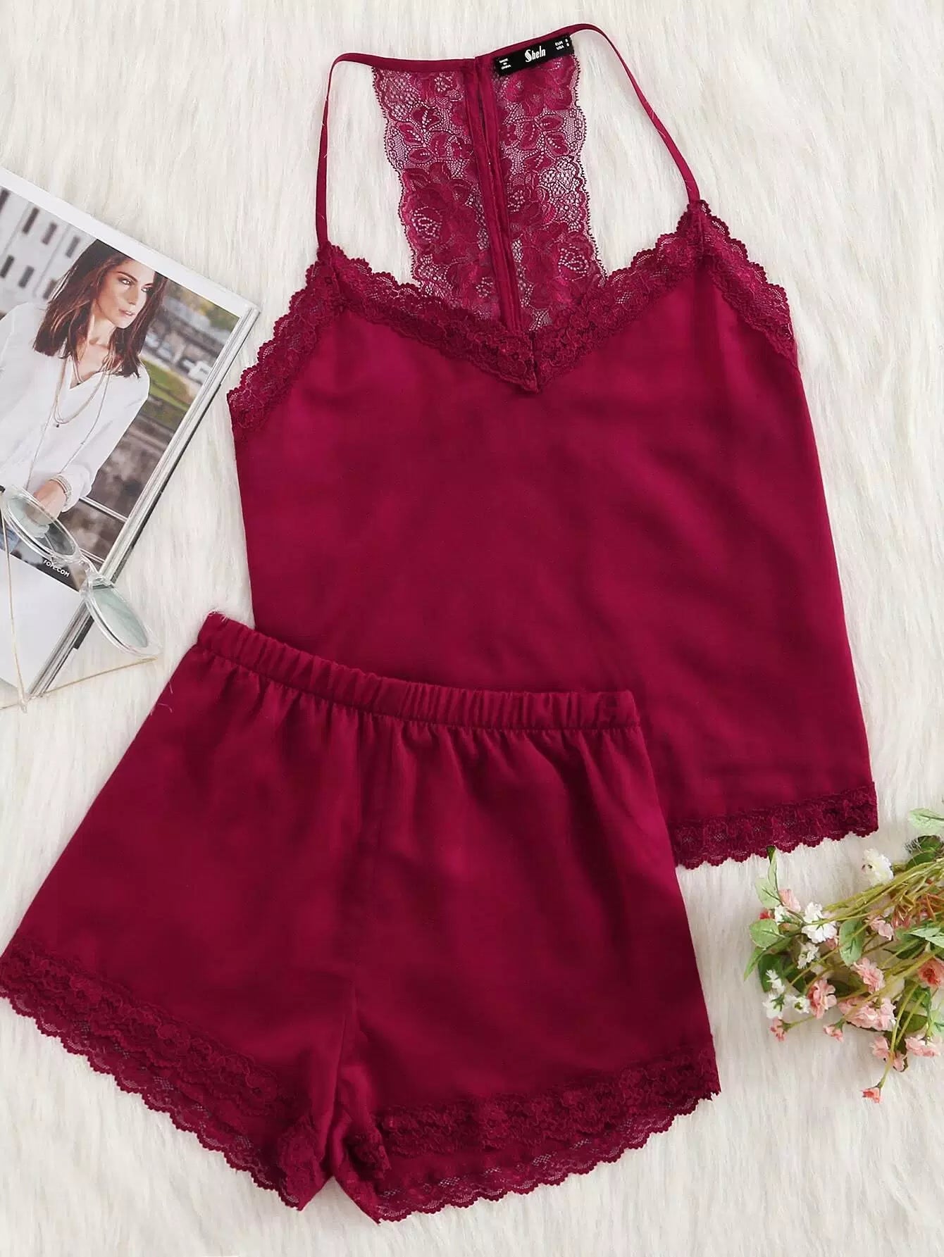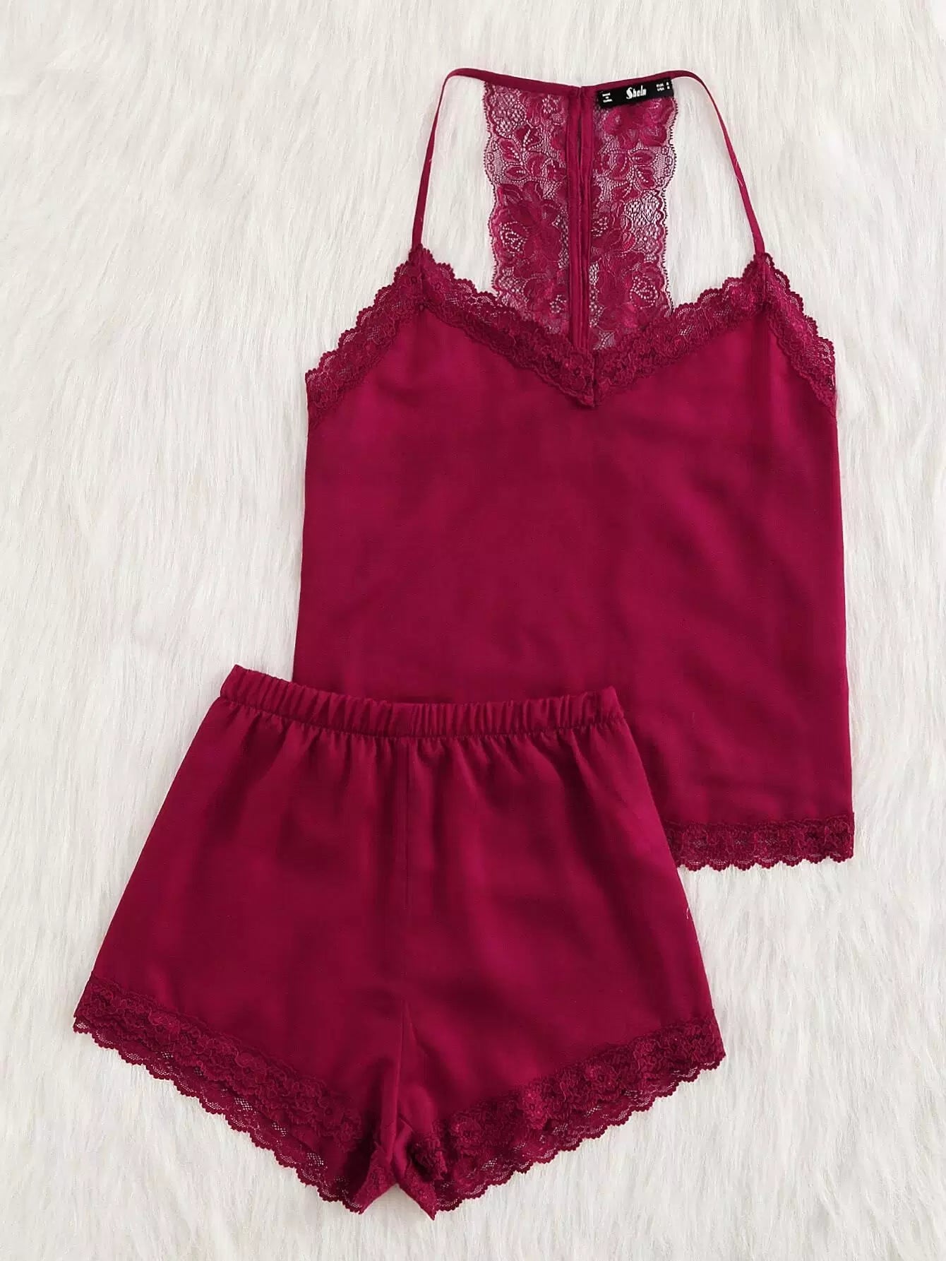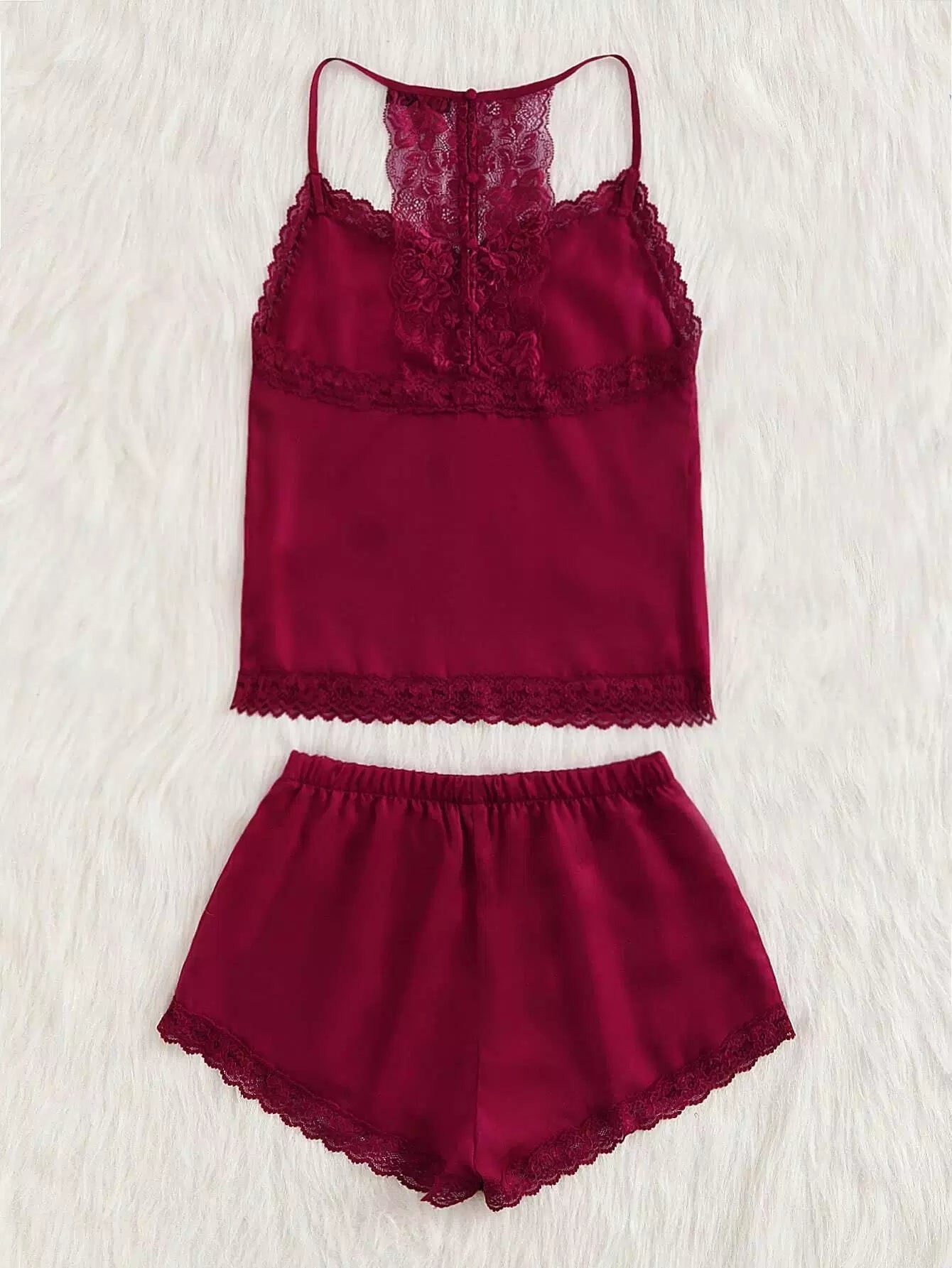 طقم بيجامة دانتيل برقبة من الدانتيل وشورت قصير