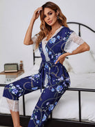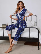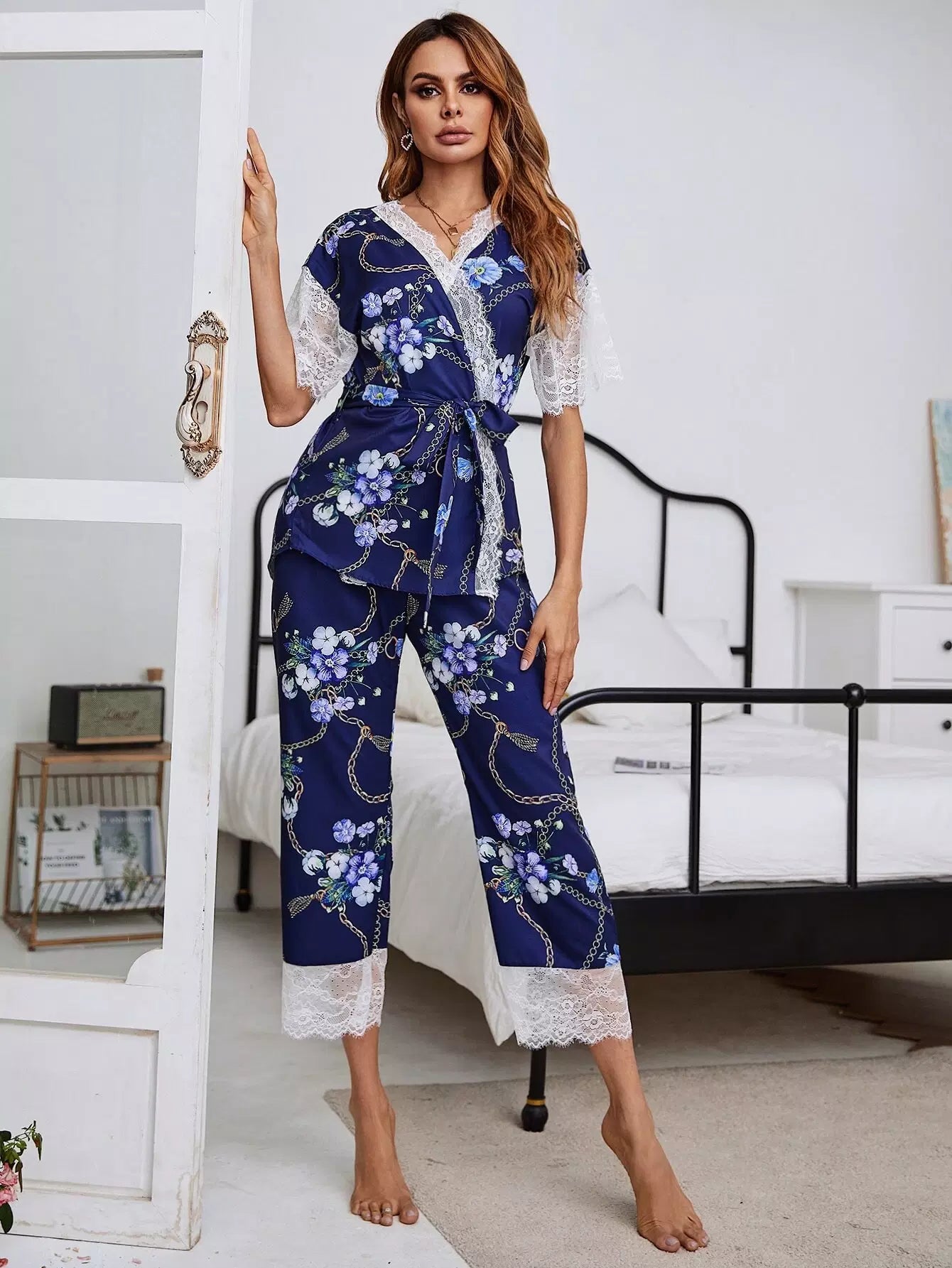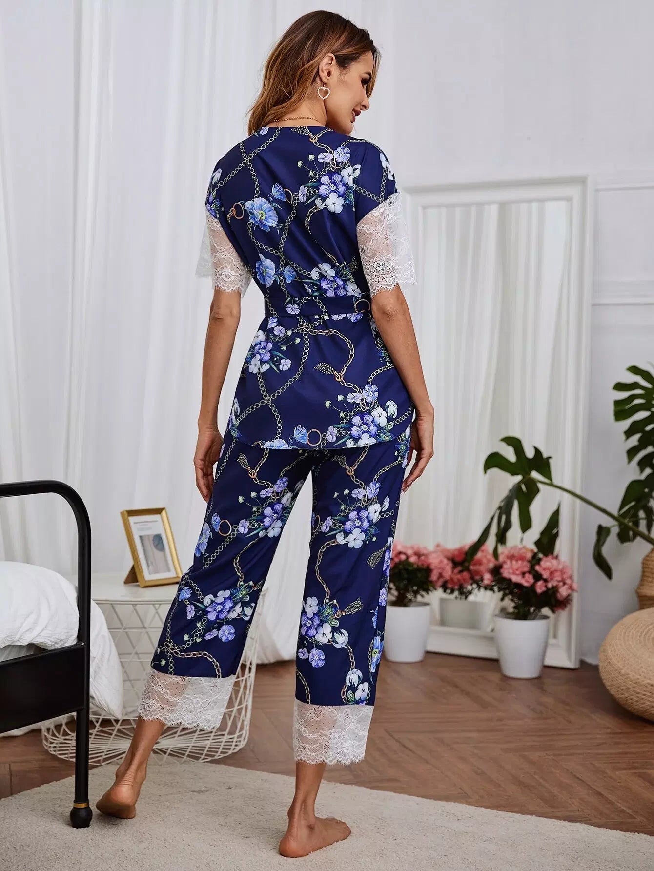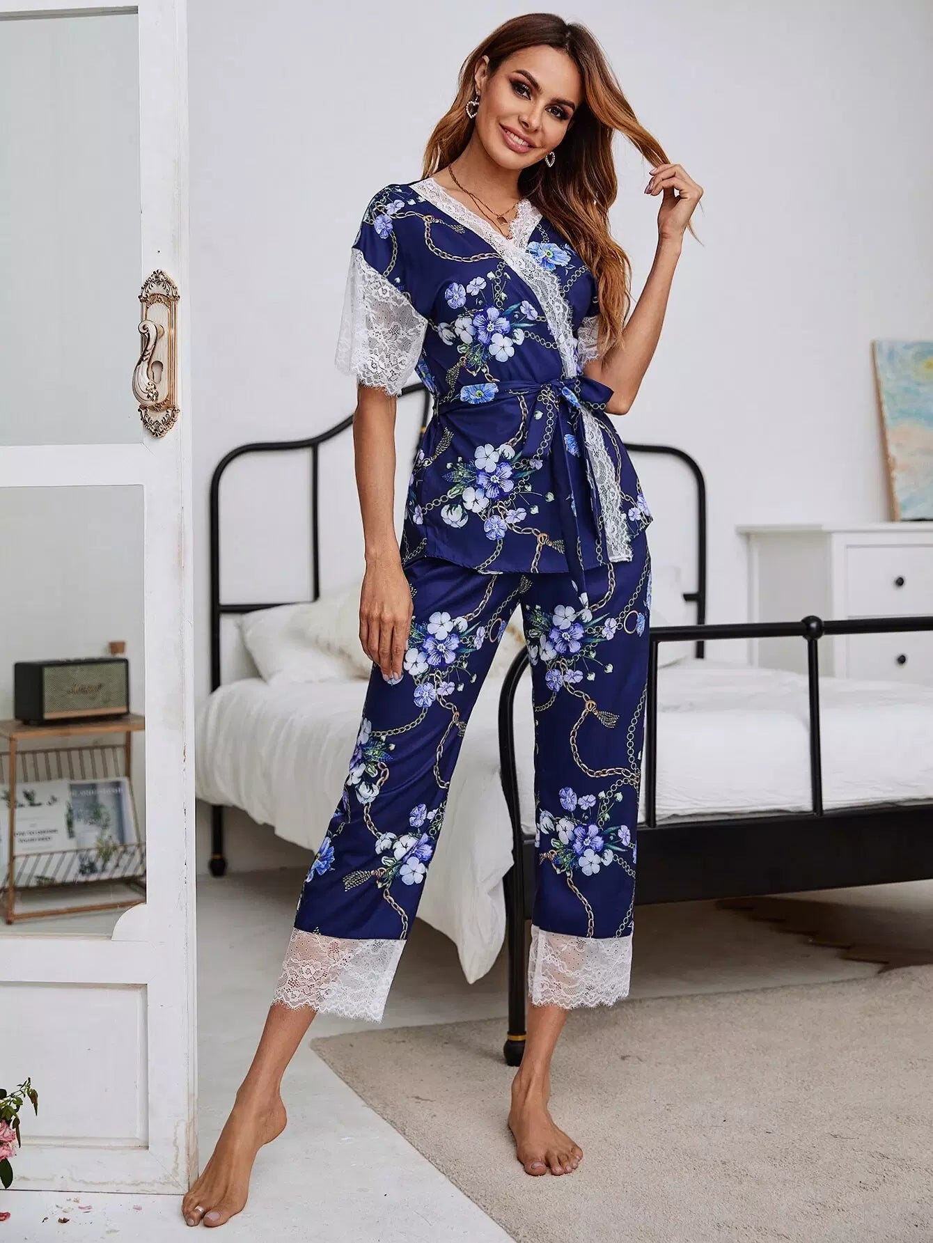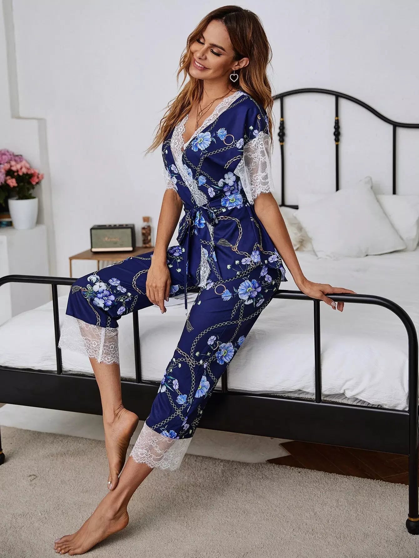 طقم ليلي بسلسلة من الدانتيل وطبعة زهور بدون حزام