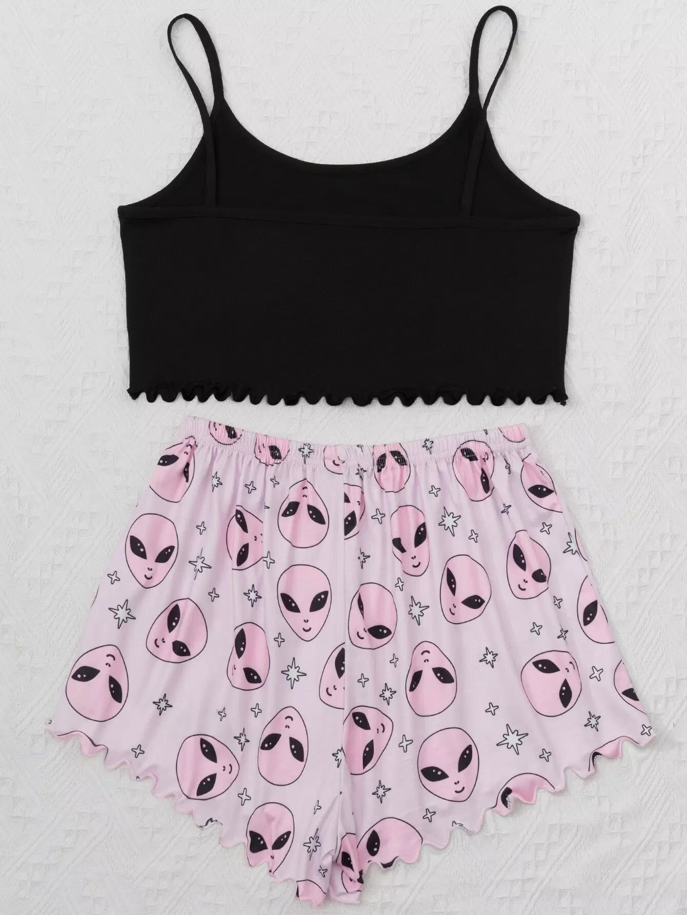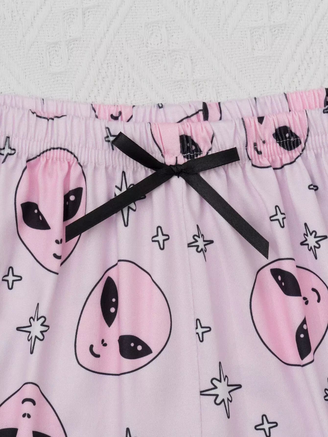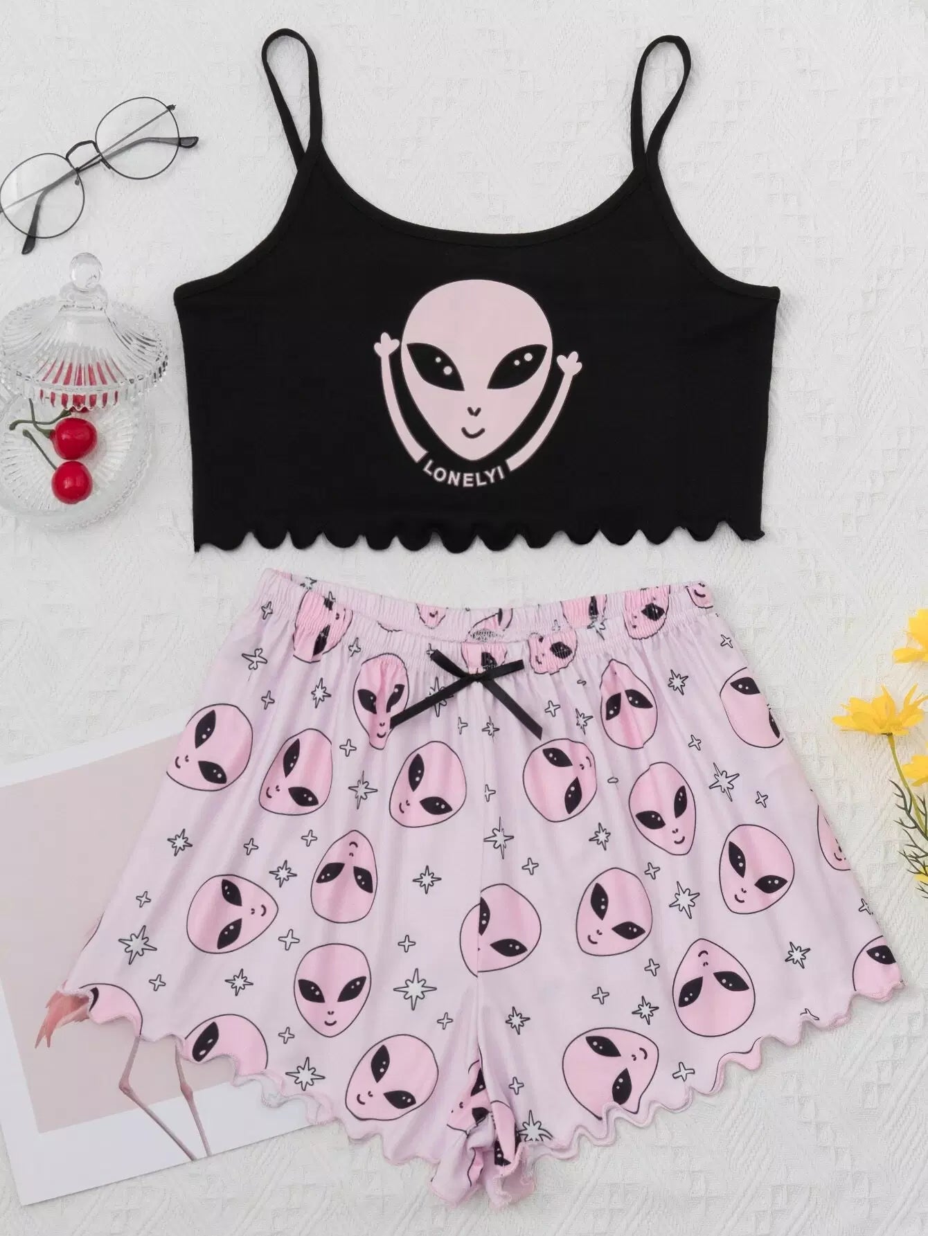 طقم بيجامة من توب كامي وشورت بطبعة حروف وكائنات فضائية مع حواف من الخس