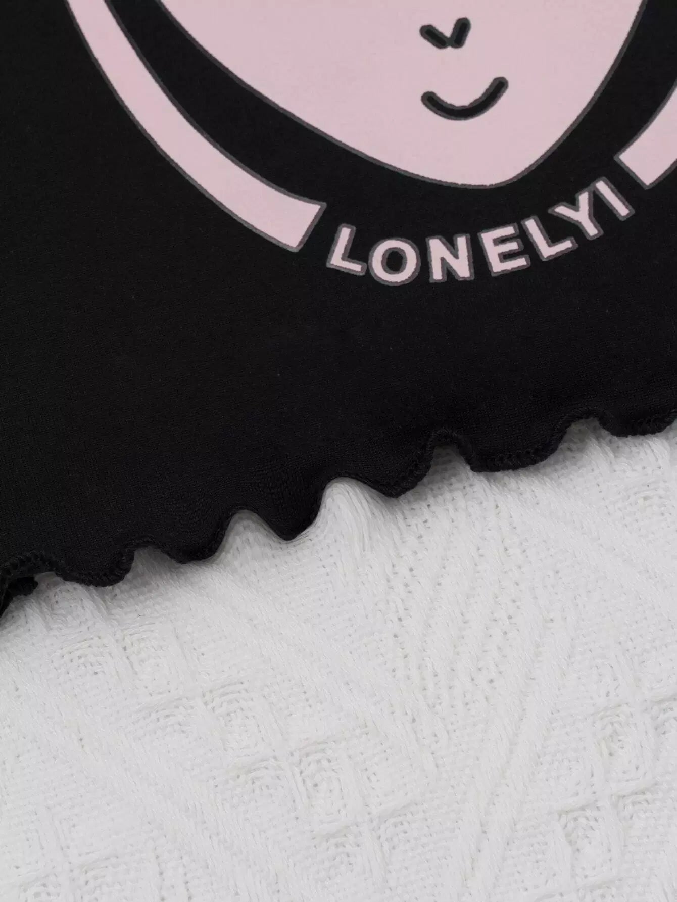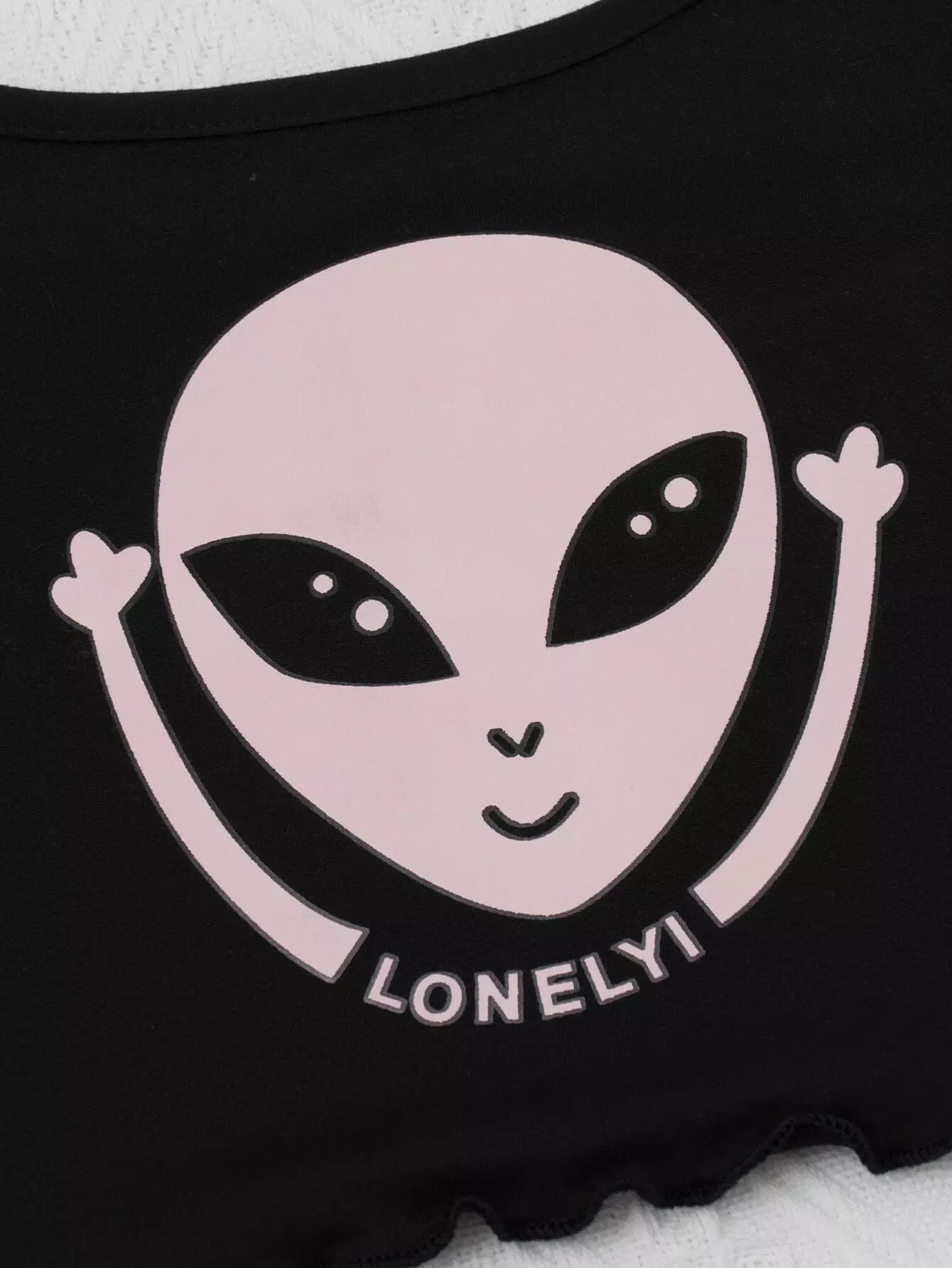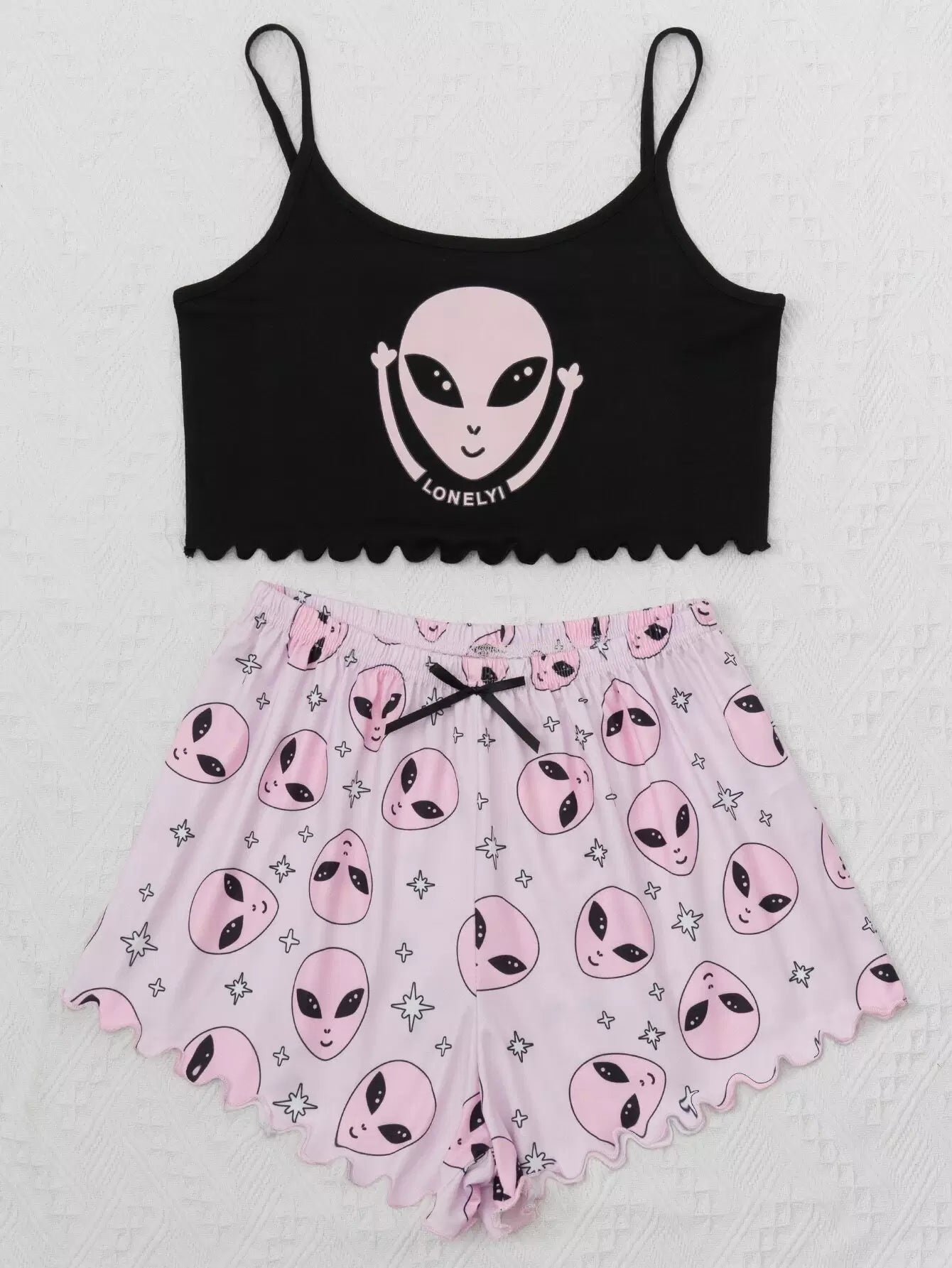 طقم بيجامة من توب كامي وشورت بطبعة حروف وكائنات فضائية مع حواف من الخس