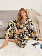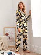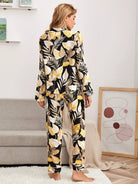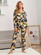 طقم بلوزة وسروال بيجامة بياقة استوائية بفتحة ياقة مشقوقة