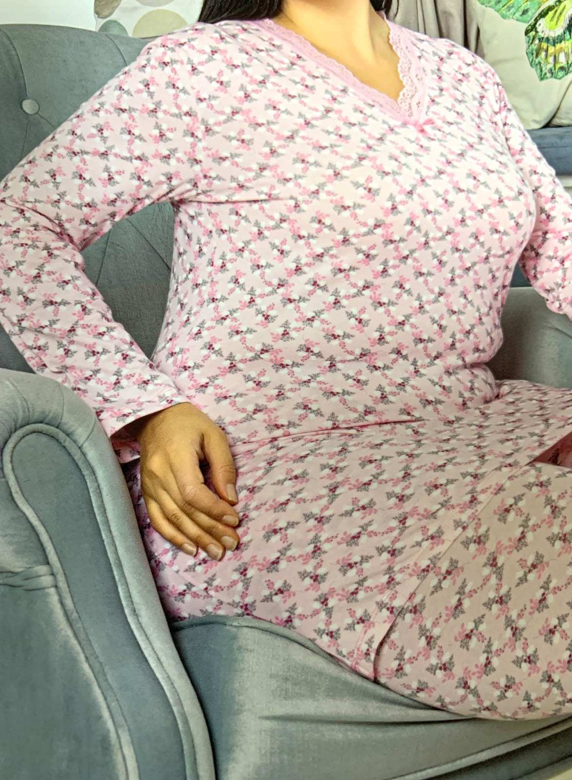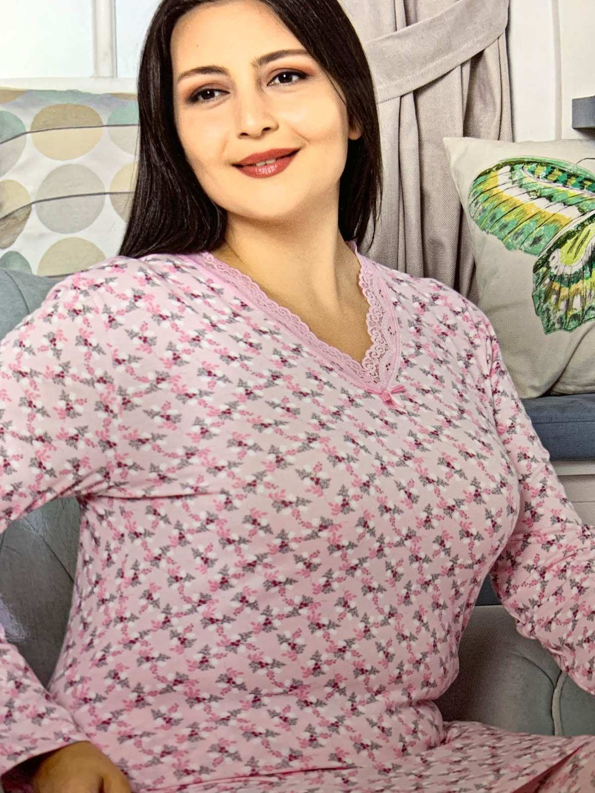 للنساء - بيجامة وردية مع طباعة زهور باللونين الأسود والأحمر