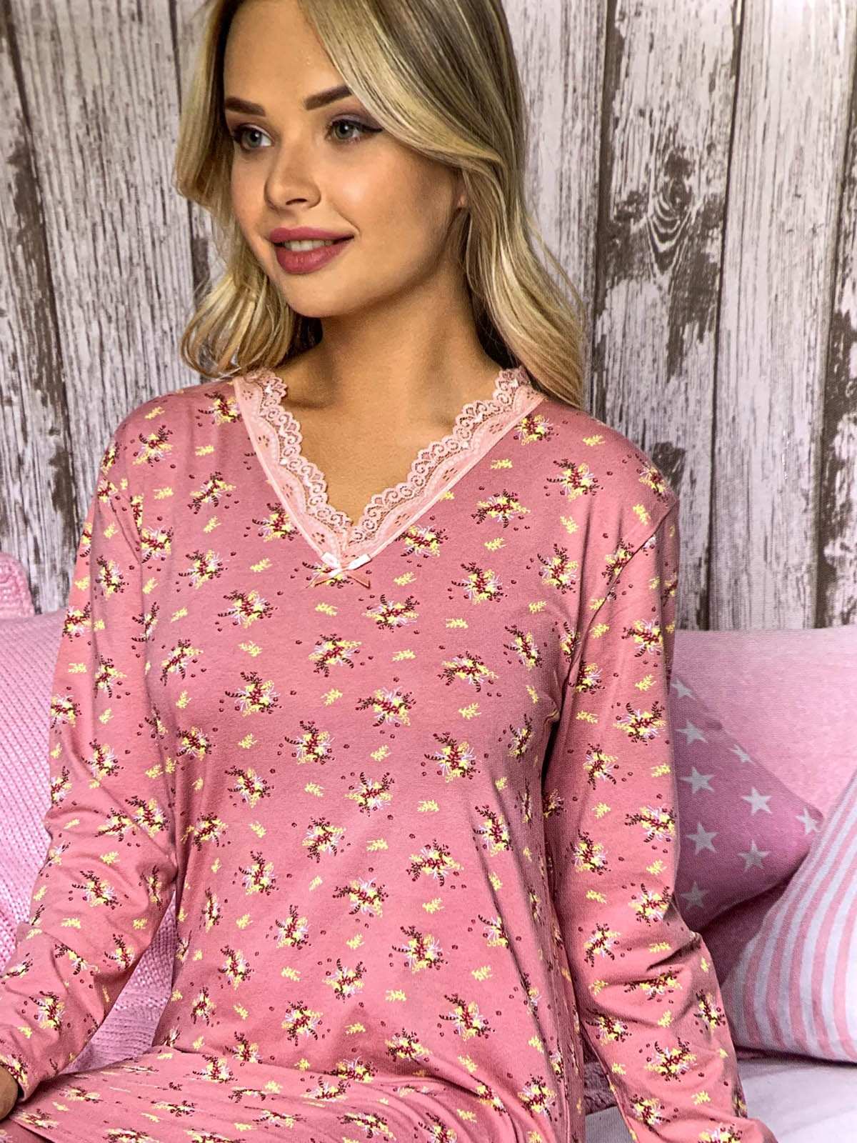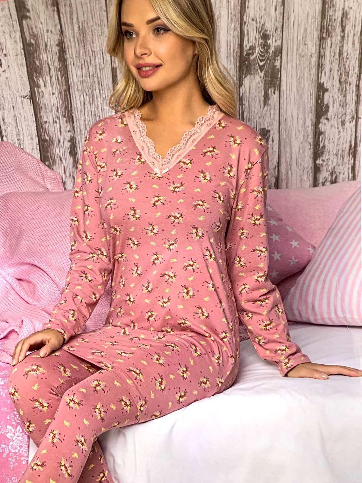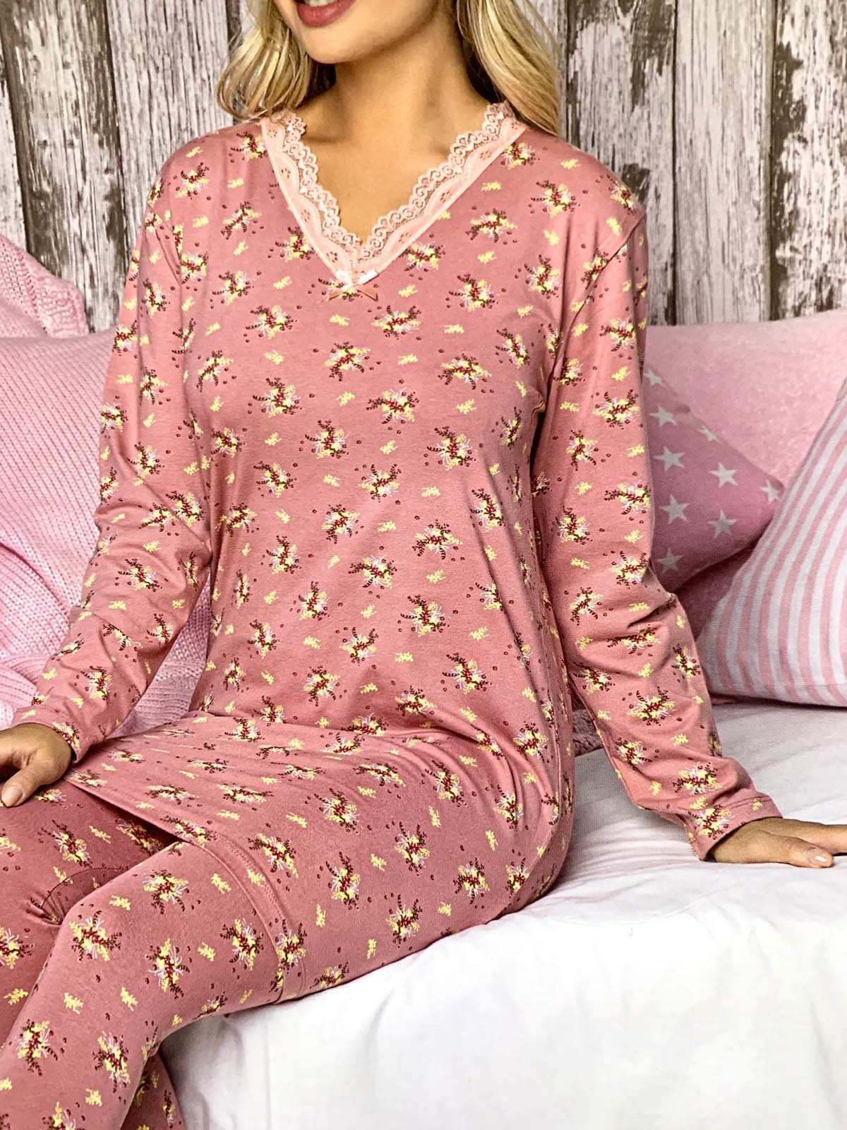 للنساء - بيجامة وردية مع طباعة زهور صفراء وحمراء