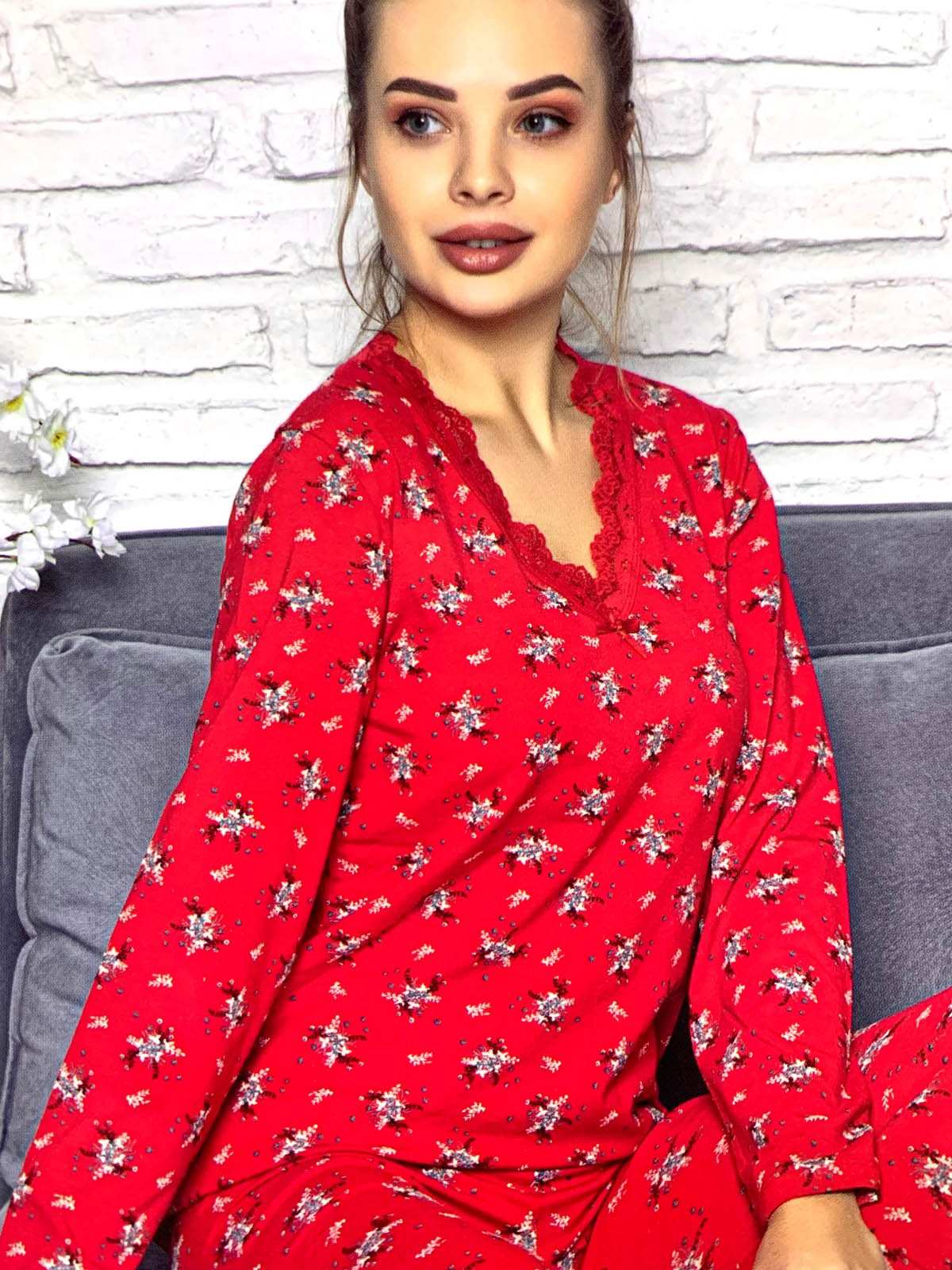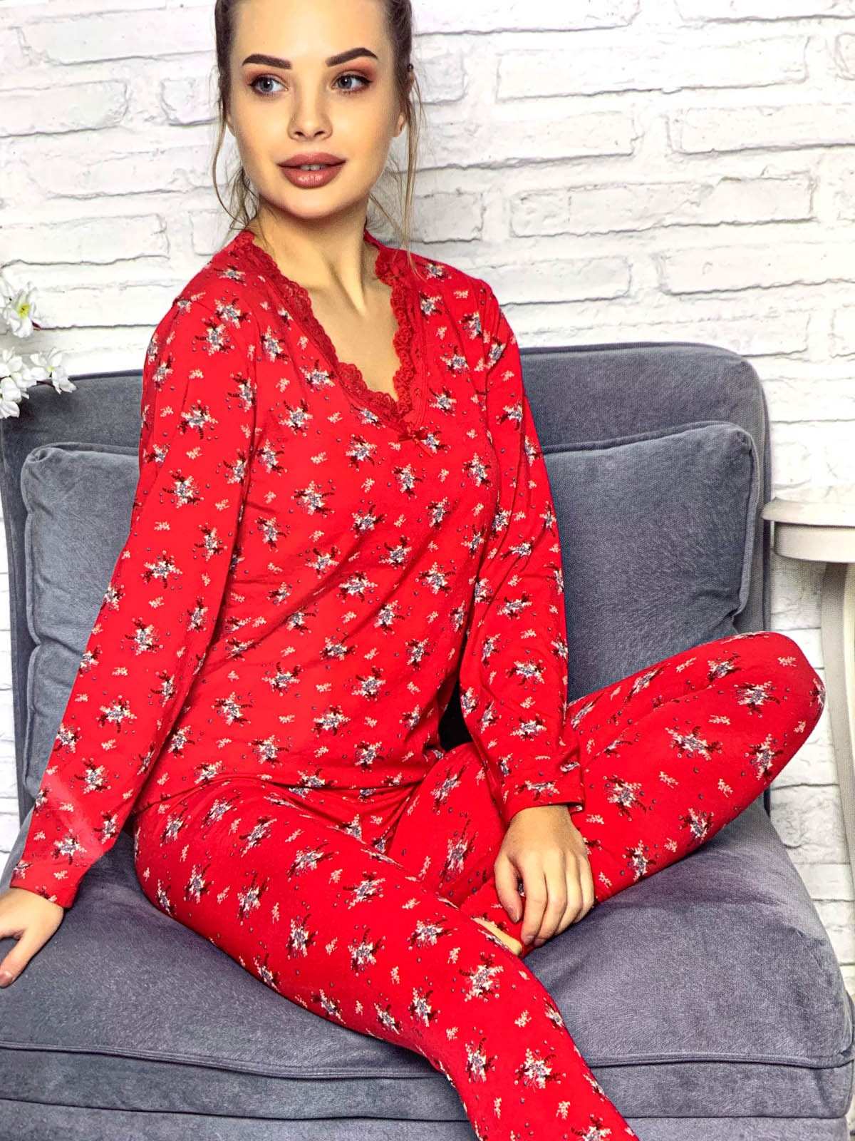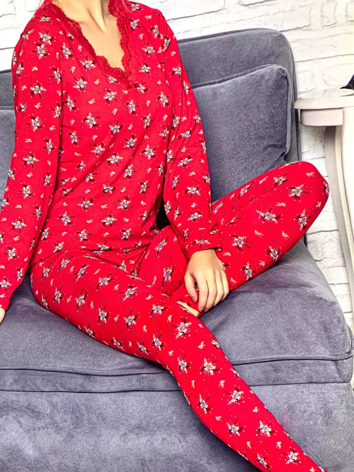 النساء - بيجامة حمراء مع طباعة زهور بيضاء وسوداء
