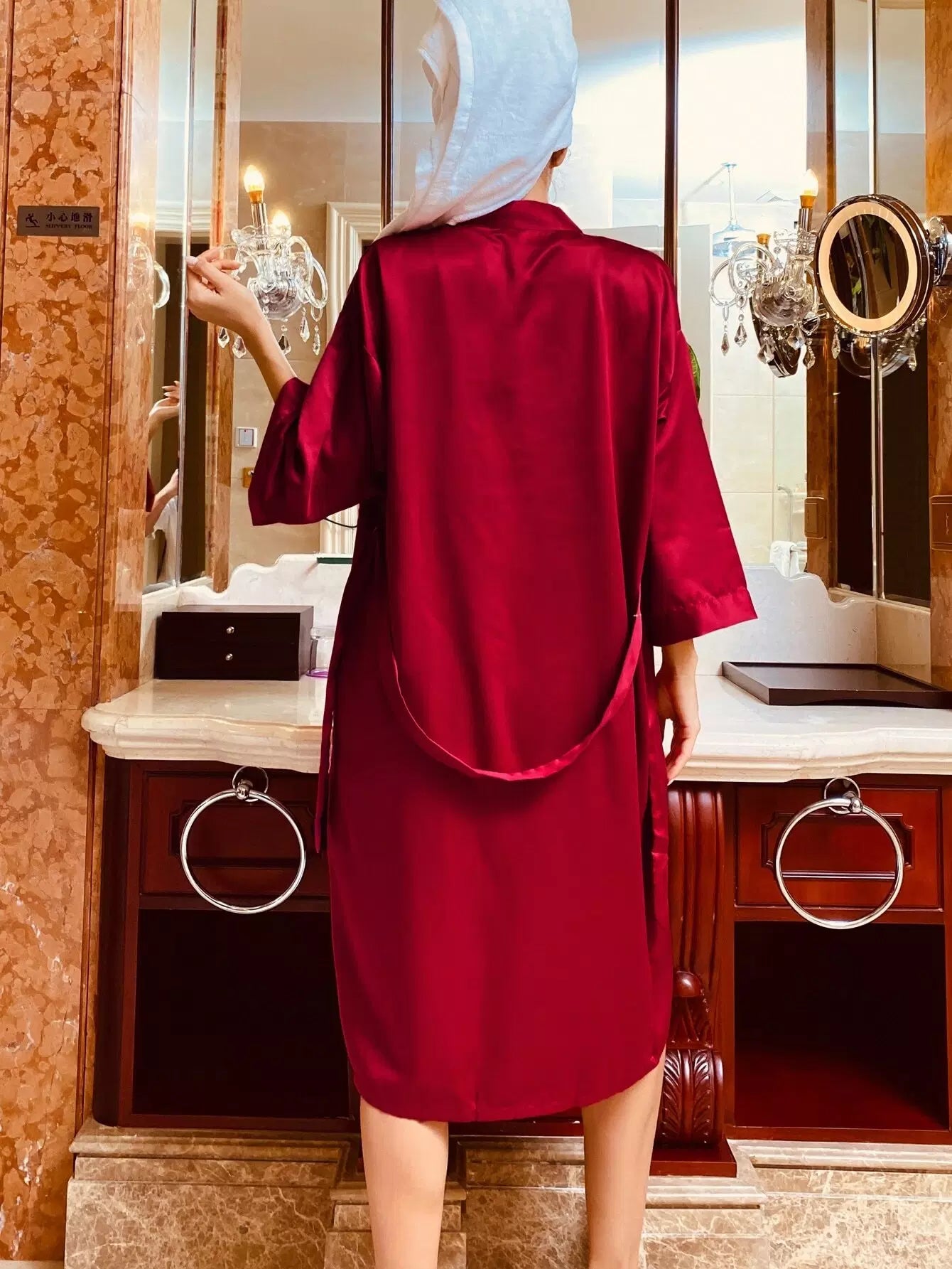 للنساء - فستان نوم كامي بعقدة جانبية من الساتان مع رداء بحزام