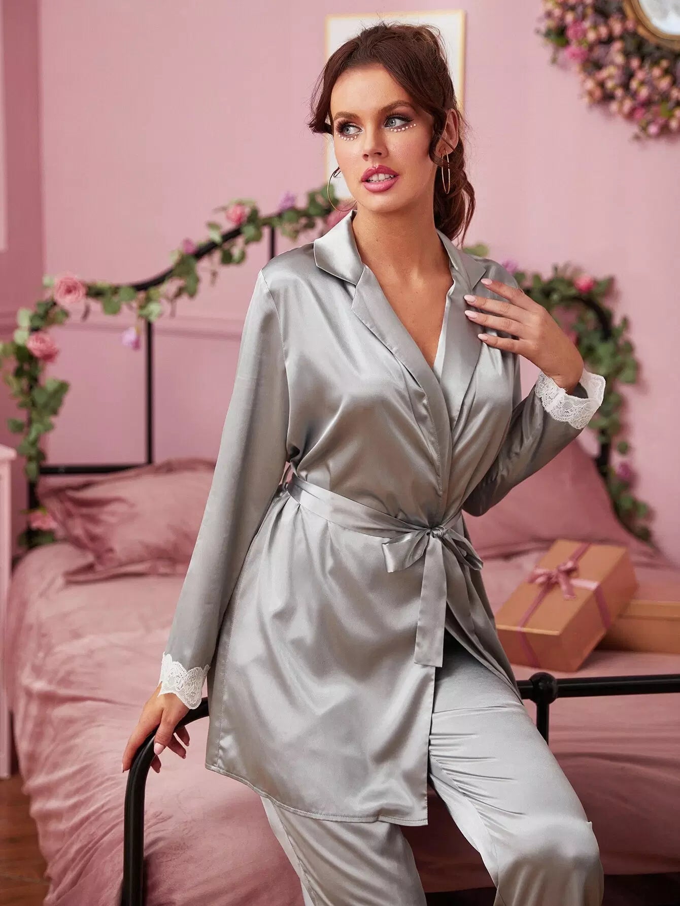 مجموعة الساتان طية صدر السترة الياقة الدانتيل الكفة ليلة دون حزام