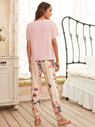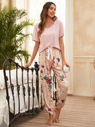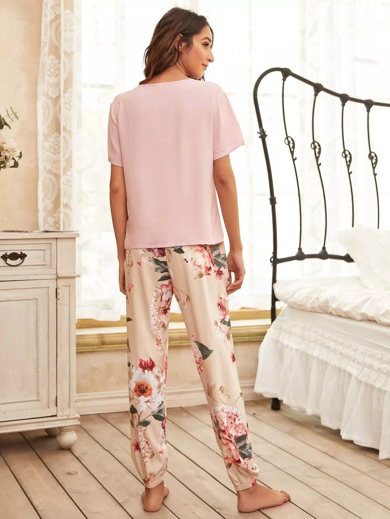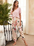 طقم تي شيرت سادة وبنطال بيجامة مزين بعقدة أمامية زهرية
