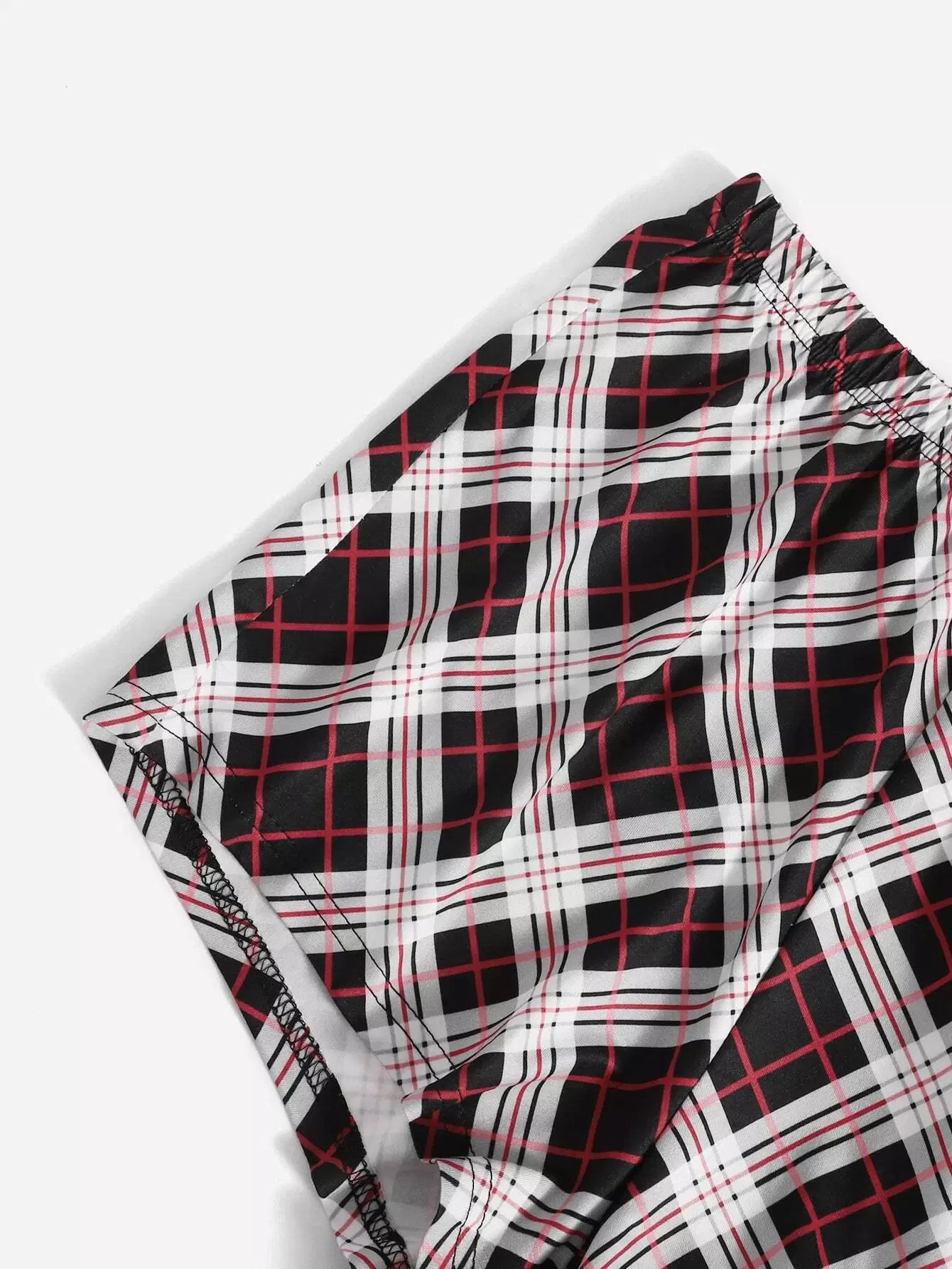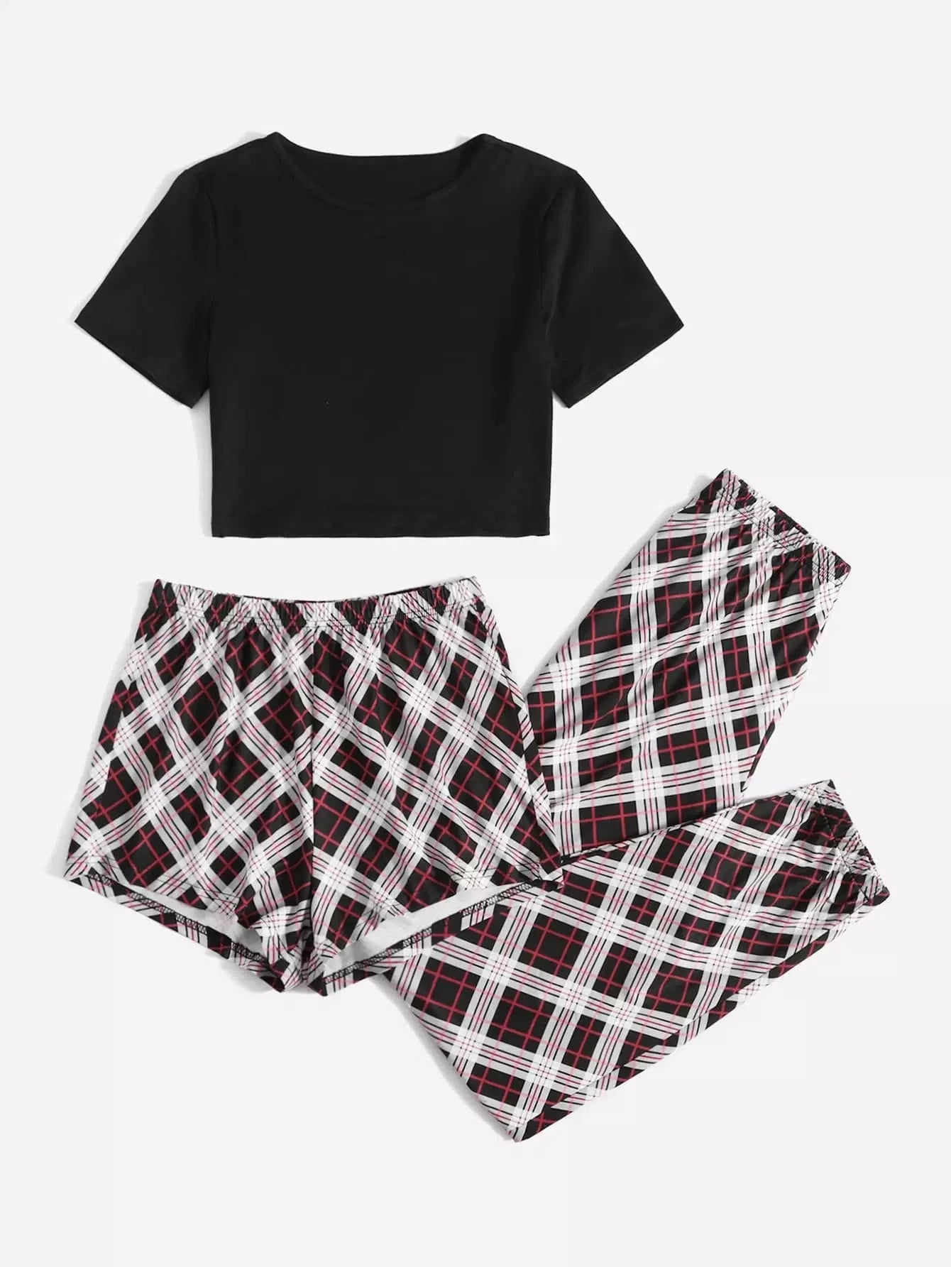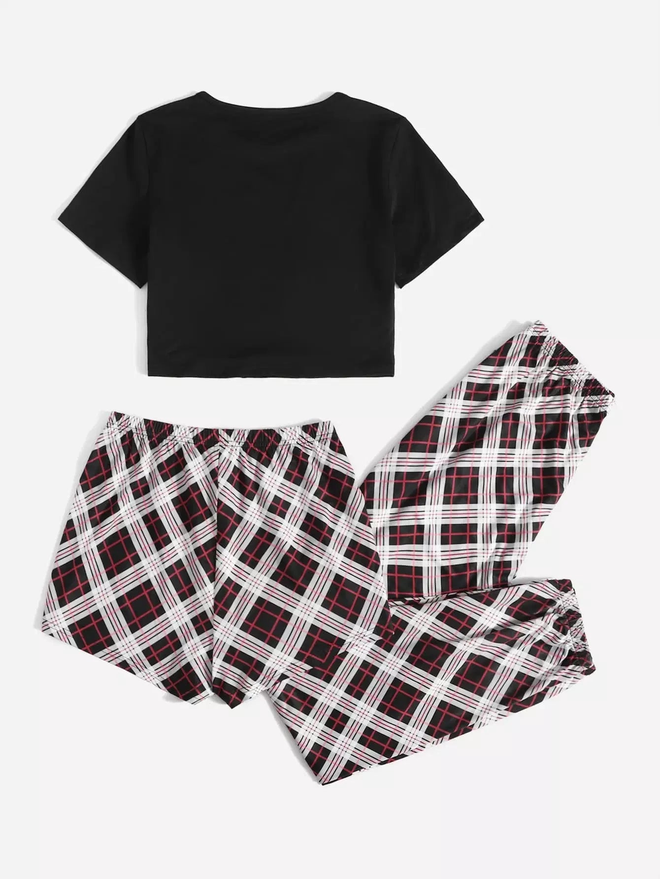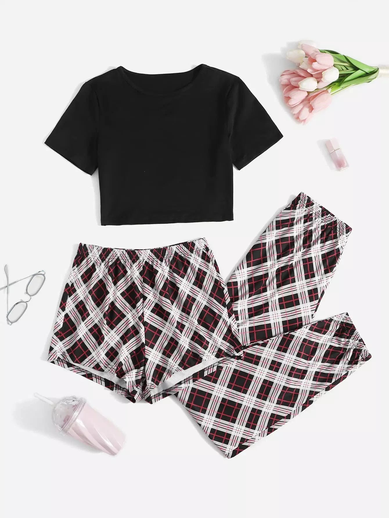 طقم ليلية بقميص سادة وشورت وبنطلون منقوش وبنطلون سادة