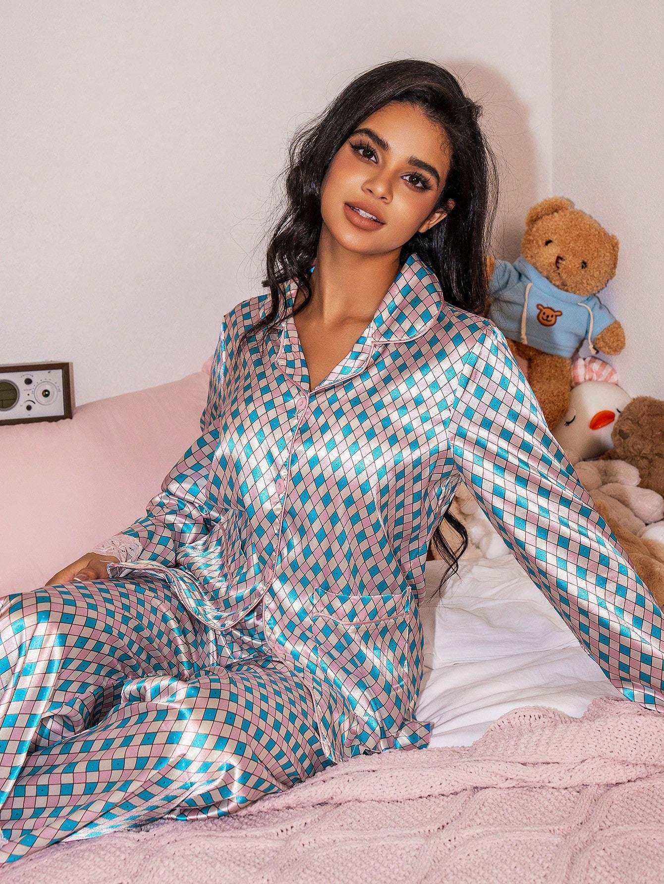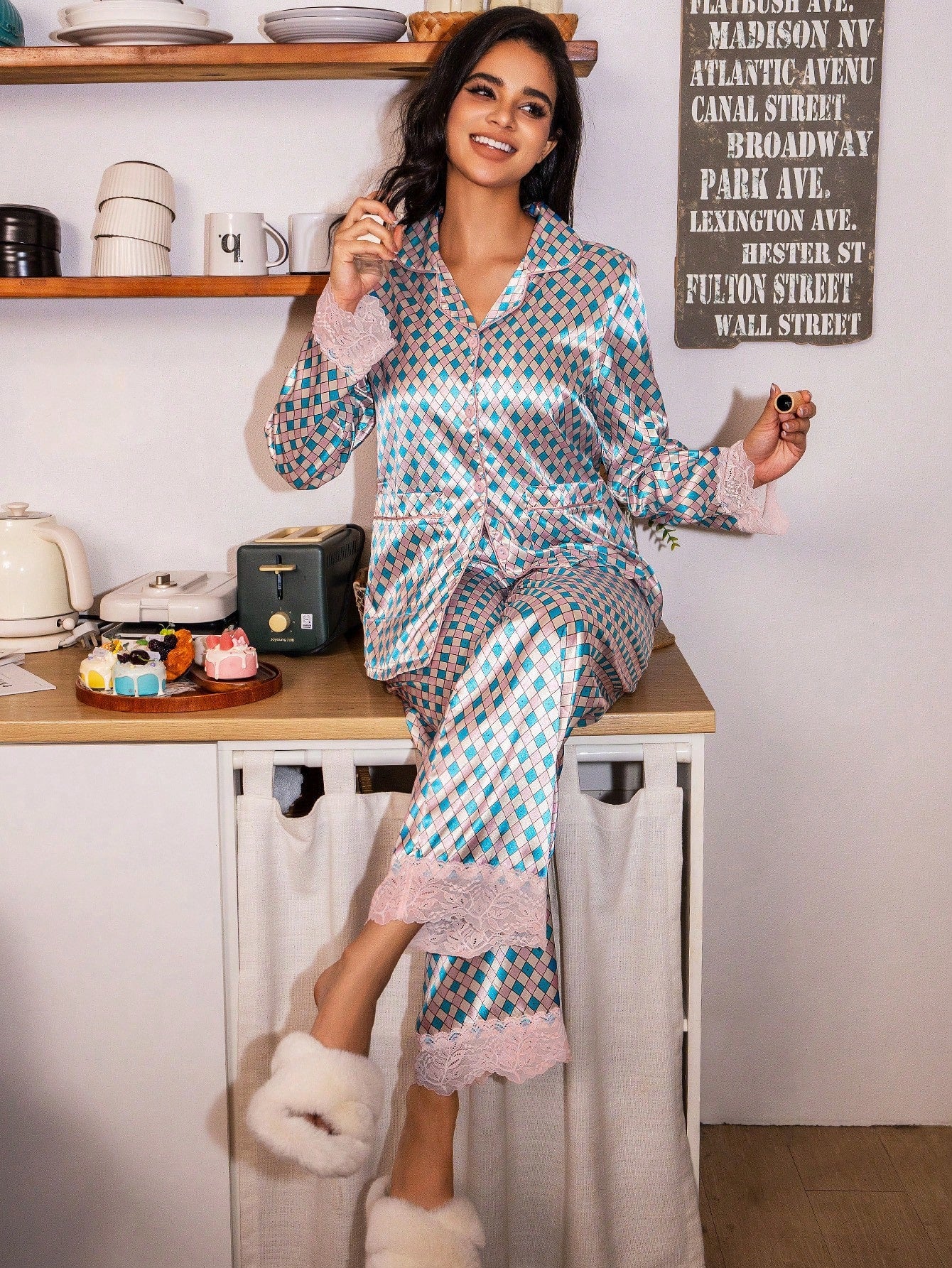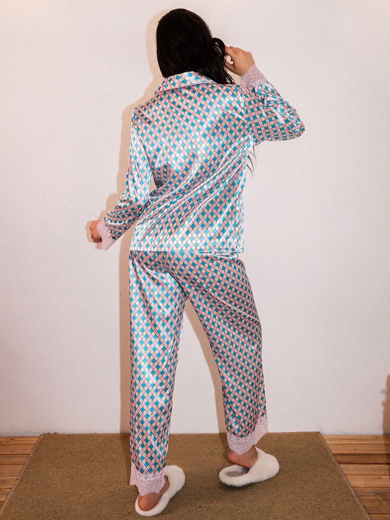 women SweetSlumber Elegant Rhombus Pattern Printed Double Pocket Lace Long Sleeve Top & Pants Pajama Set For Women