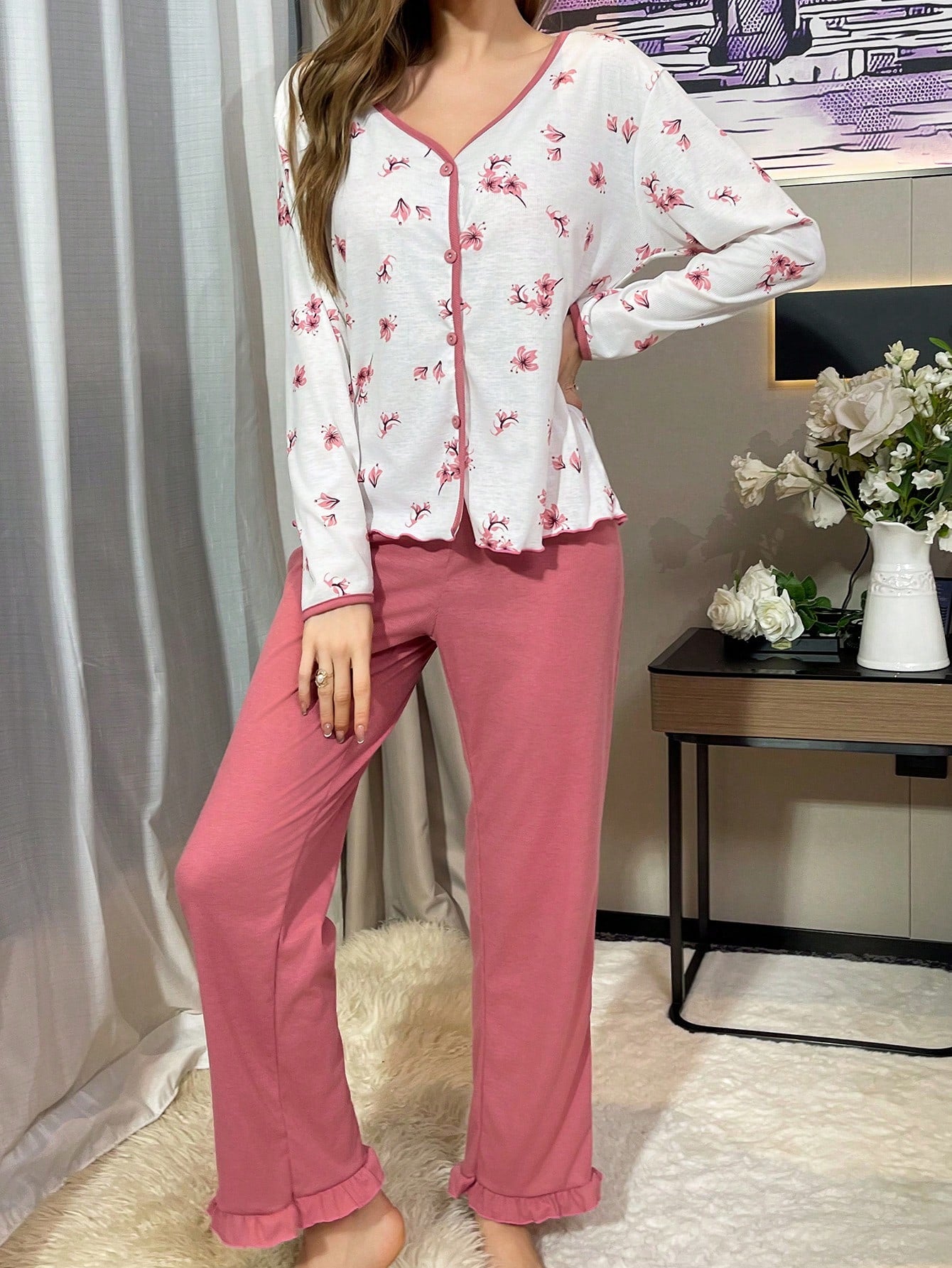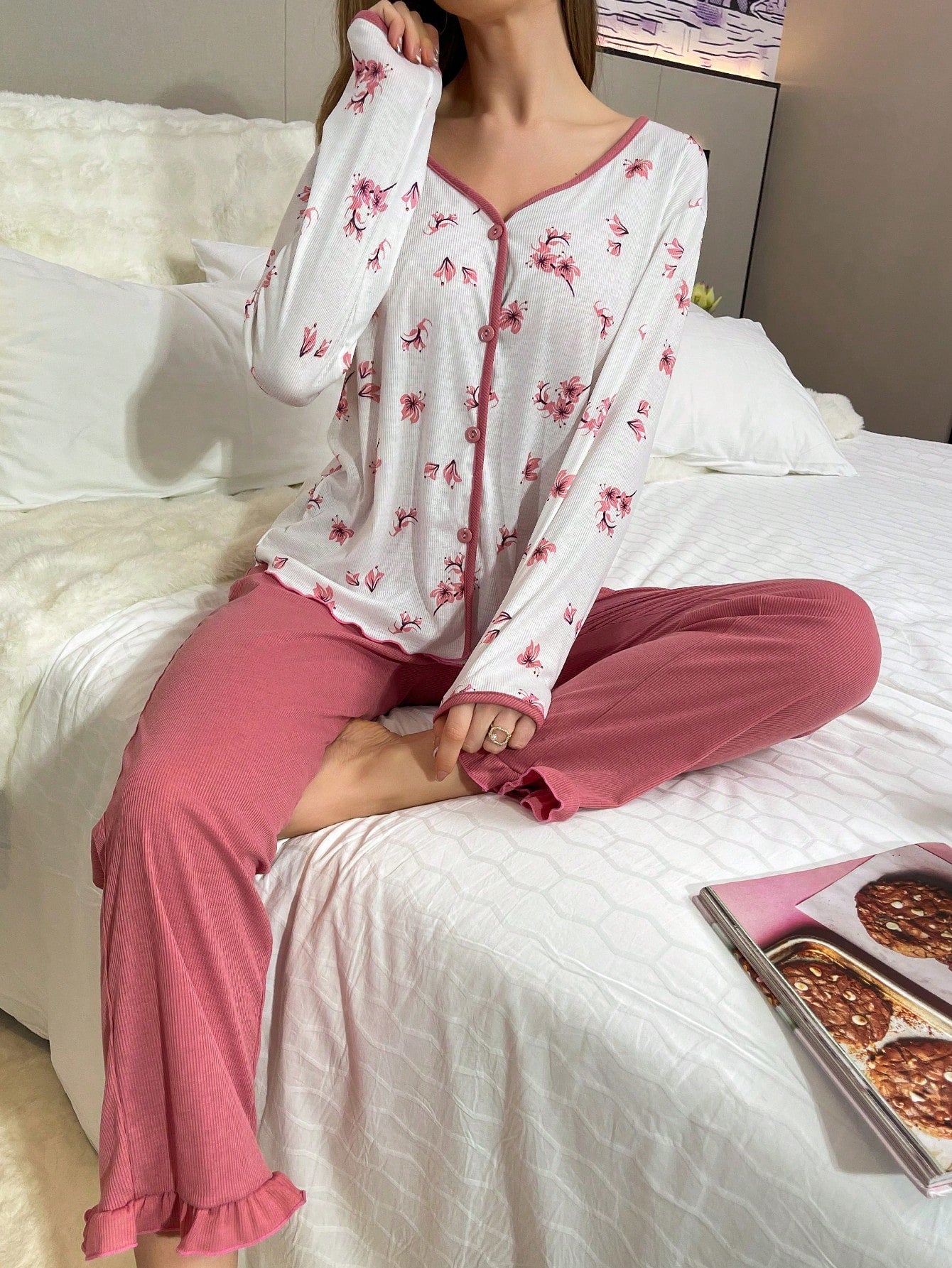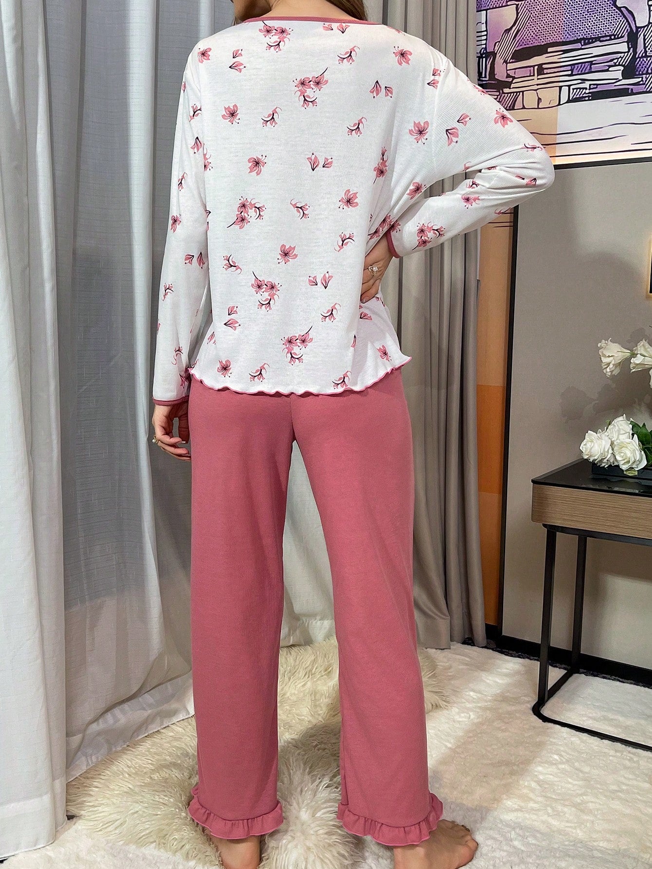 طقم بيجامة نسائي بطبعة زهور مع حواف متباينة، ملابس خريفية